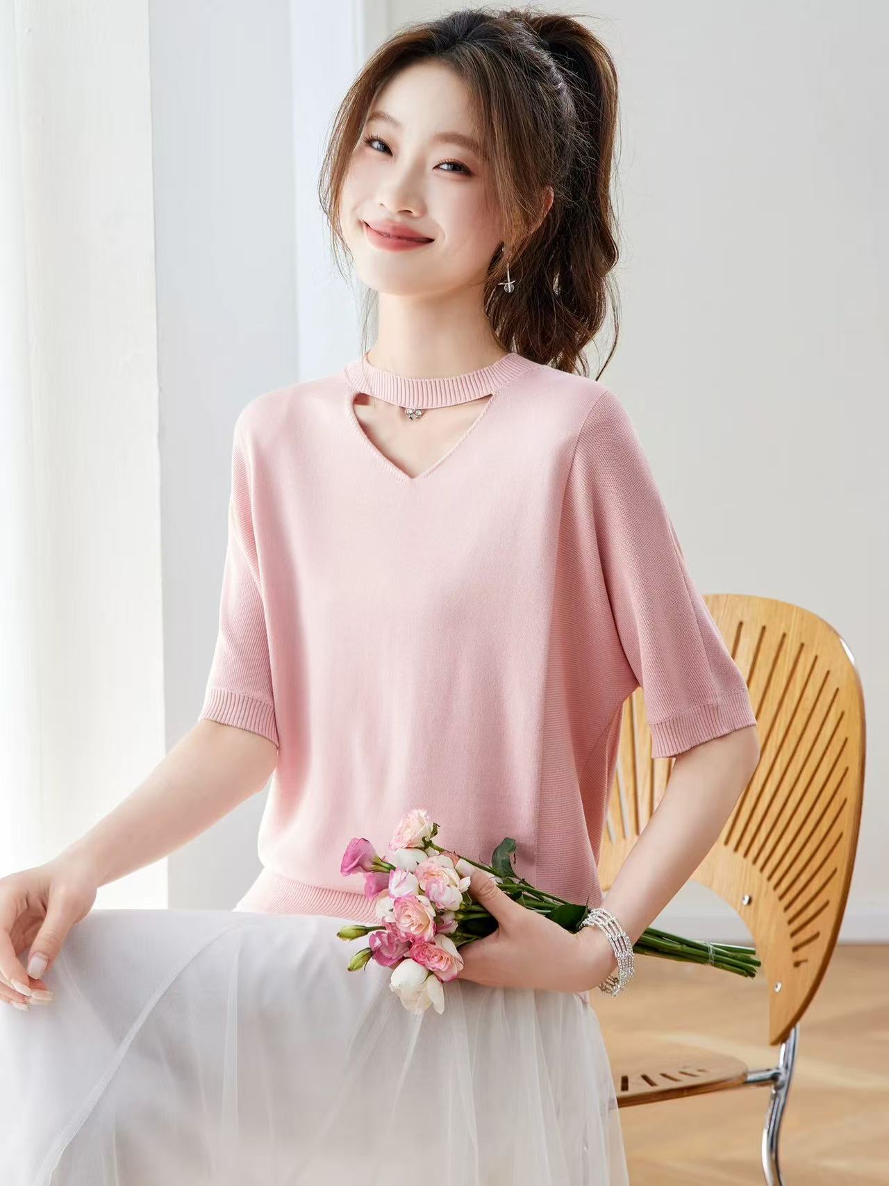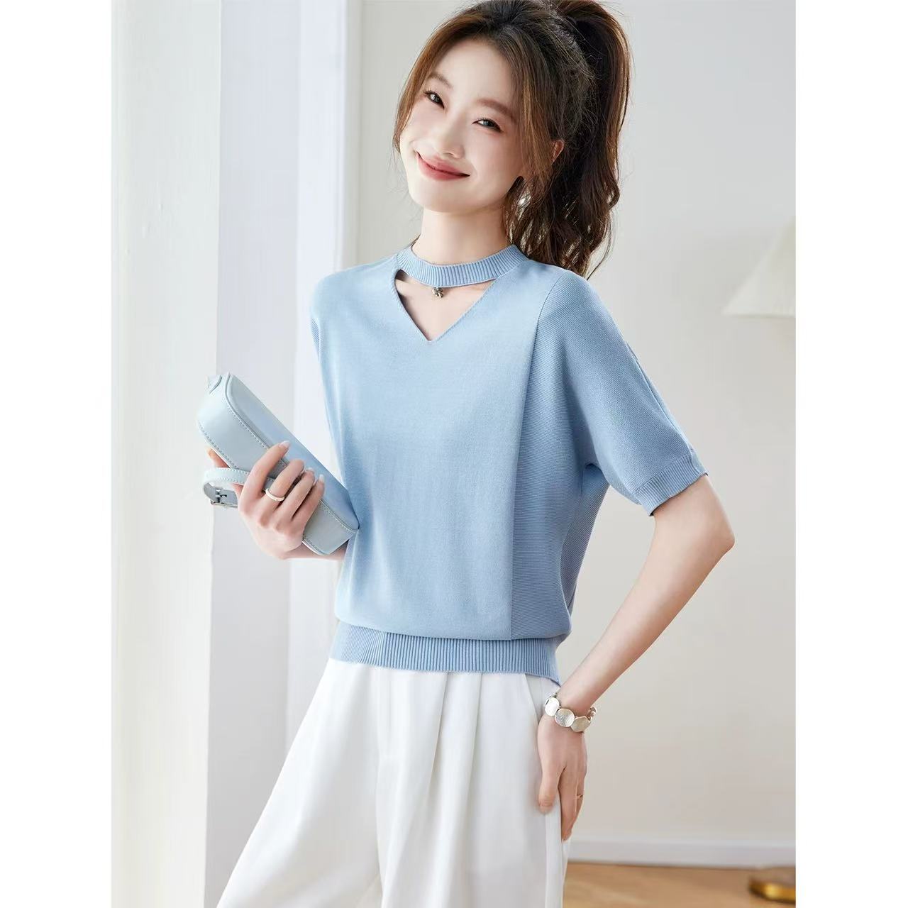검정색 홀로우 아웃 얼음 실크 니트 반팔 티셔츠 여성 여름 고유 한 아름다운 자이언트 잘 생긴 ~ 중 루즈핏 배트윙 소매 맨위