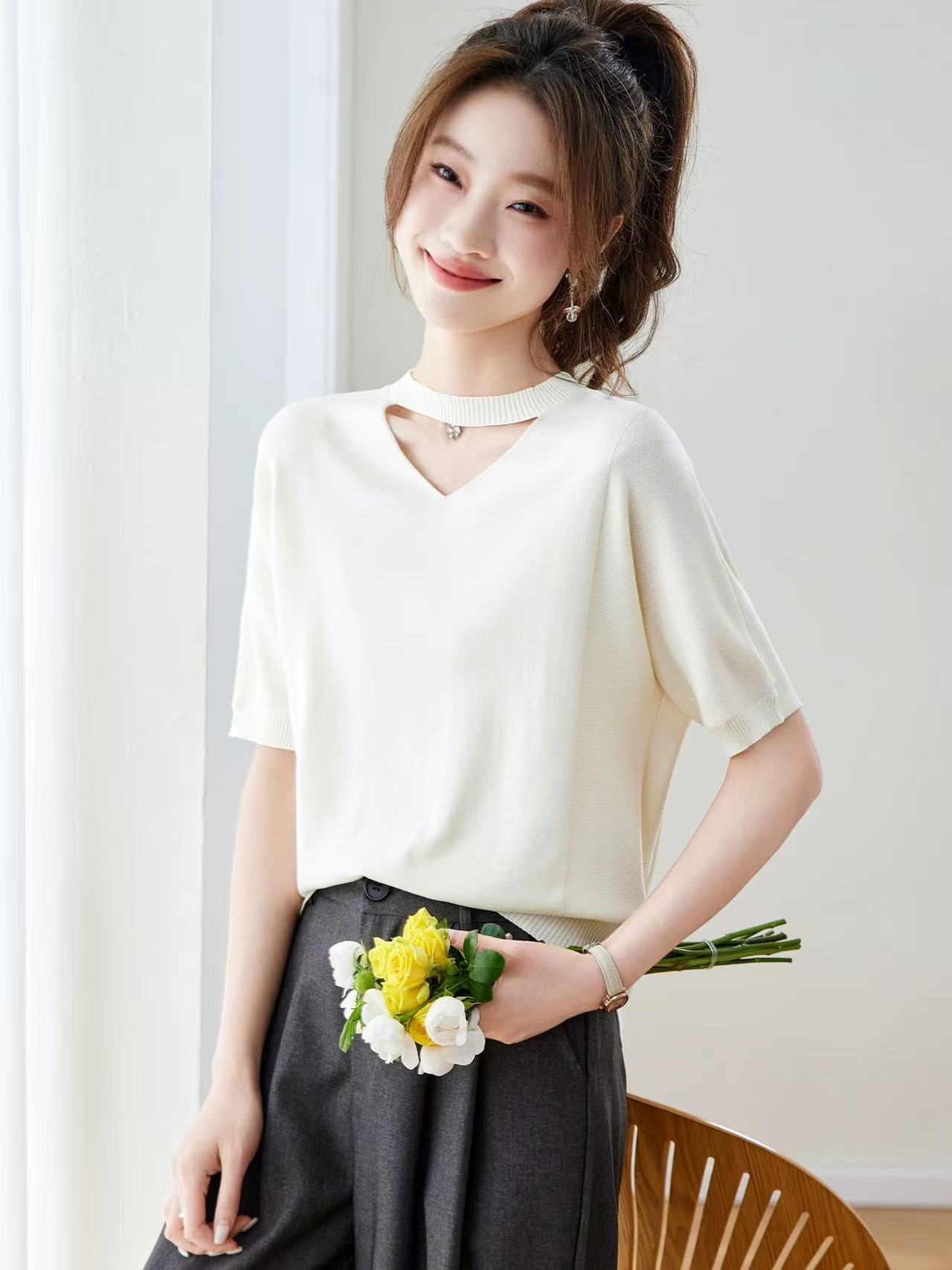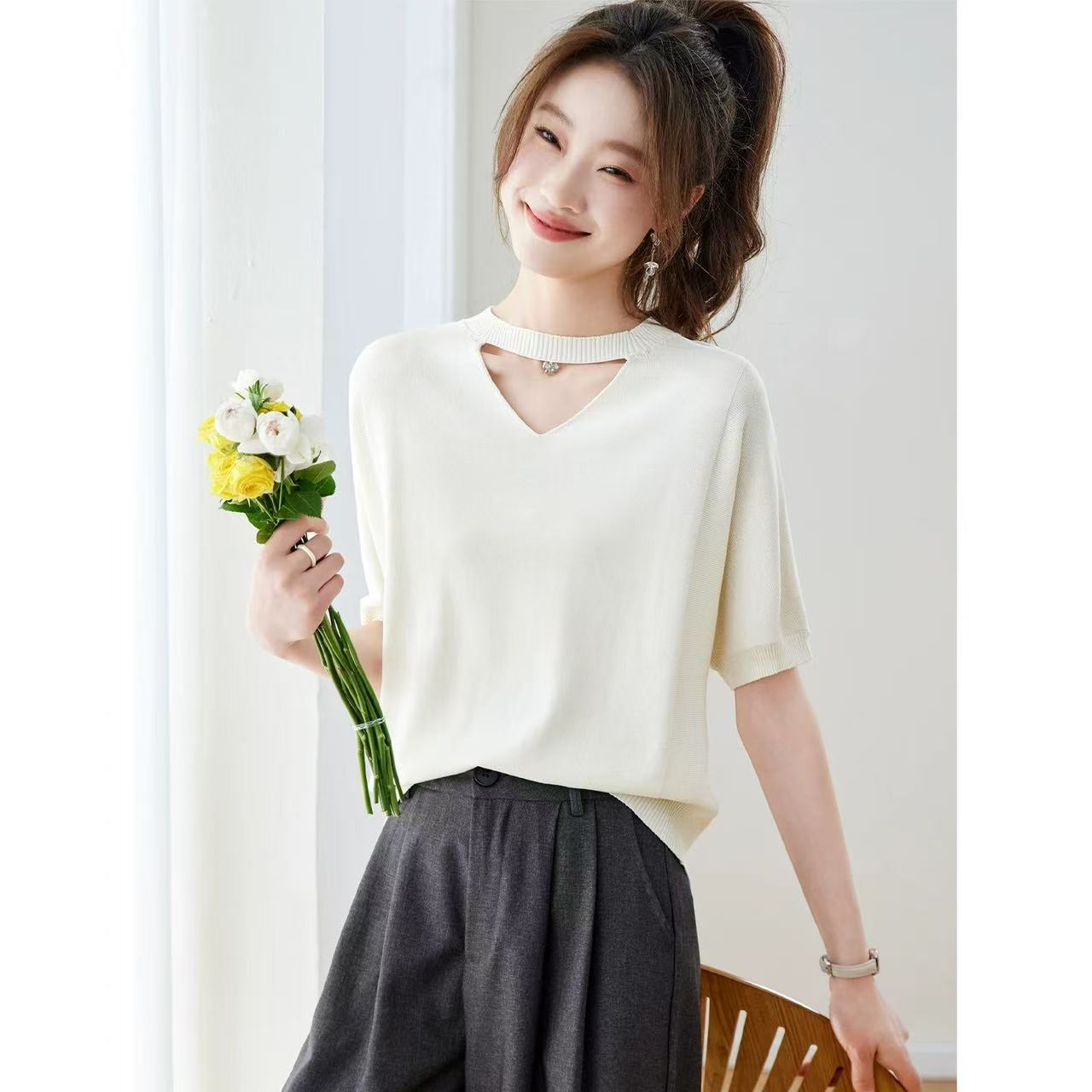 홀로우 아웃 얇은 스타일 POLO 칼라 니트 스웨터 니트 반팔 여성 의류 2026 새로운 여름 몸매 가꾸기 폴로 칼라 쇼트 스타일 맨위