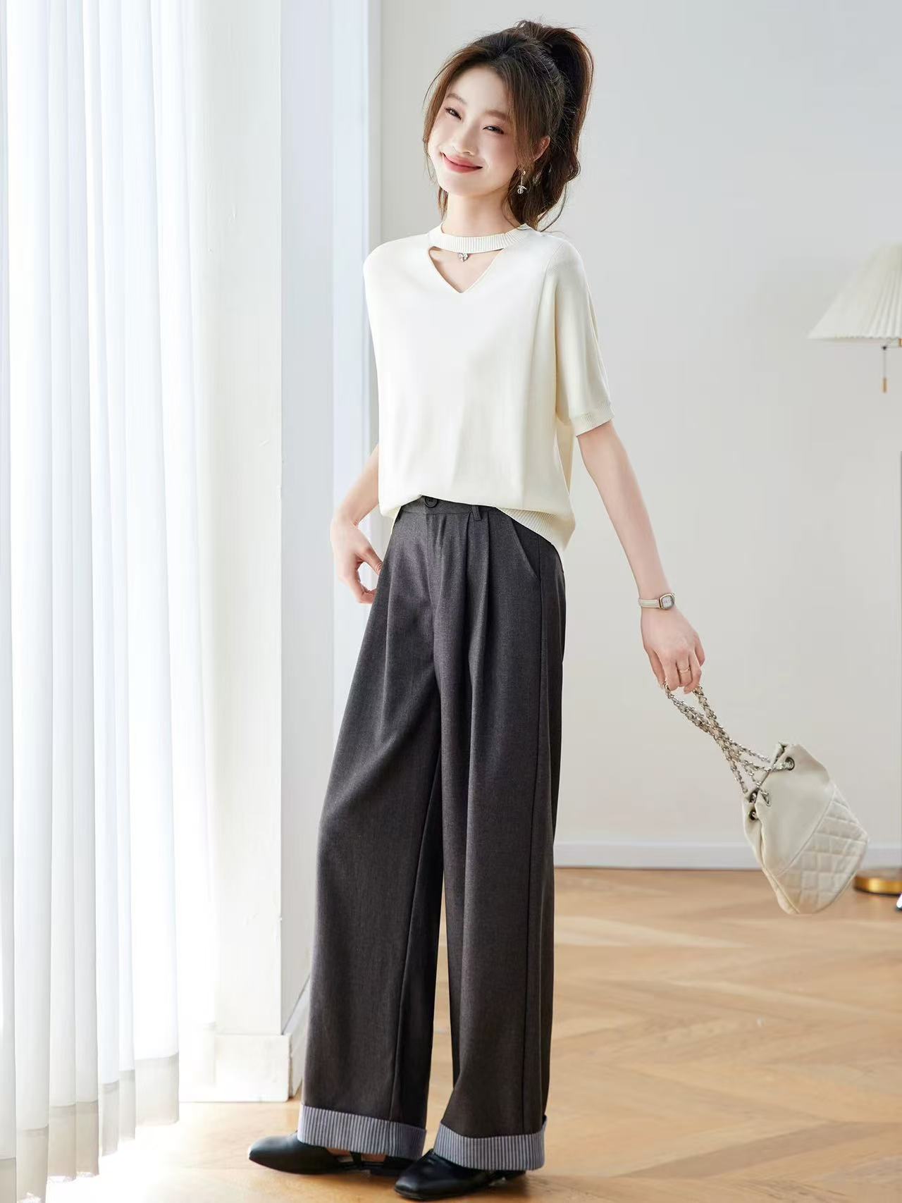 미니멀리즘 바람 회색 반팔 니트 스웨터 2026 여름 몸매 가꾸기 슬림해 보이는 홀로우 아웃 광장 칼라 맨위 얼음 실크 출퇴근 풀오버
