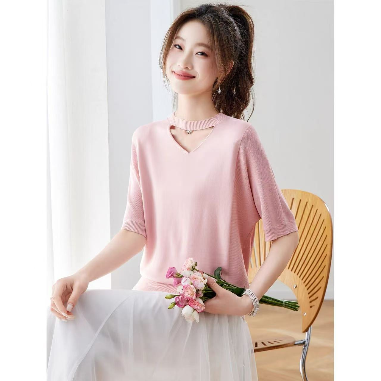 여름 드레스 프랑스식 얇은 스타일 V넥 레이스 레이스 니트 반팔 자카드 맨위 여성 루즈핏 다용도 풀오버 만나는 티셔츠