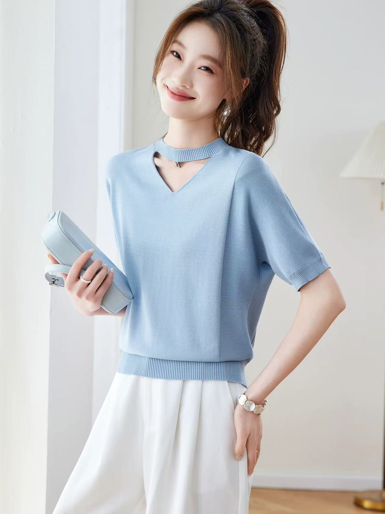 V넥 배색 반팔 티셔츠 여성 여름 2026 새로운 기본 셔츠 외국 가스 빅 사이즈 여성 의류 얼음 실크 니트 맨위