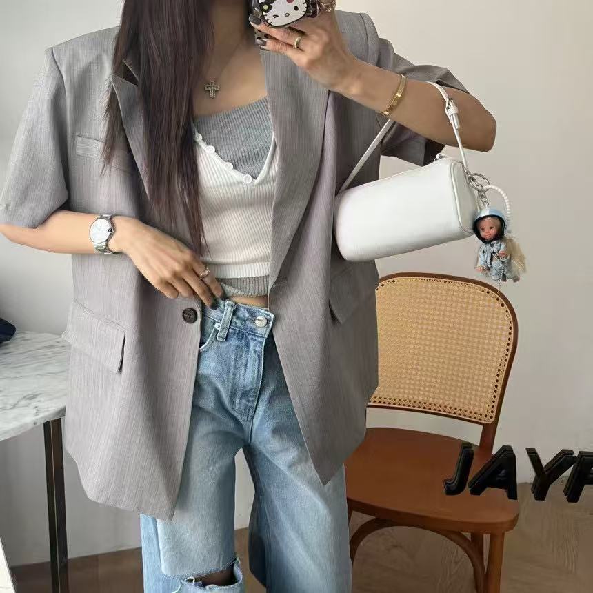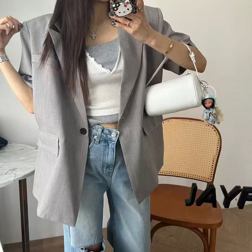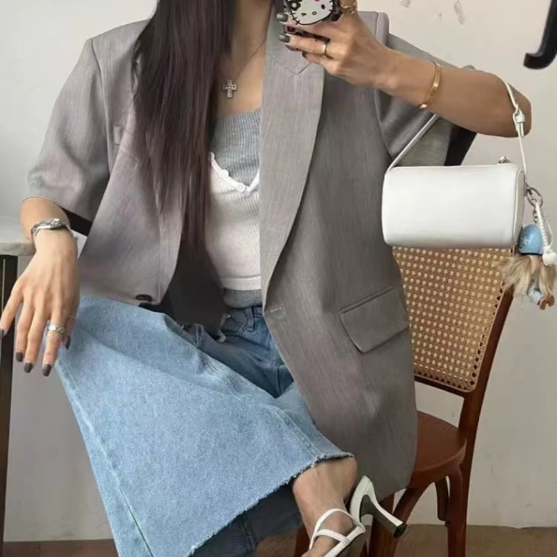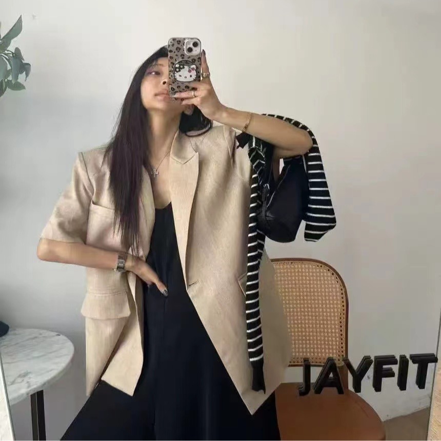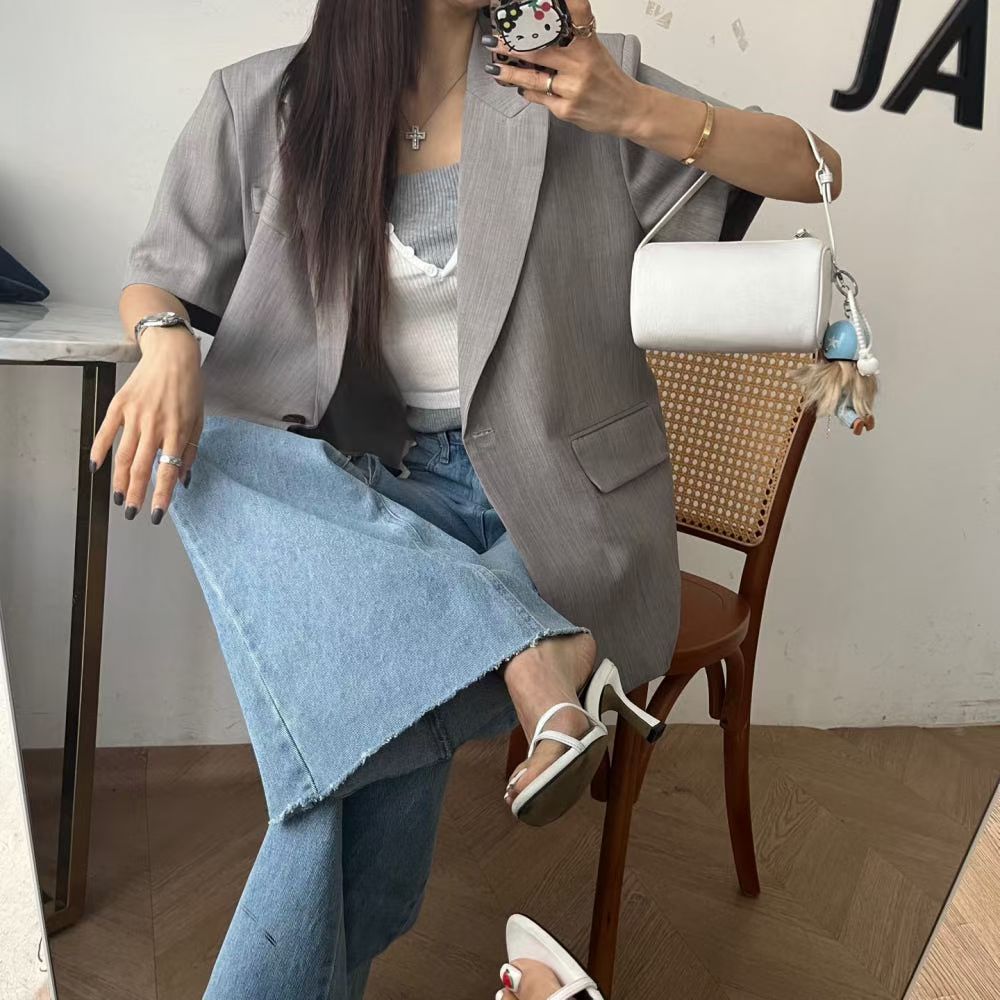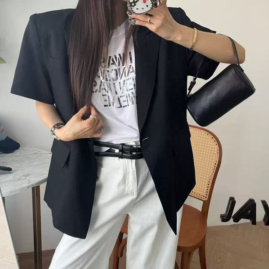 여름 얇은 스타일 인터넷 유명인 패션 품격 중간 길이 캐주얼 반팔 블레이저 정장 여성