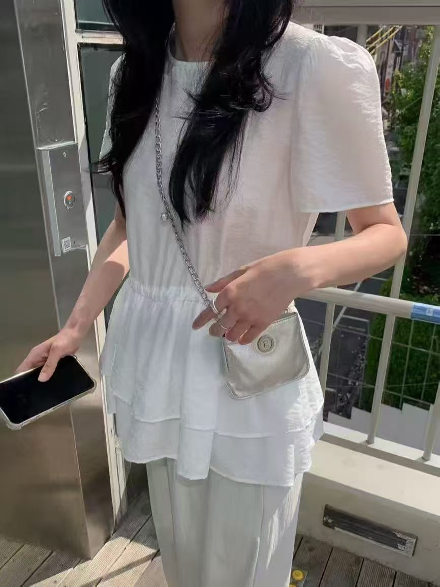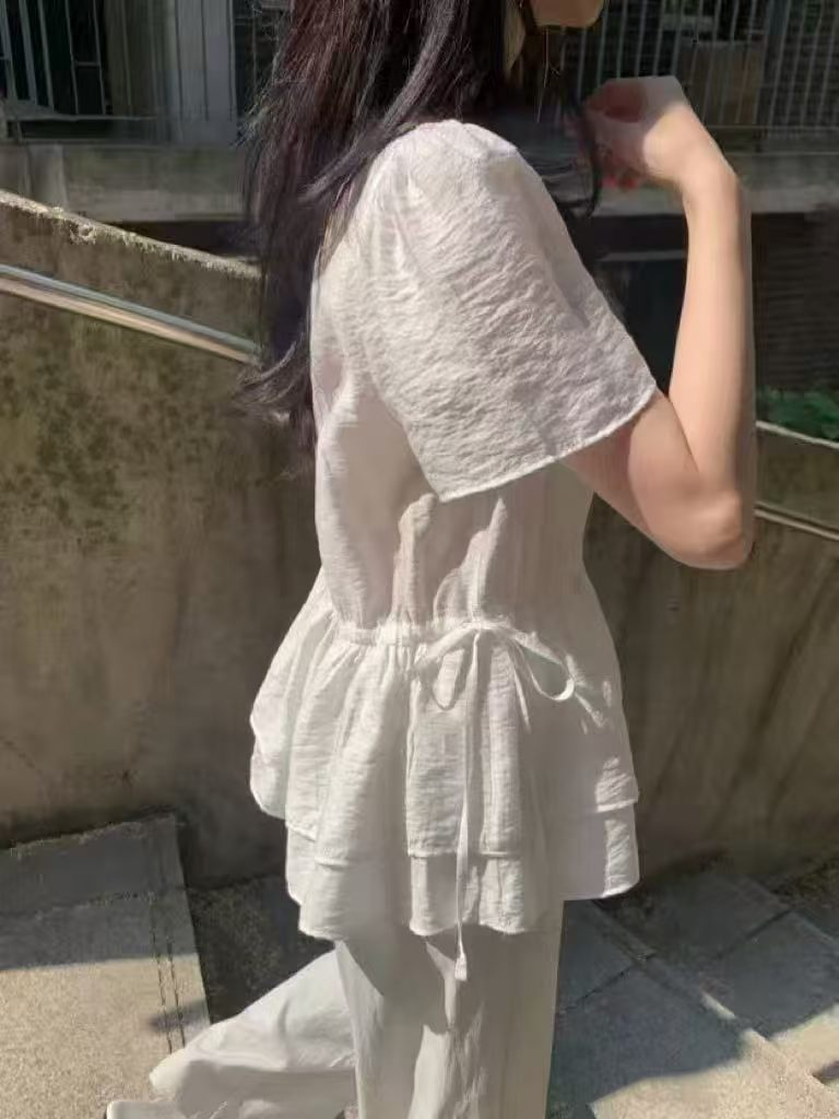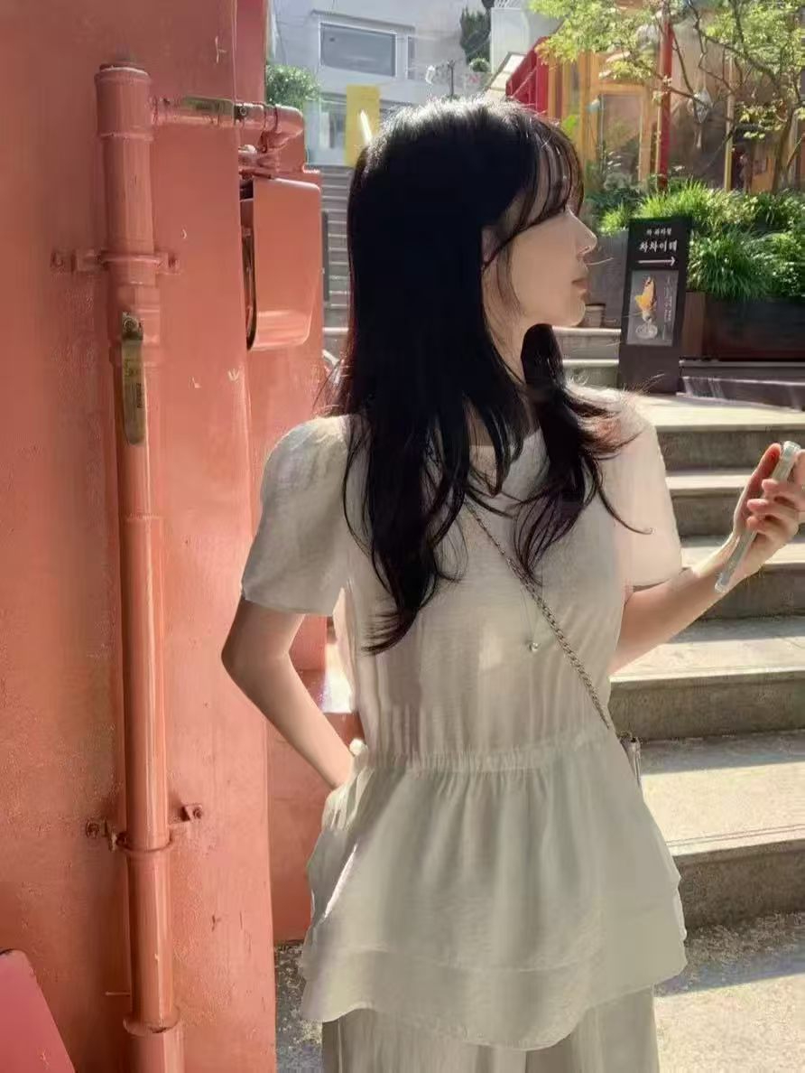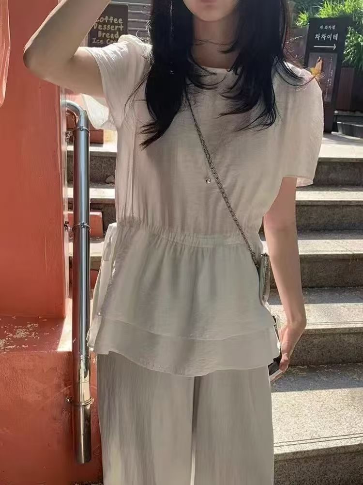 한국 chic 여름 이후 트임 스트랩 반팔 티셔츠 맨위 펌프 로프 넓은 다리가 짧다. 바지 투피스 세트