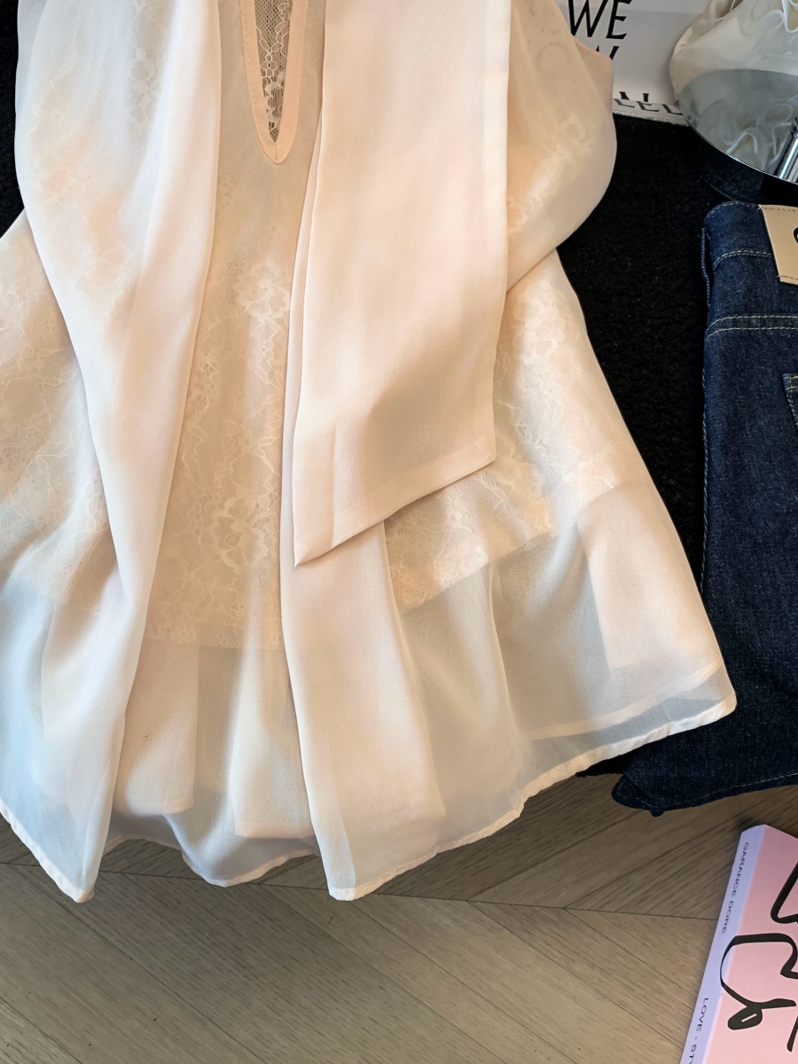 실사 2026 여름 새로운 레이스 셔츠 반팔 홀로우 아웃 허리 수축 품격 V넥 고급 외국 가스 패션 작은 셔츠