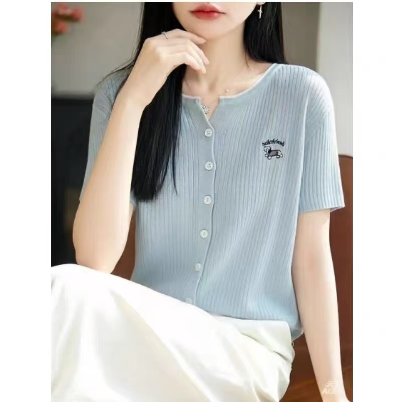 하늘색 POLO 칼라 니트 자수 반팔 티셔츠 여성 2026 새로운 여름 도파민 착용 가져 가라. 품격 맨위