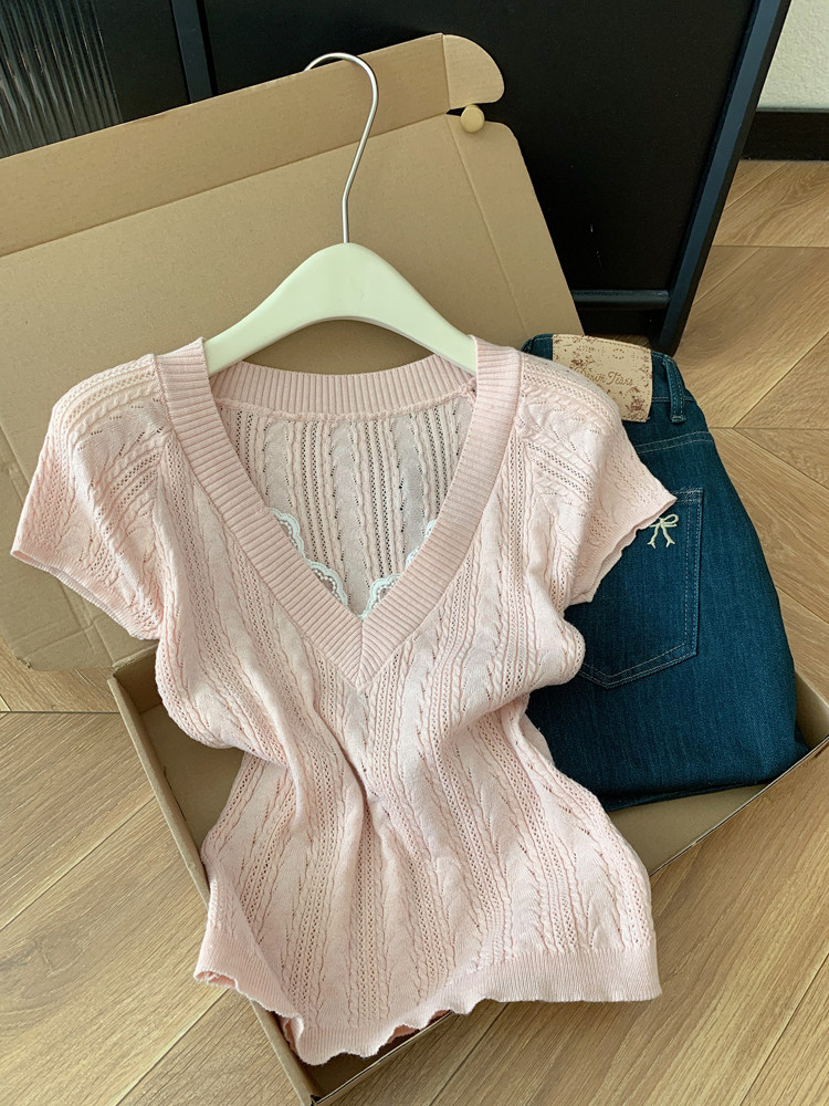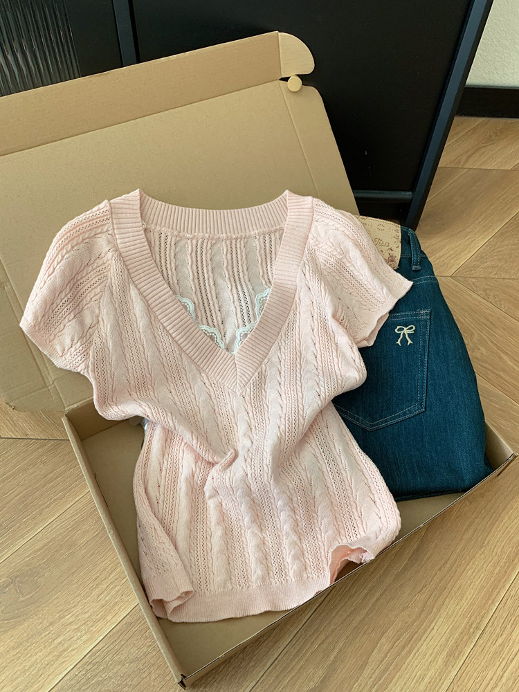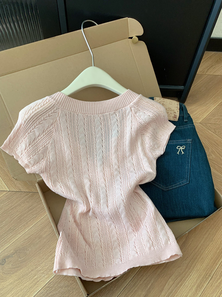 스팽글 홀로우 아웃 외국 가스 니트 스웨터 여성 2026 여름 새로운 반팔 티셔츠 패션 디자인 센스 작은 대중 짧은 맨위