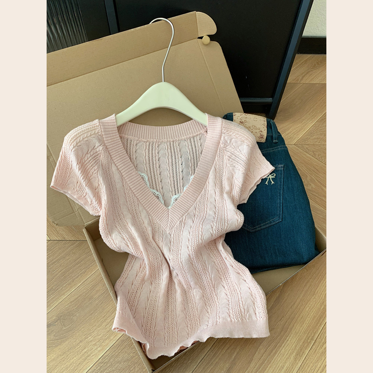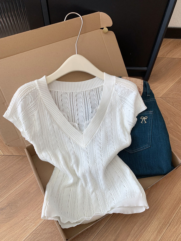 톰 글 래 원인 블루 홀로우 아웃 V넥 반팔 니트 오픈 가디건 여성 2026 여름 고유 한 아름다운 Chic 고급 센스 맨위