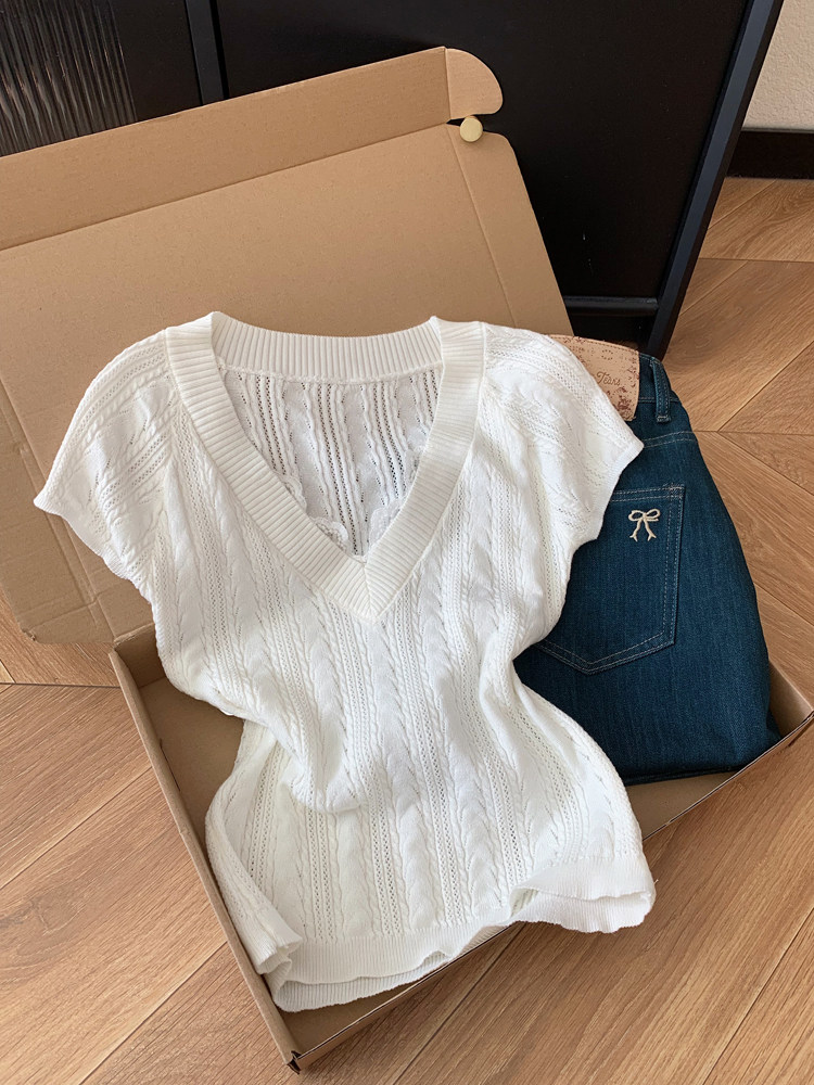 V넥 얼음 마 실크 반팔 티셔츠 여성 여름 2026 새로운 루즈핏 슬림해 보이는 얇은 스타일 품격 연령 감소 니트 스웨터 맨위