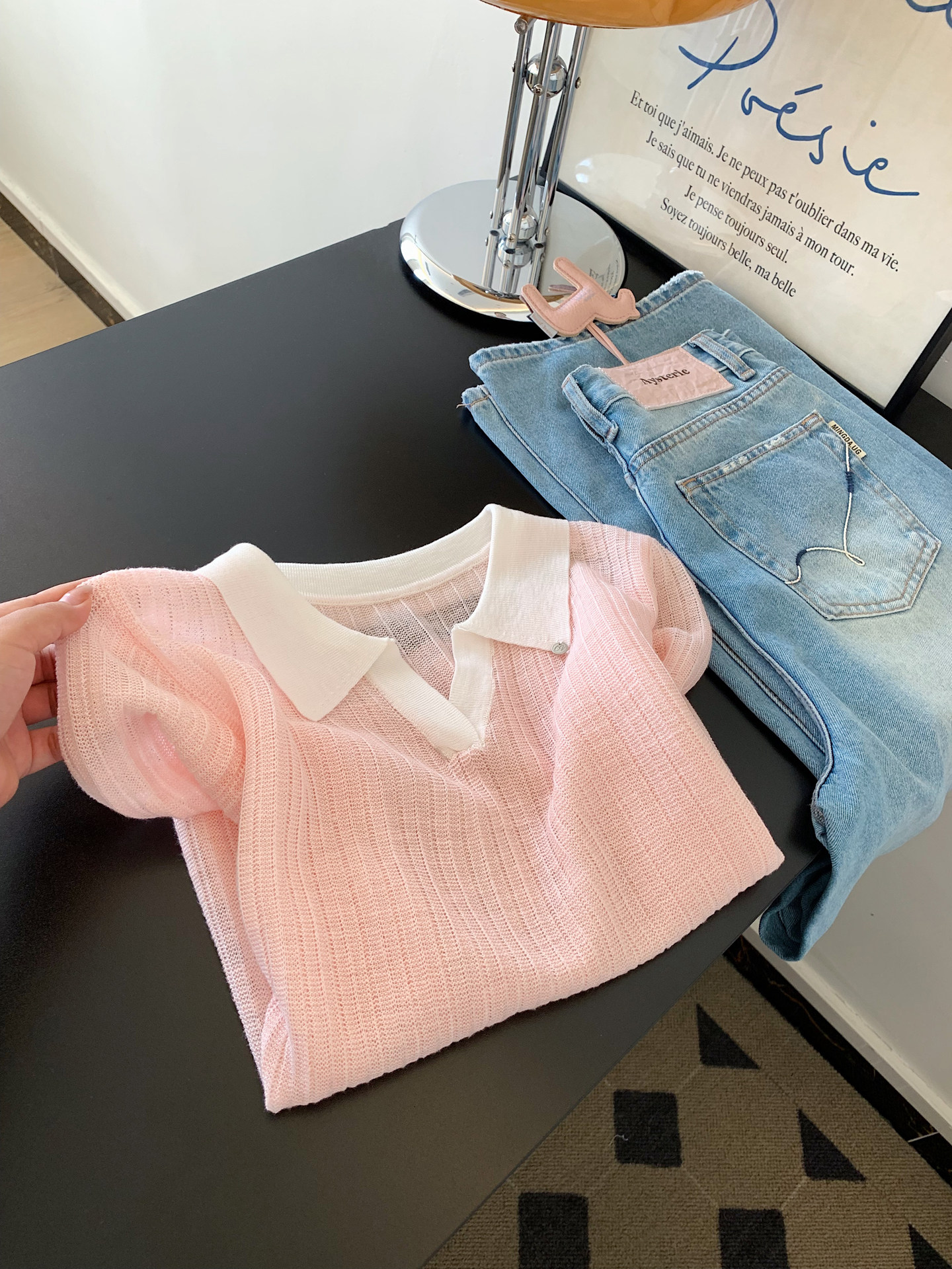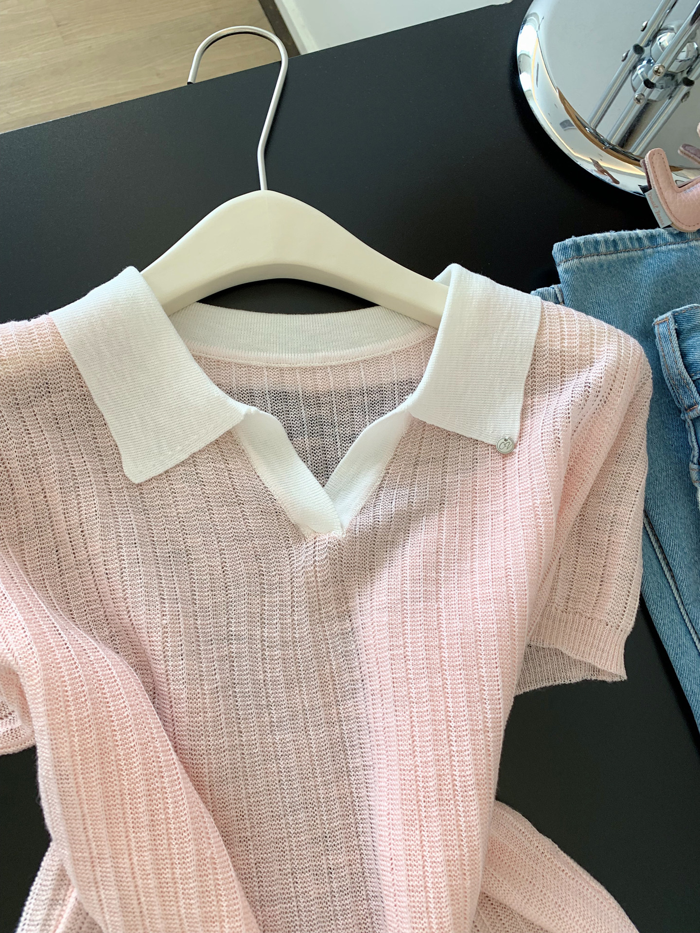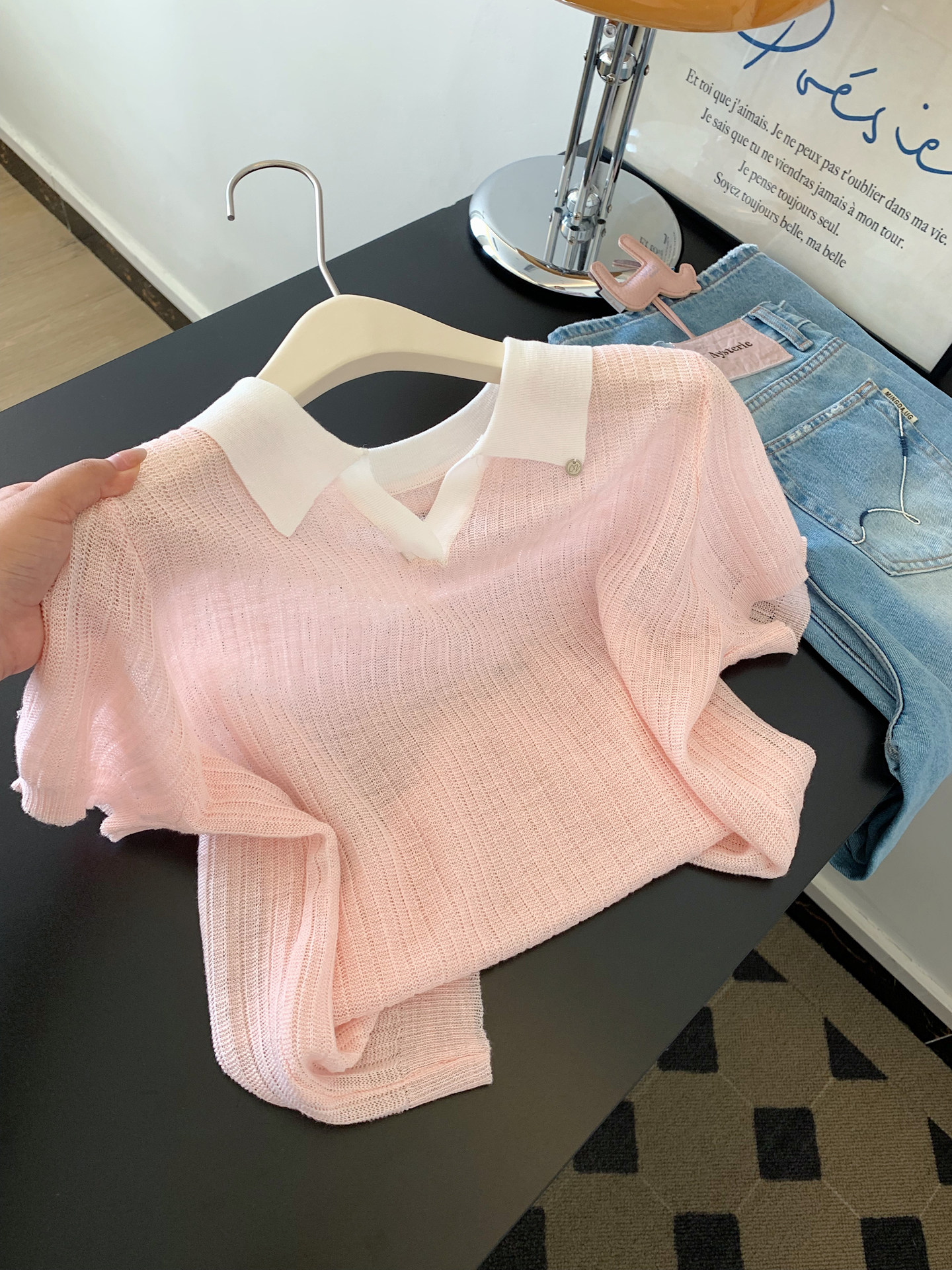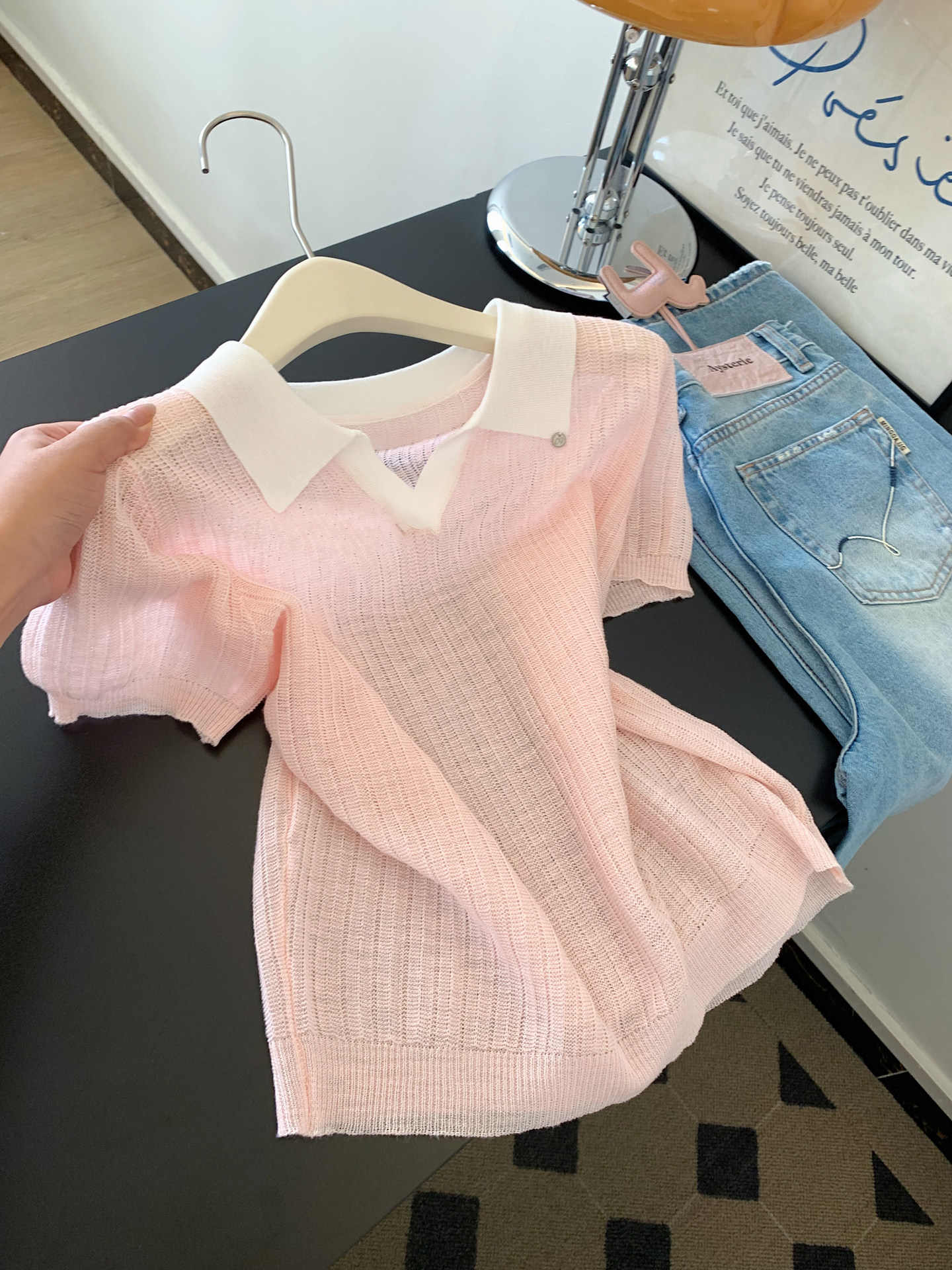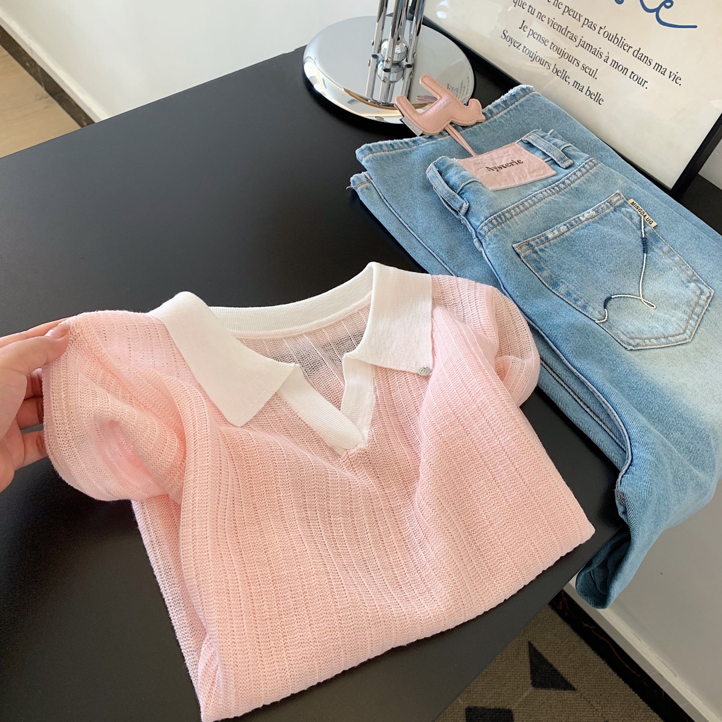2026 새로운 여성 의류 프릴 폴로 칼라 반팔 티셔츠 얇은 맨위 여름 한국 스타일 연령 감소 얼음 실크 니트 다용도