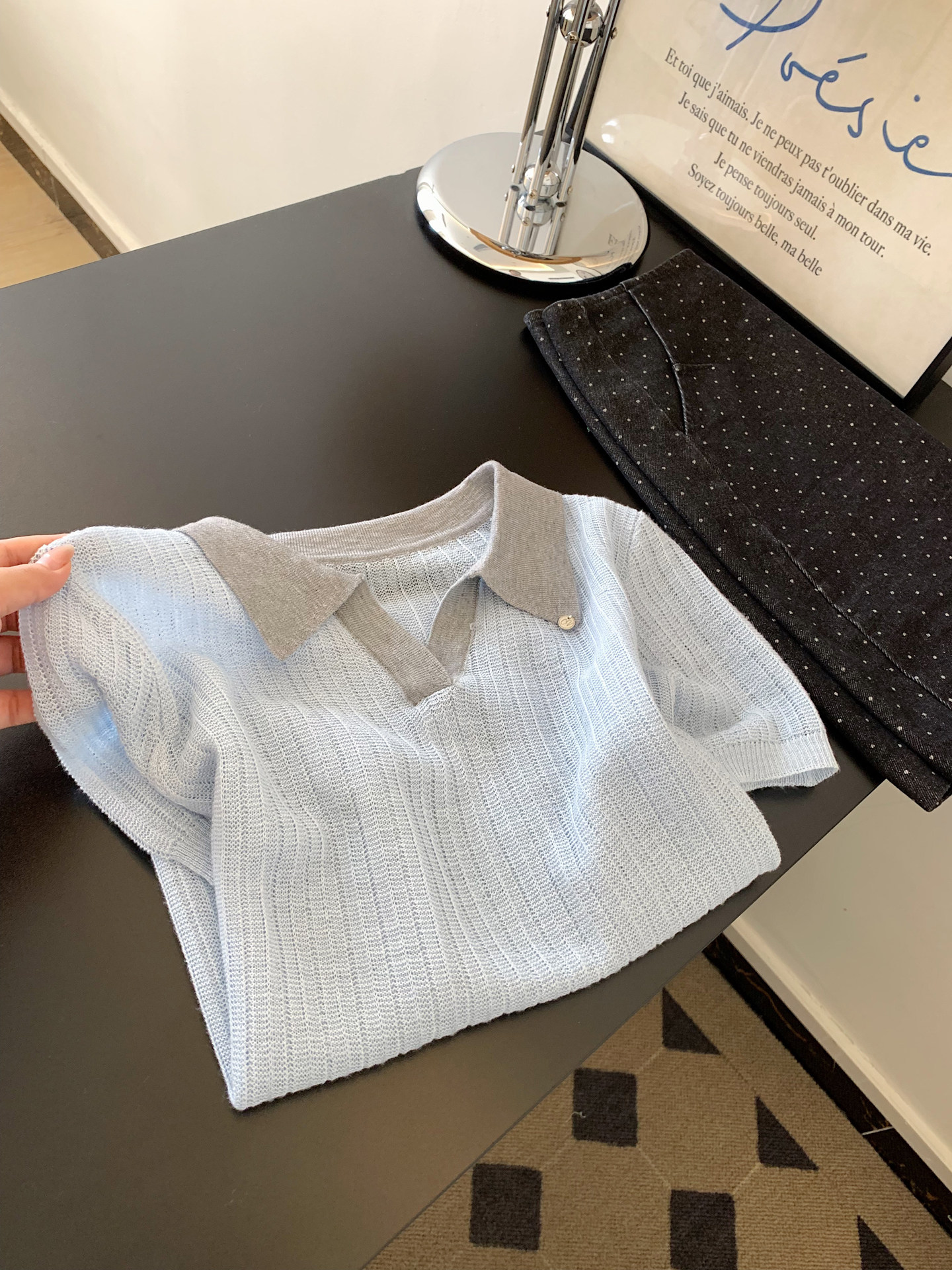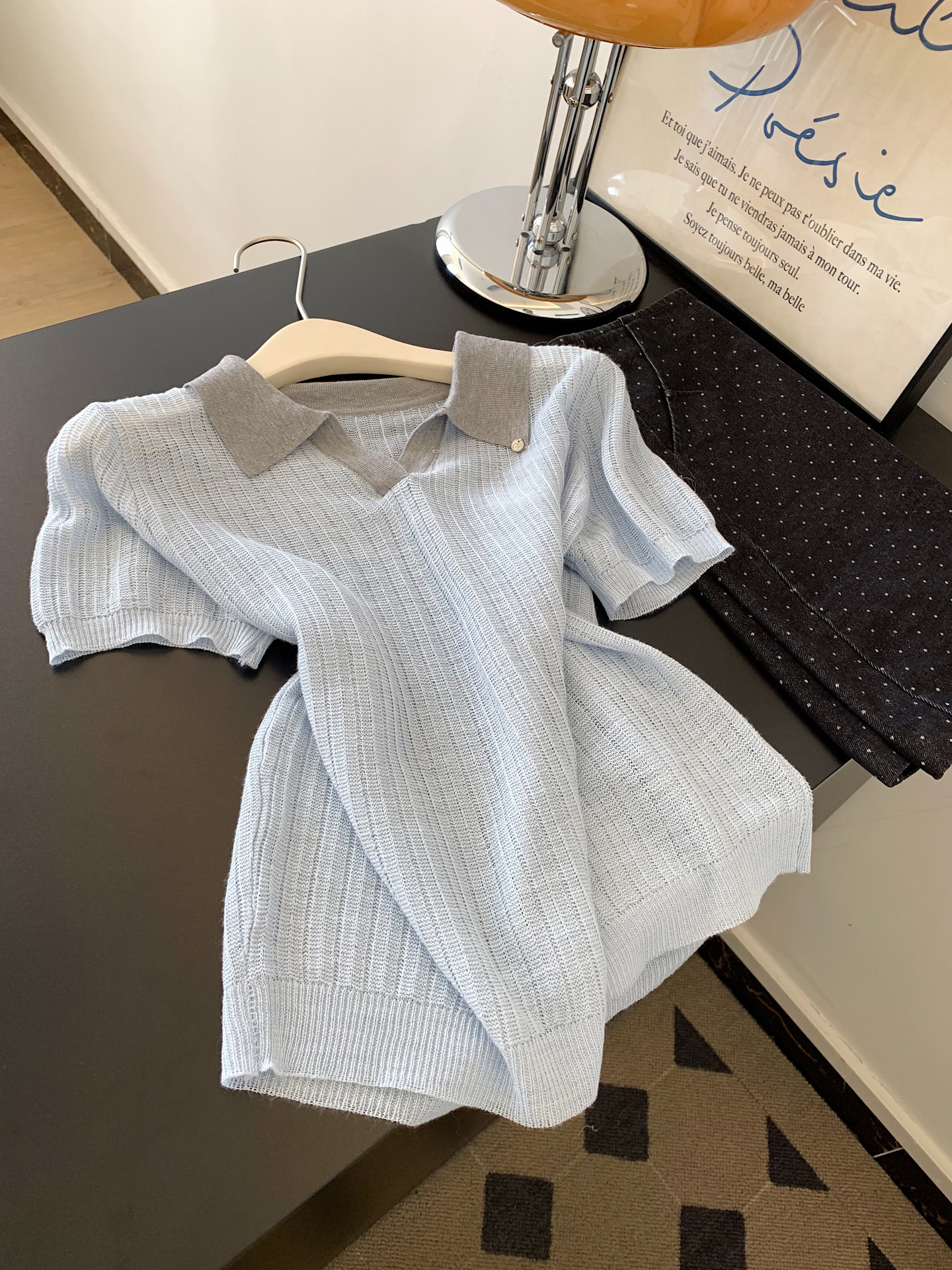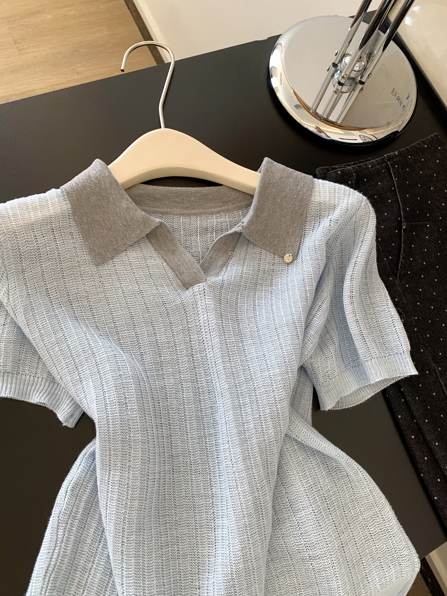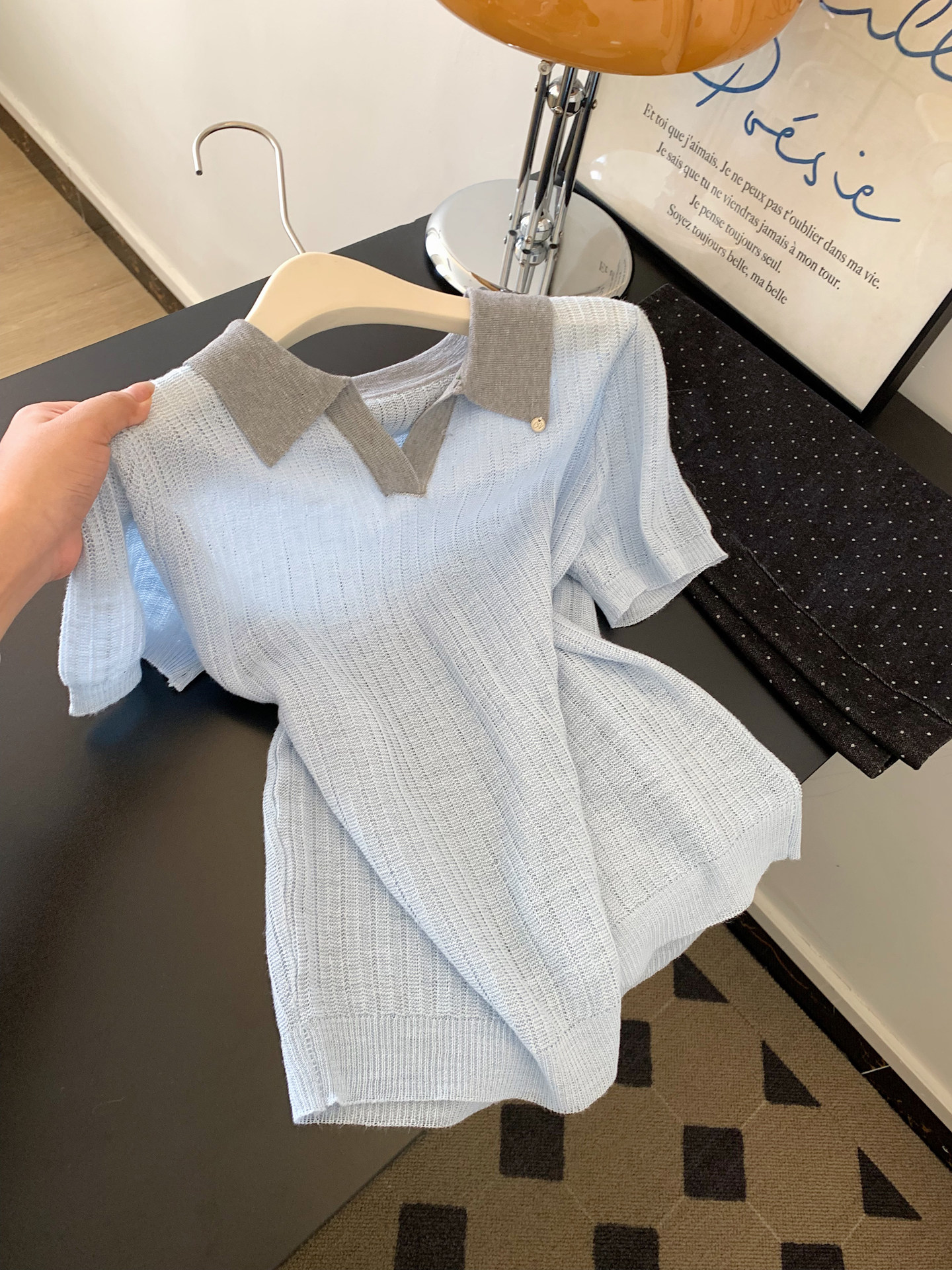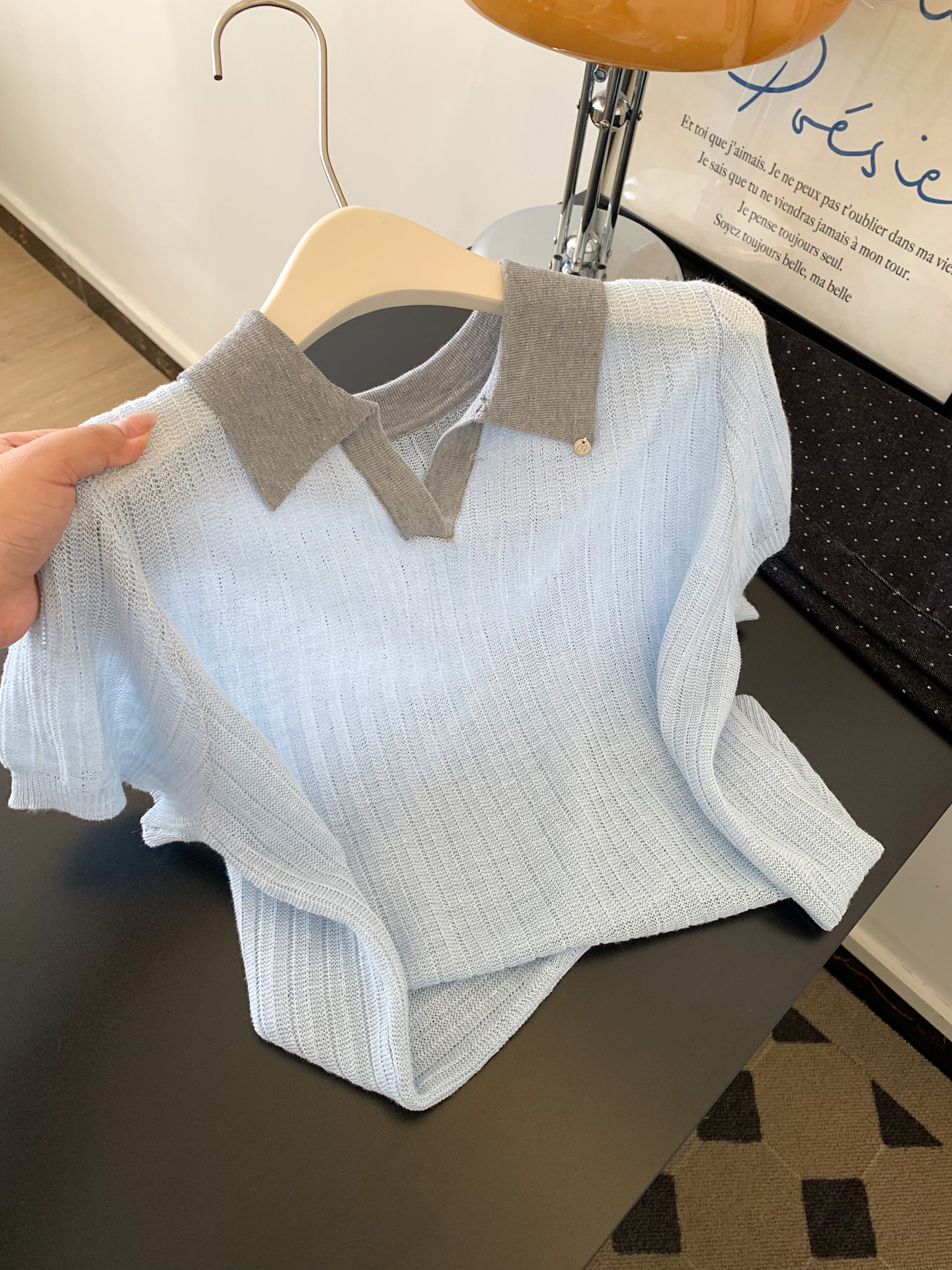 2026 새로운 여성 의류 프릴 폴로 칼라 반팔 티셔츠 얇은 맨위 여름 한국 스타일 연령 감소 얼음 실크 니트 다용도