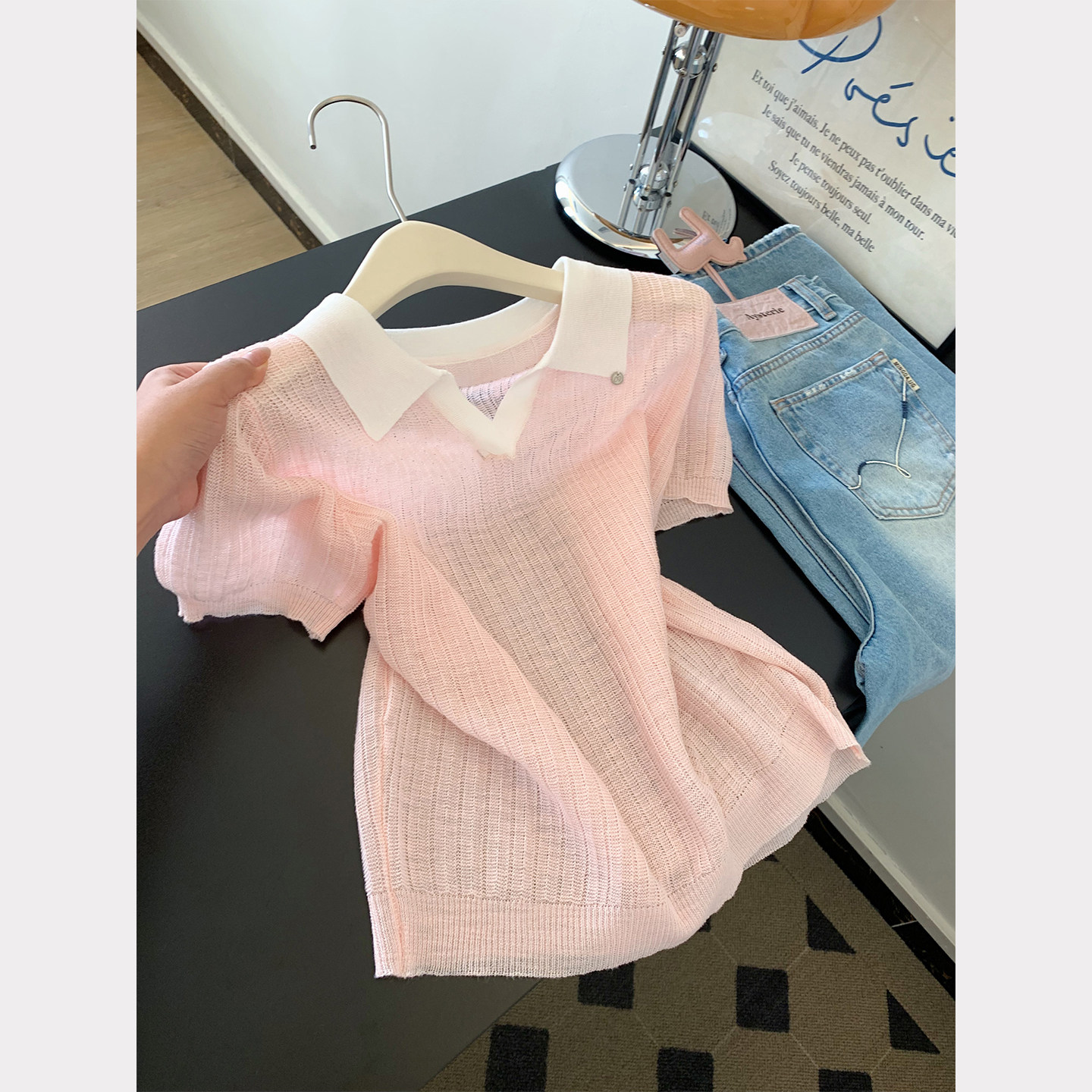 오리지널 디자인 한 부서 ins 바람 홀로우 아웃 자수 POLO 칼라 니트 반팔 여성 여름 출퇴근 다용도