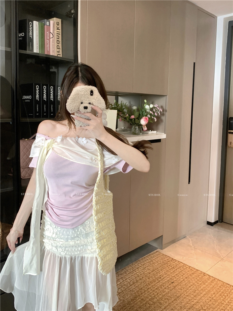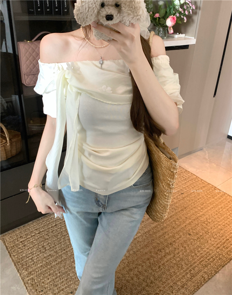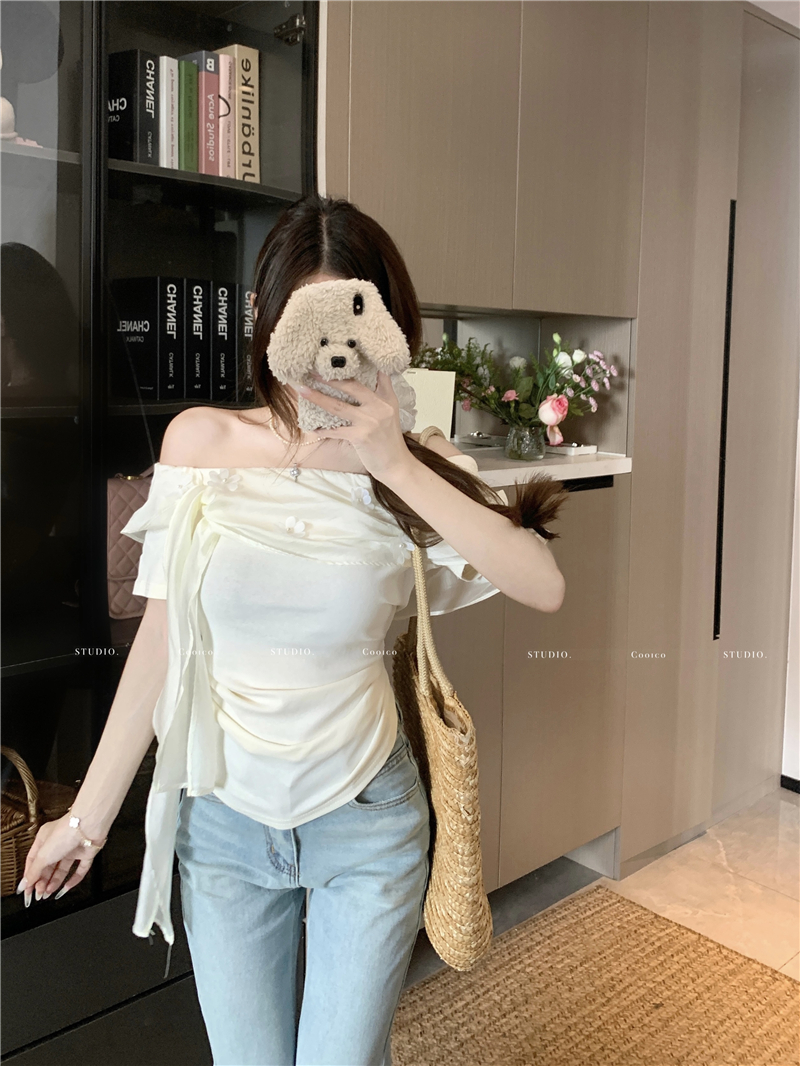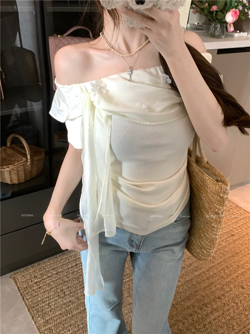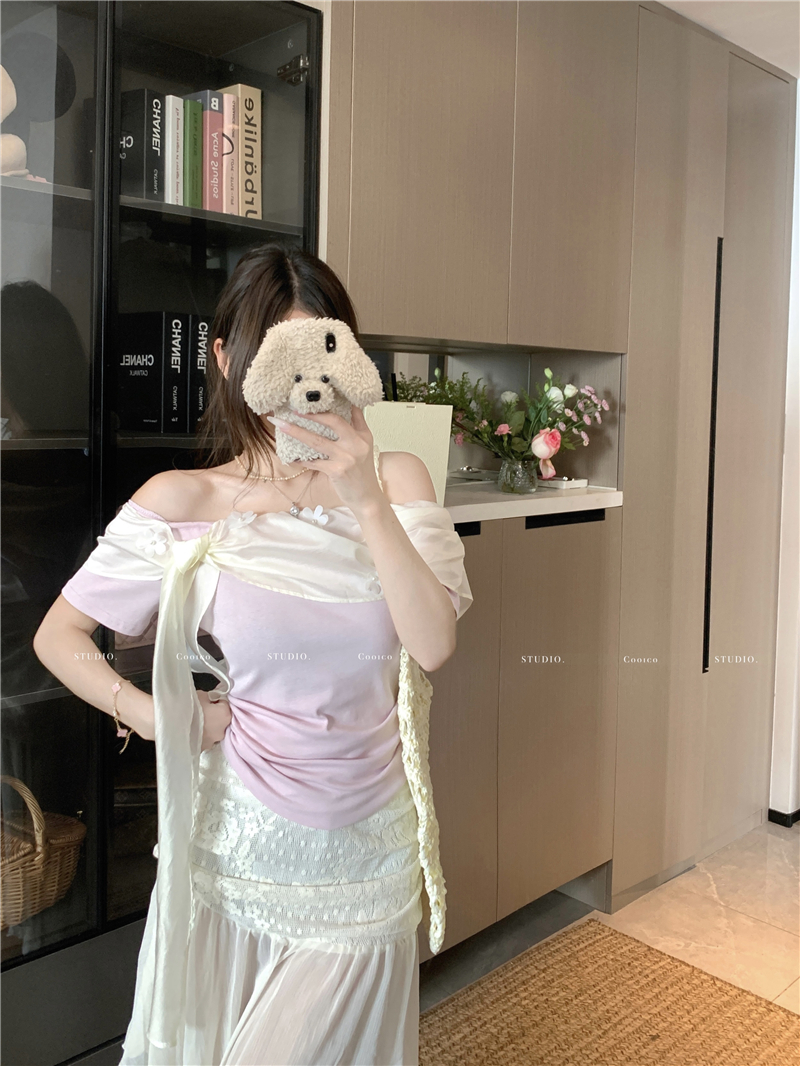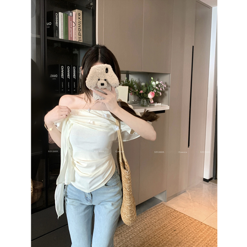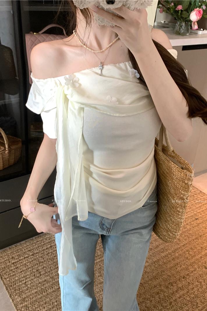 부드럽다 프로 피부 레몬 녹차 비스듬한 어깨 리본 디자인 센스 슬림해 보이는 반팔 티셔츠 리본 아니요 철거