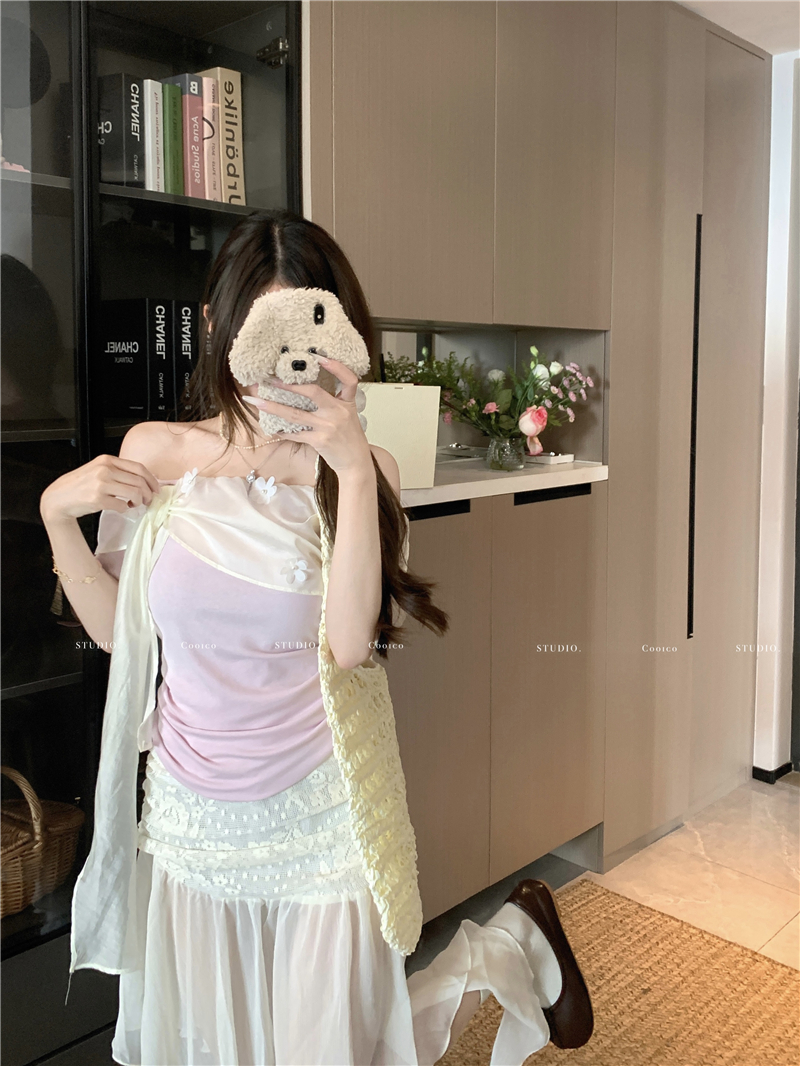 행침 목 미니 스커트 둘 착용 3 차원 꽃 디자인 센스 볼륨 측면 펌프 로프 튜브탑 맨위