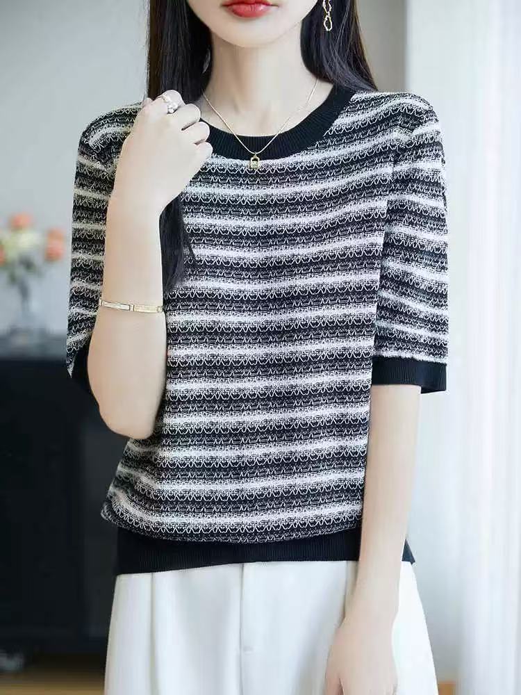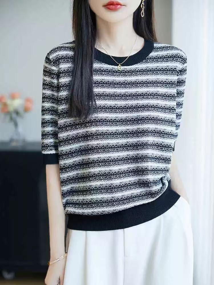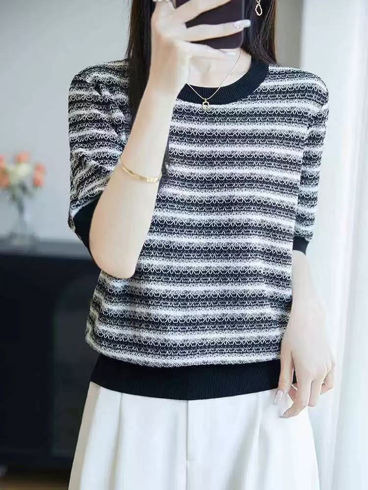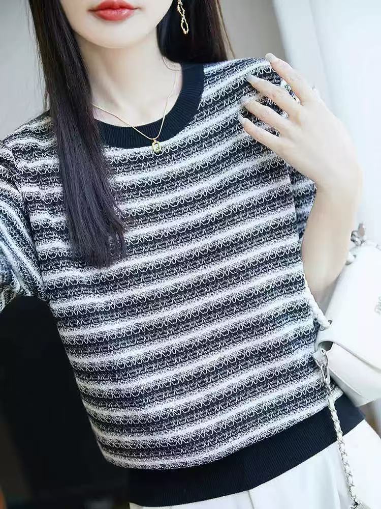 배색 POLO 칼라 반팔 약화 된 양모 니트 스웨터 여성 봄 여름 페이크 레이어드 다용도 기본 셔츠 스트라이프 맨위