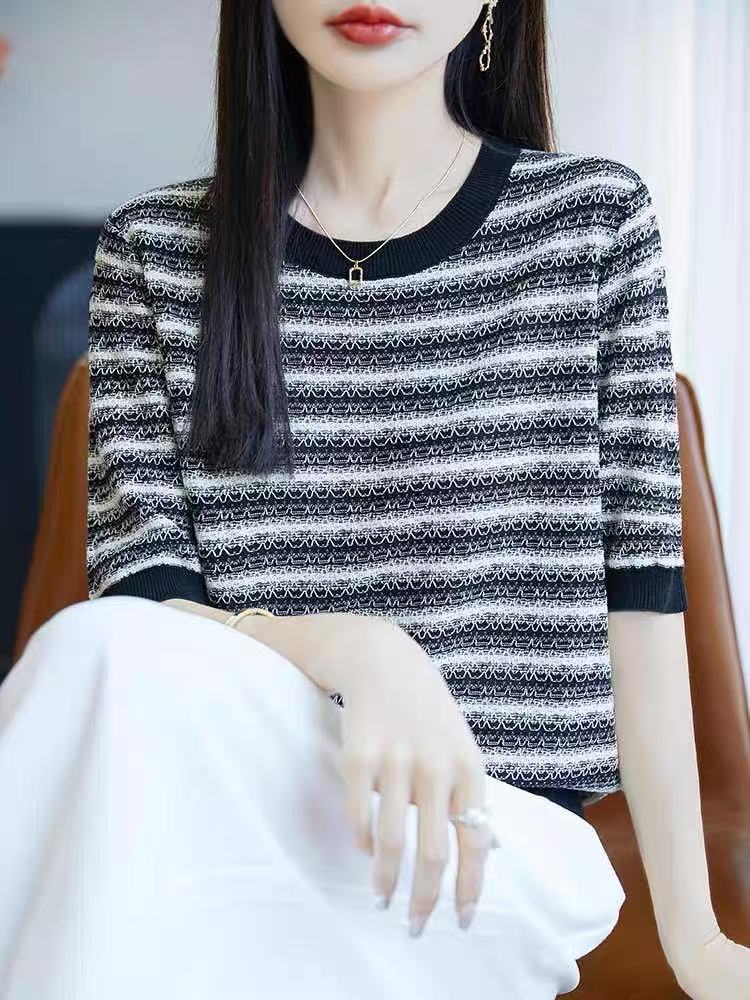 살구 색상 달콤함 스트라이프 얼음 실크 니트 티셔츠 여성 2026 여름 새로운 작은 키 몸매 가꾸기 슬림해 보이는 반팔 맨위