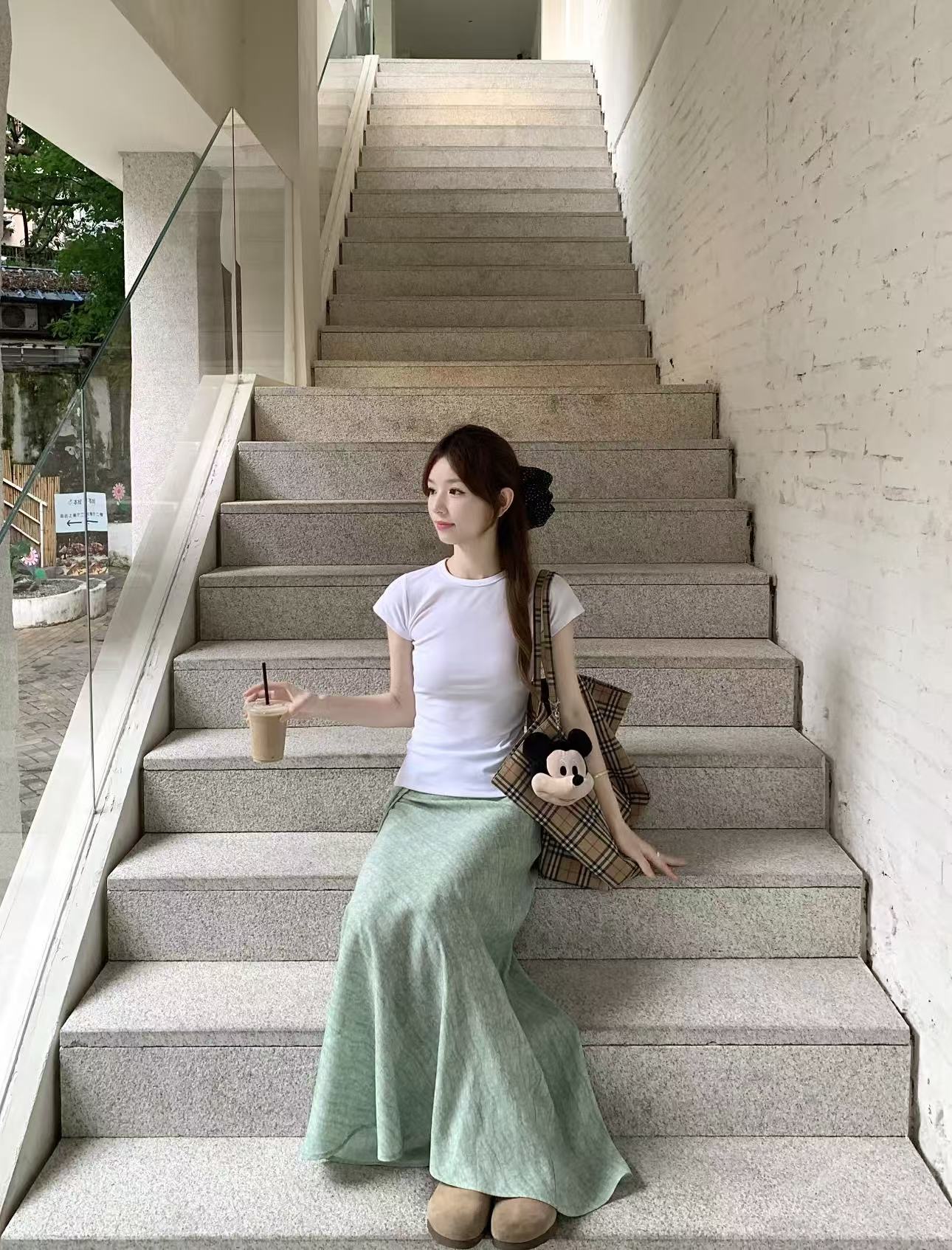 실사 정가 하얀 달빛 부드러운 품격 천 골드 허리 수축 슬림해 보이는 V넥 반팔 드레스