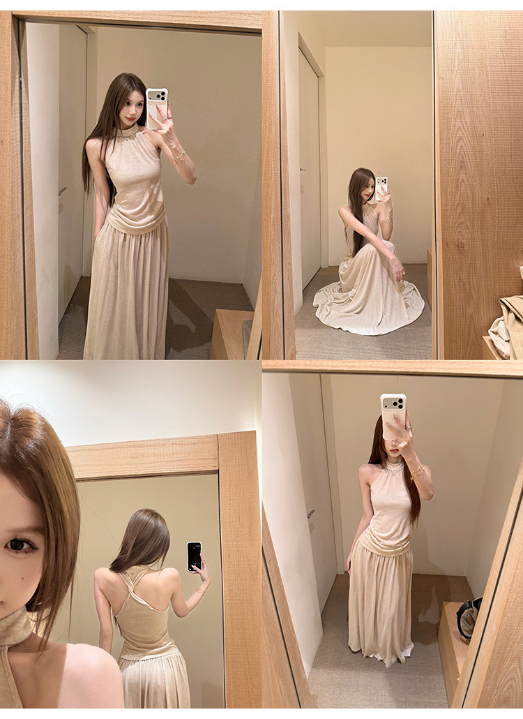 회화 솔루션 wahju 판매 부드러운 프랑스식 새틴 품격 비스듬한 어깨 천 금빛 바람 슬림해 보이는 한 마디 꼬집기 허리 드레스 봄