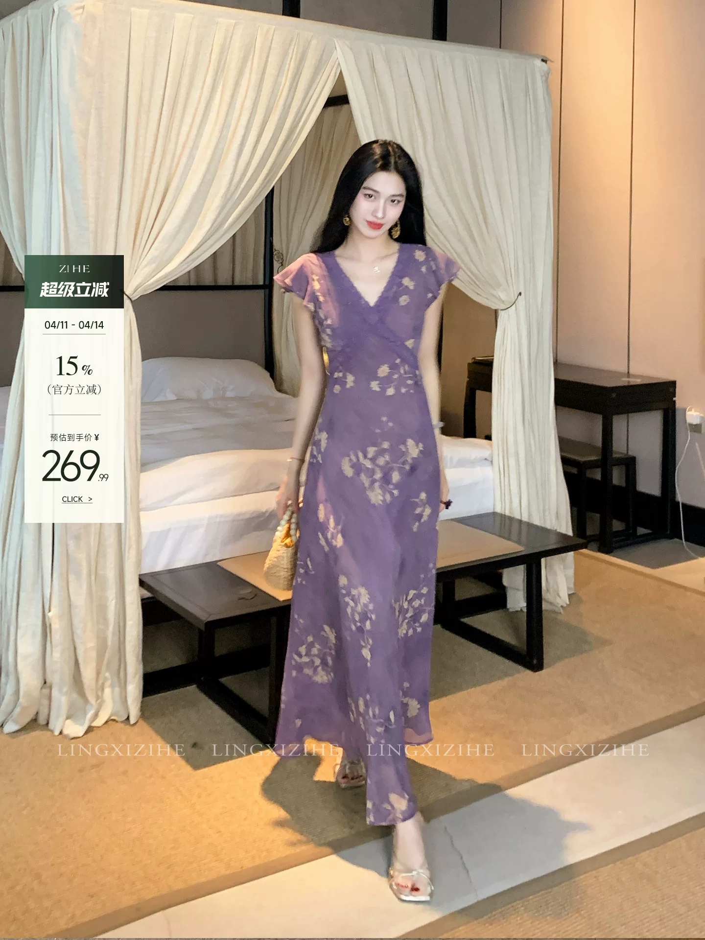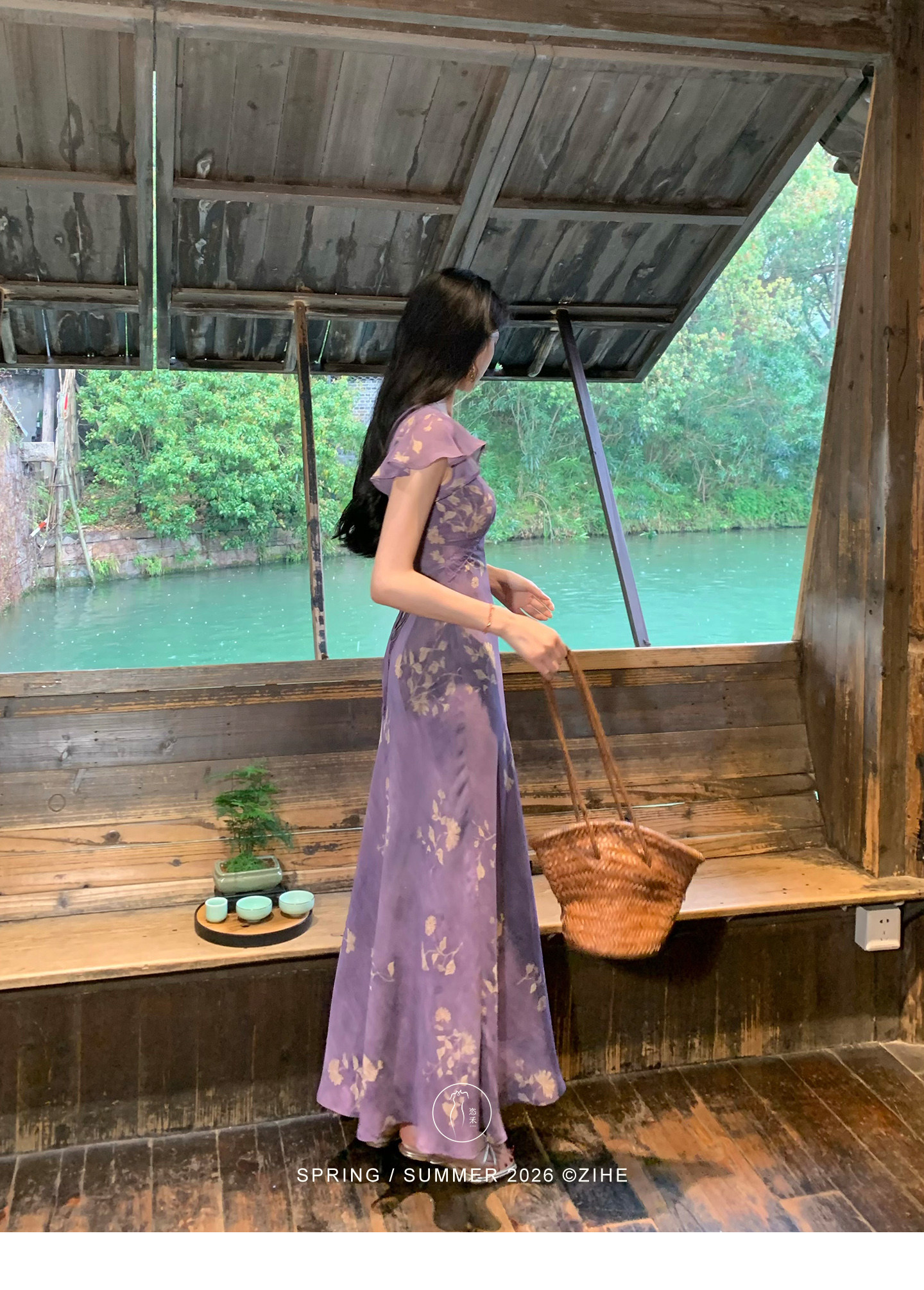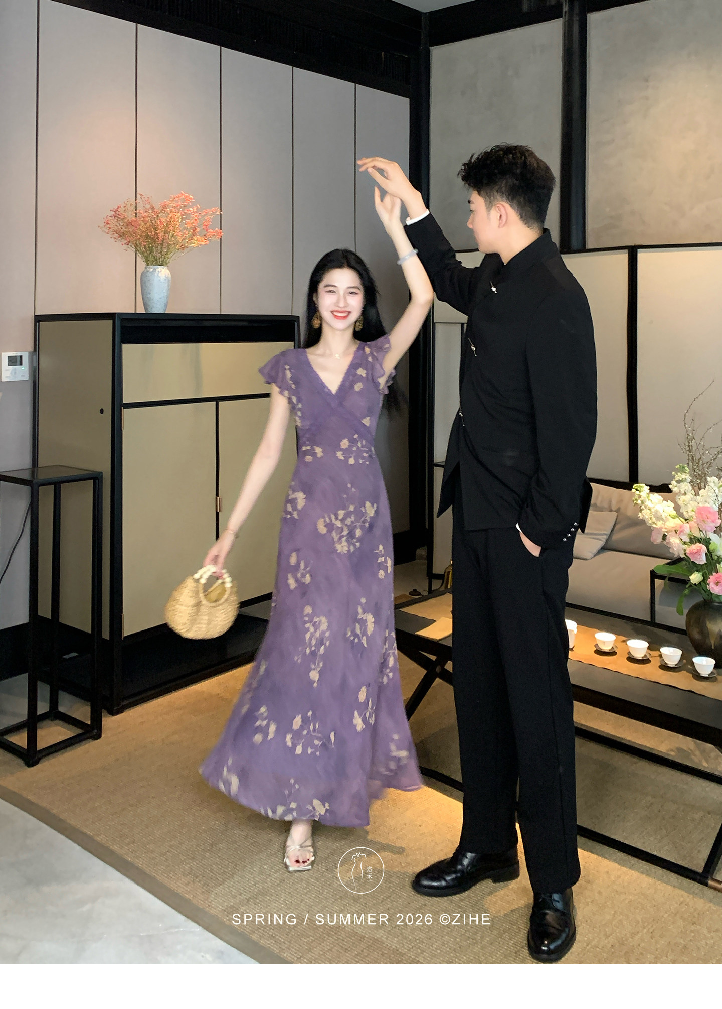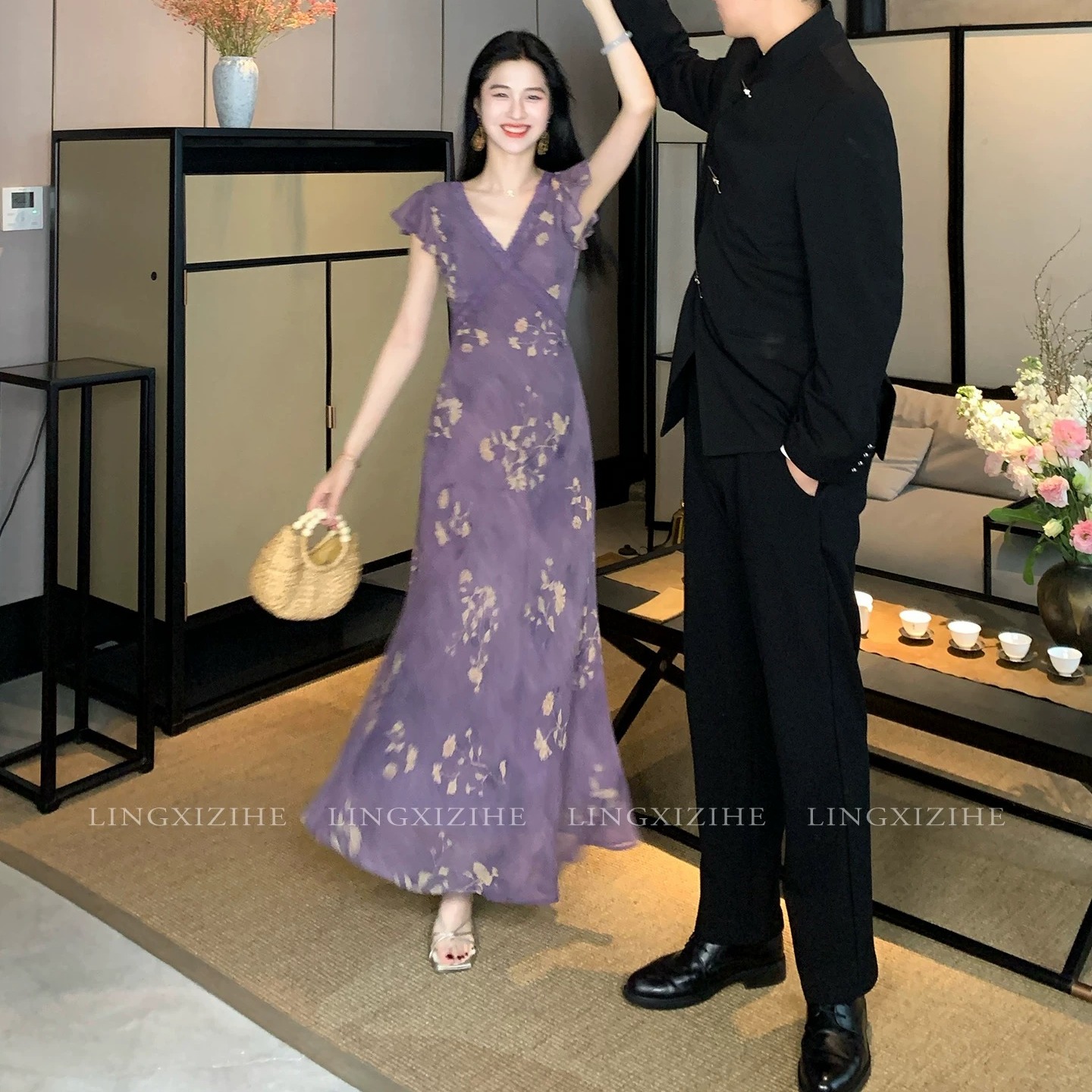 2026 년 여름 보라색 라임 생 향 동양의 미학 금 자주색 꽃 비싼 가스 빛 국풍 드레스