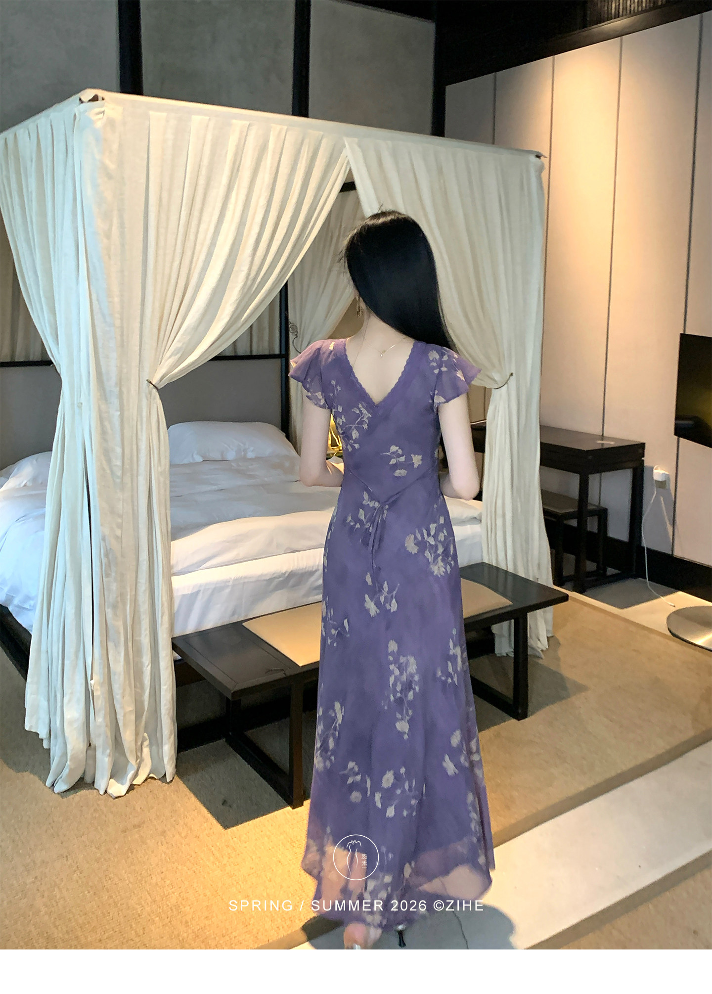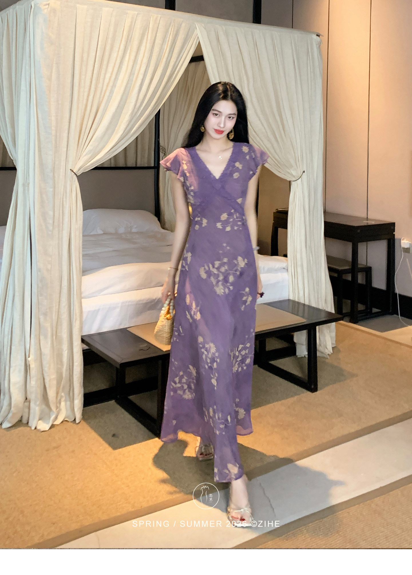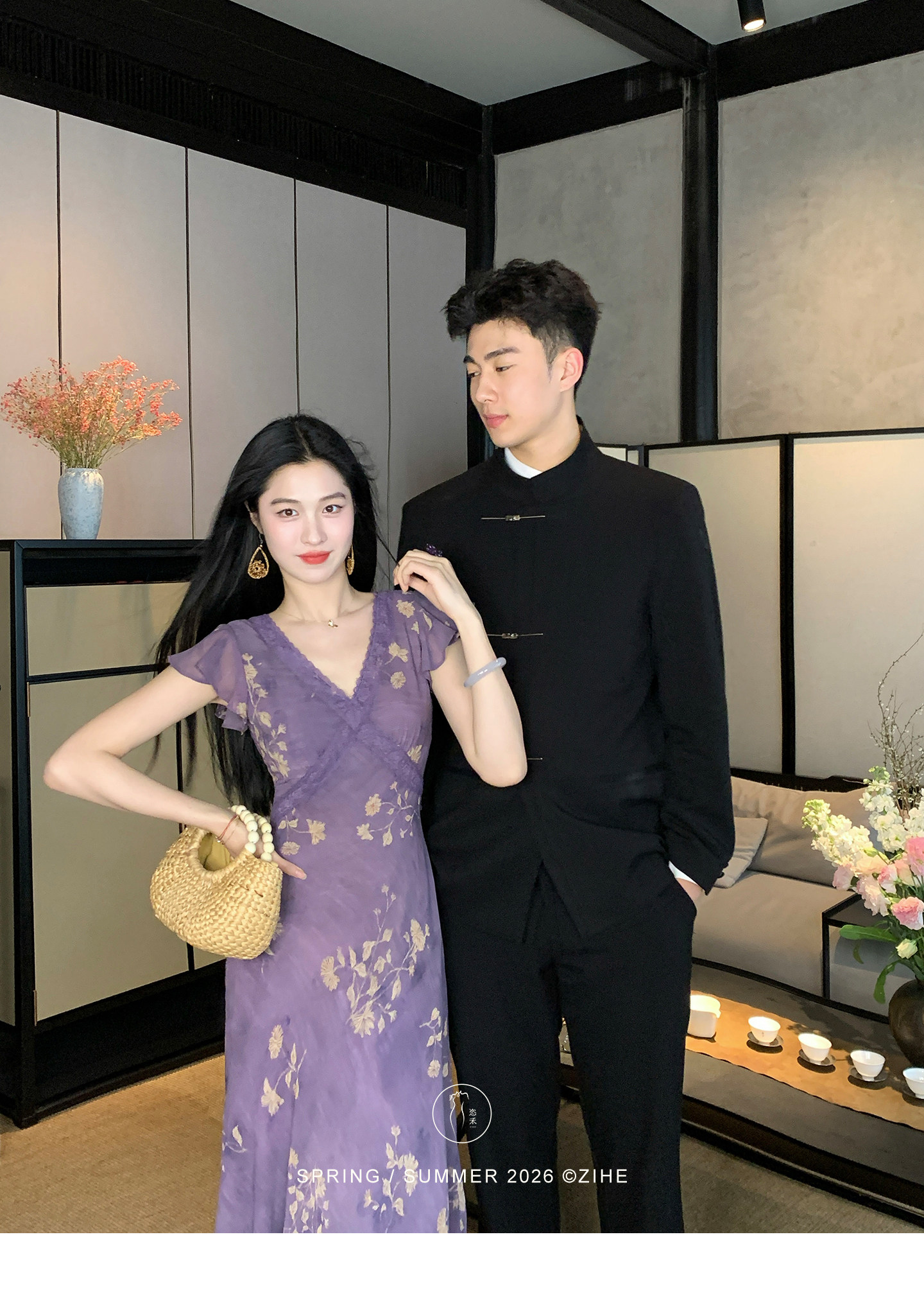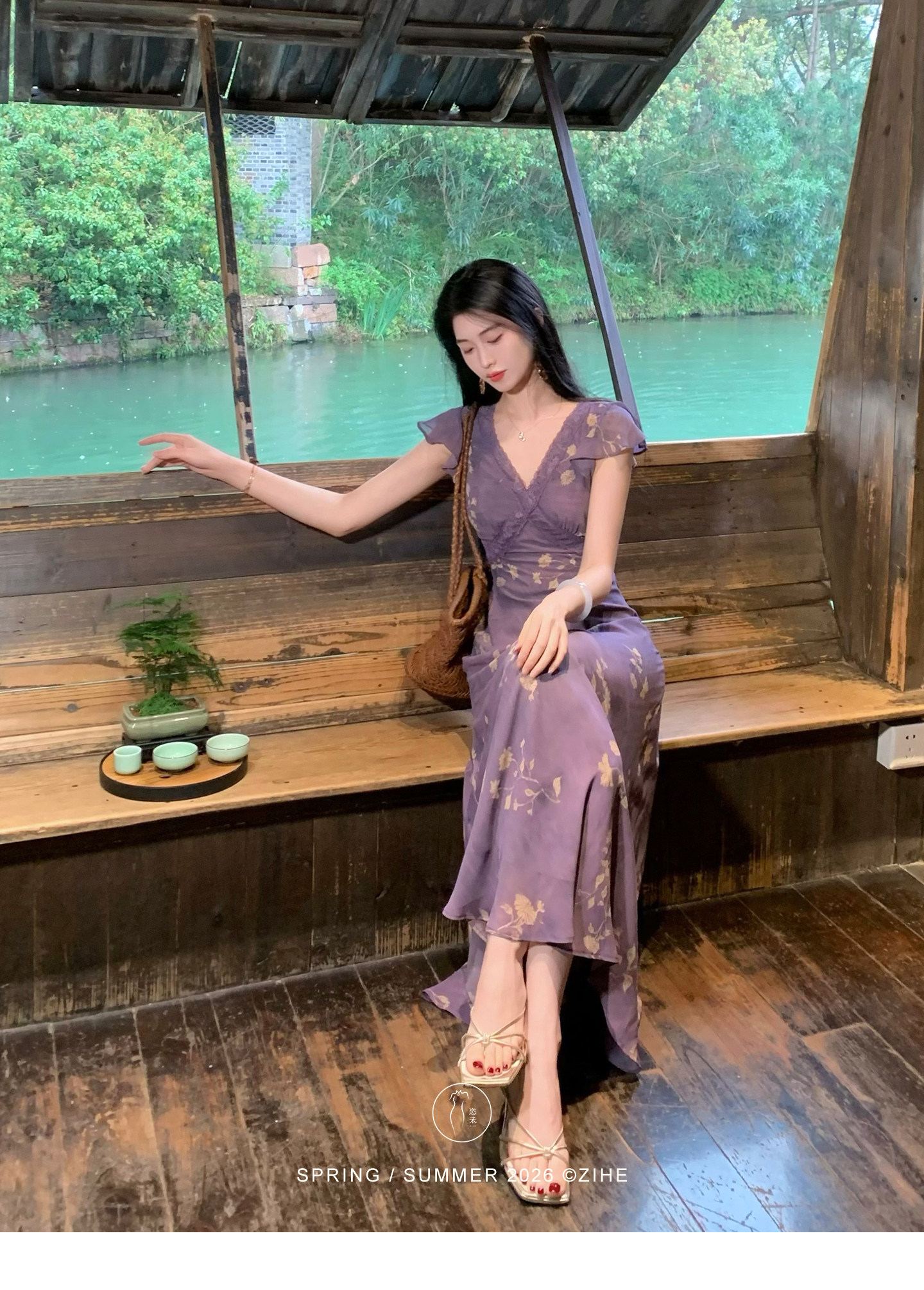 2026 년 여름 보라색 라임 생 향 동양의 미학 금 자주색 꽃 비싼 가스 빛 국풍 드레스