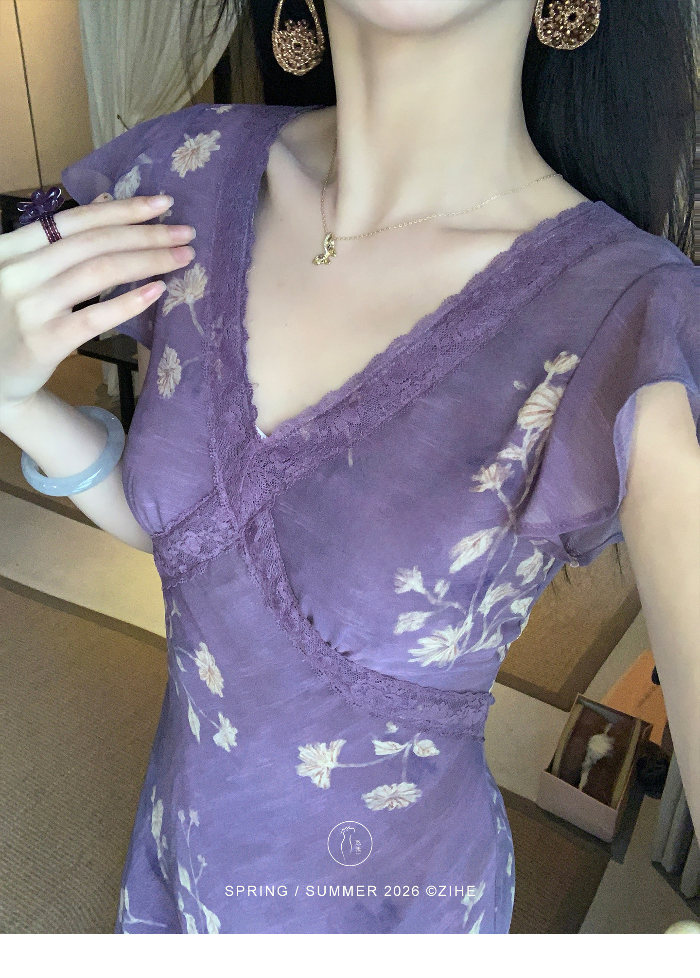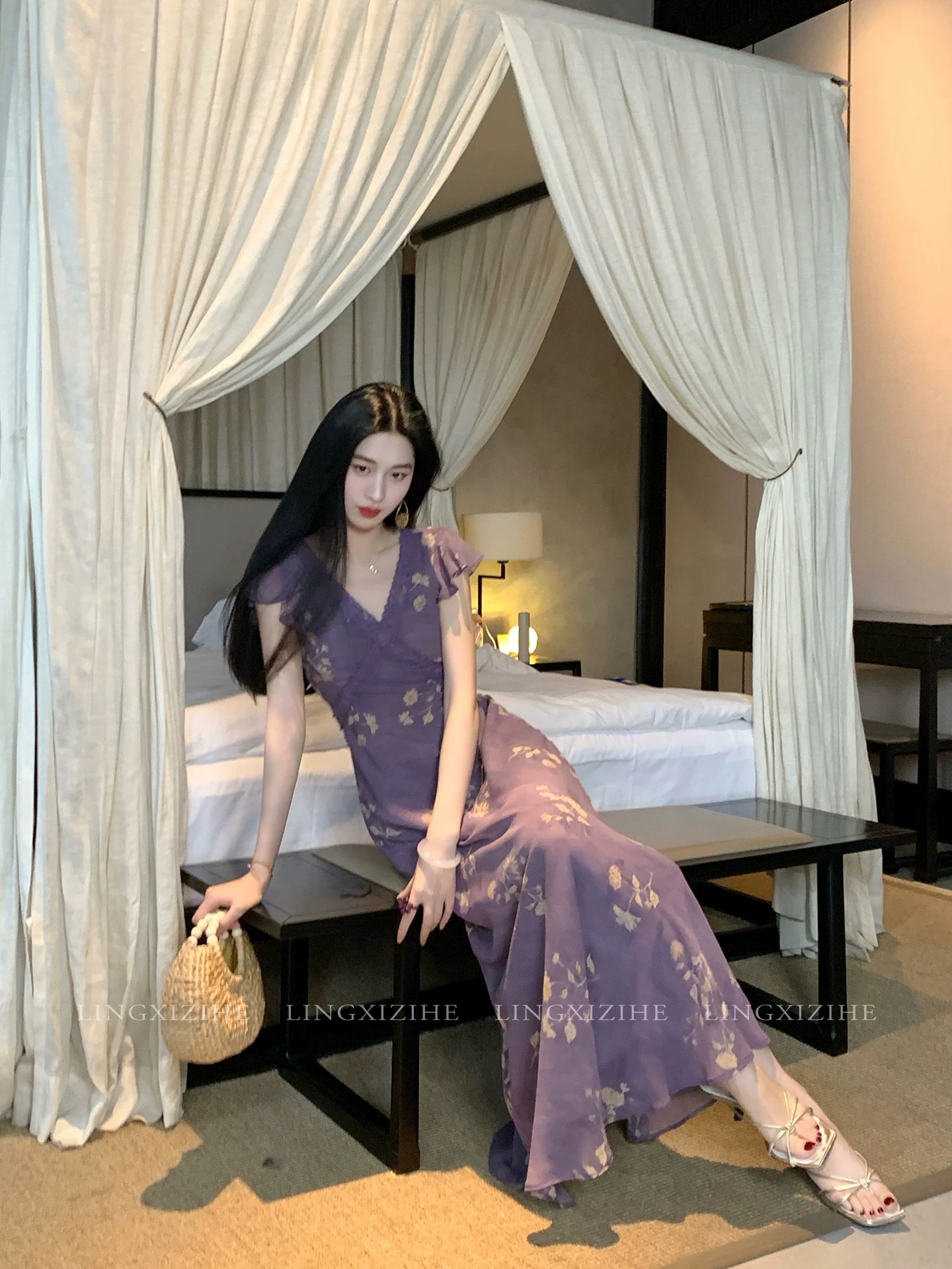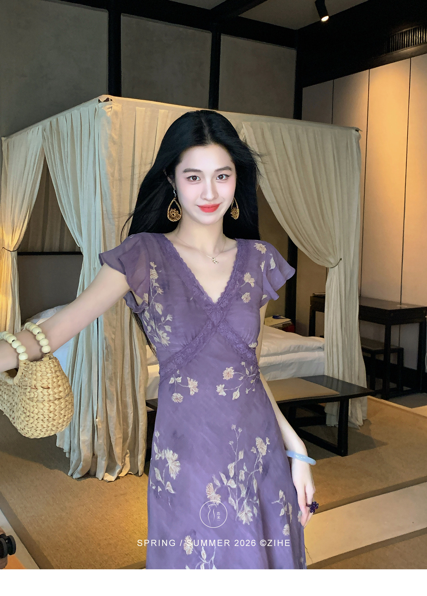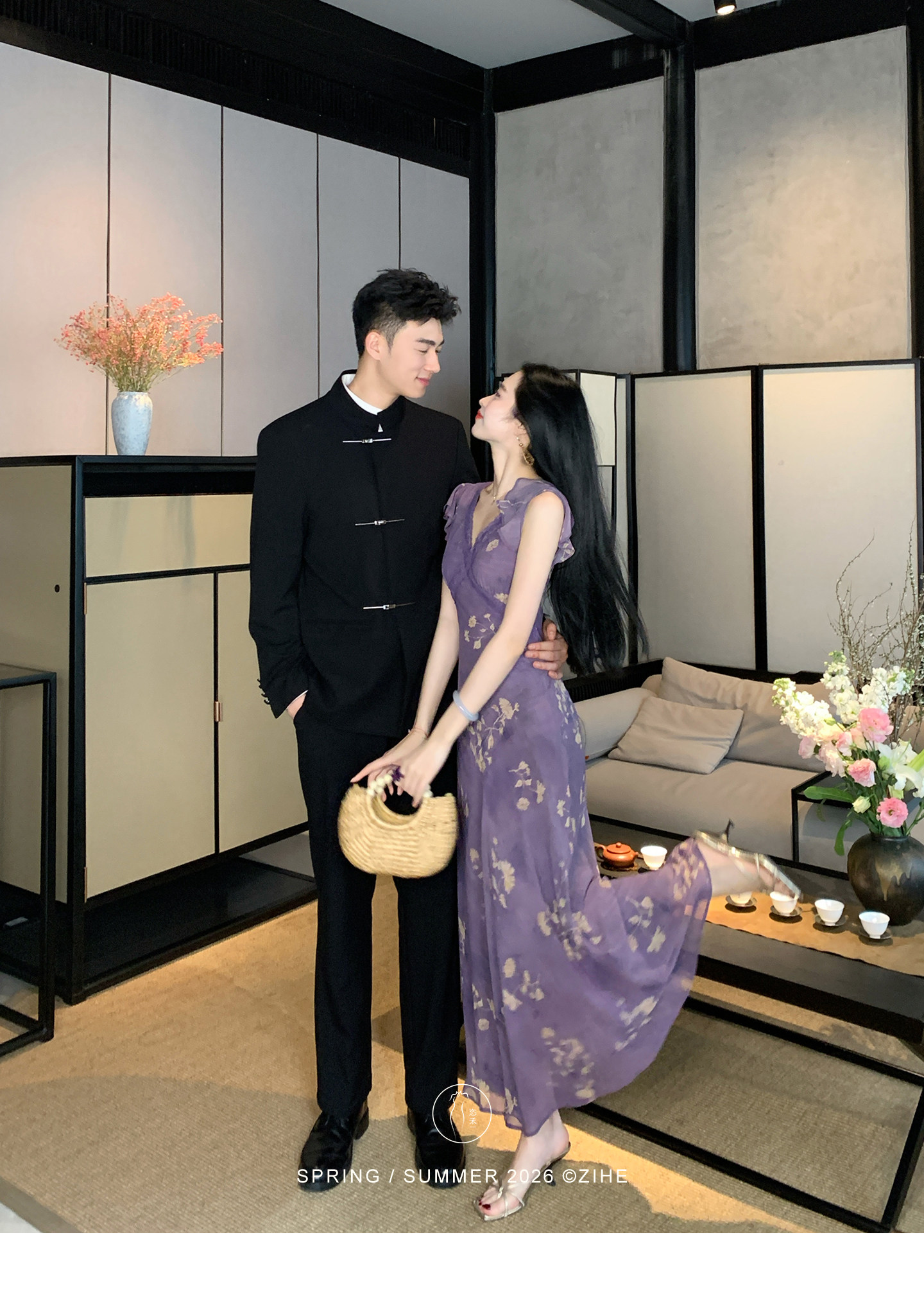 2026 년 여름 보라색 라임 생 향 동양의 미학 금 자주색 꽃 비싼 가스 빛 국풍 드레스