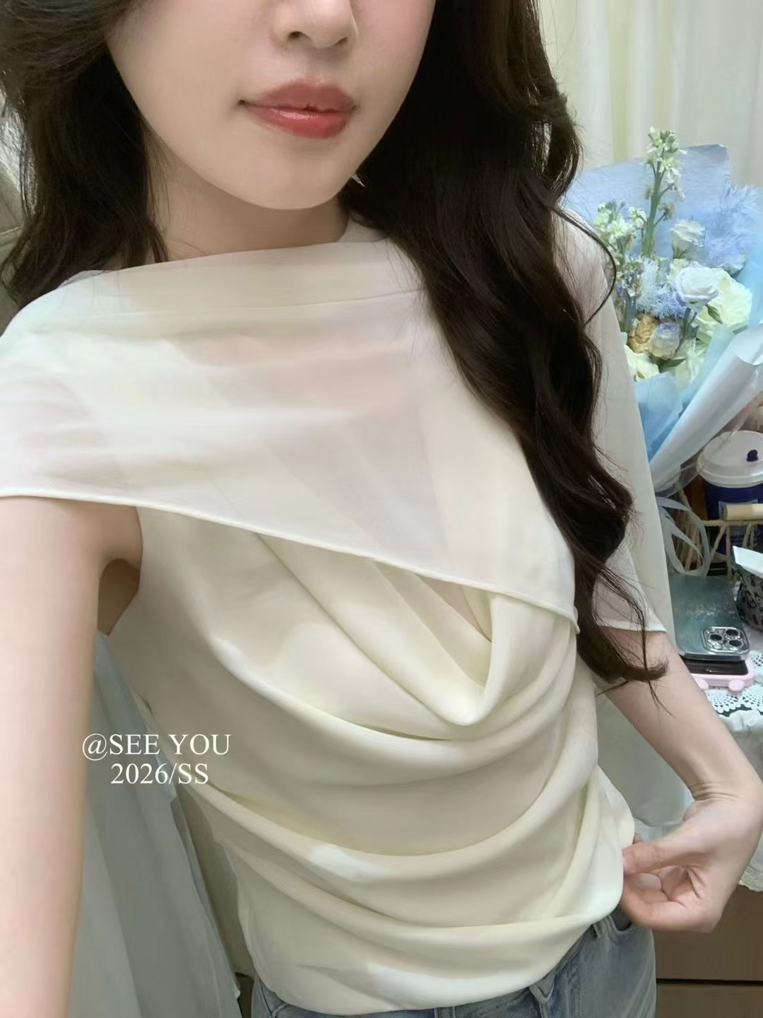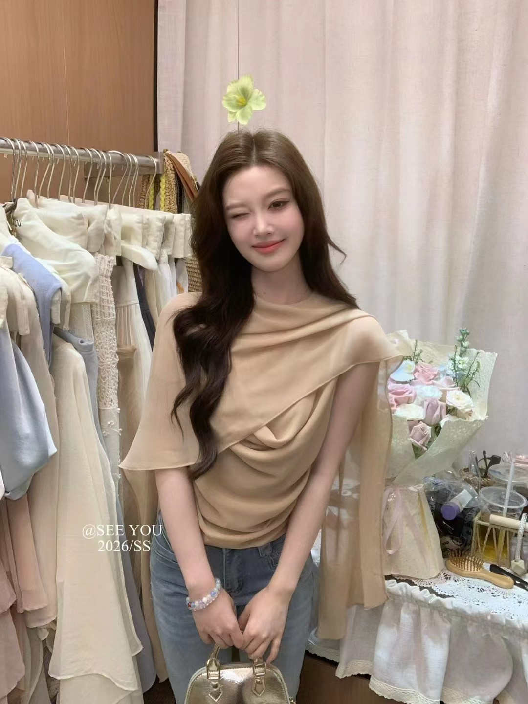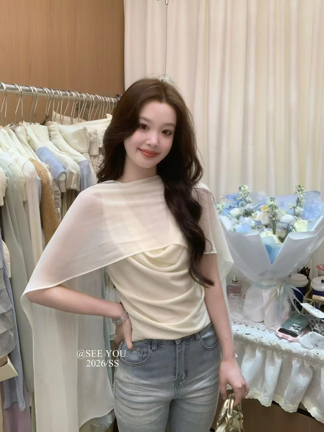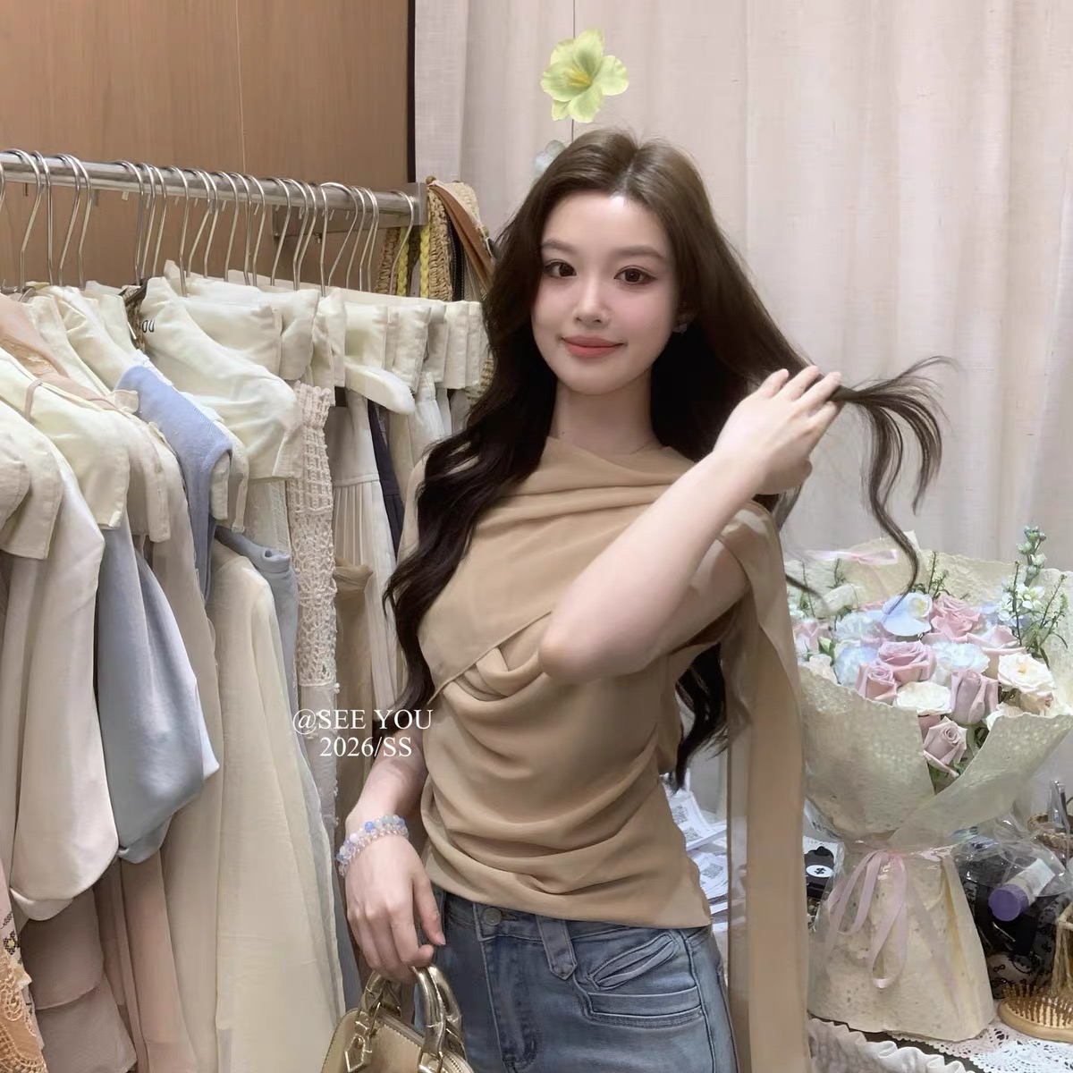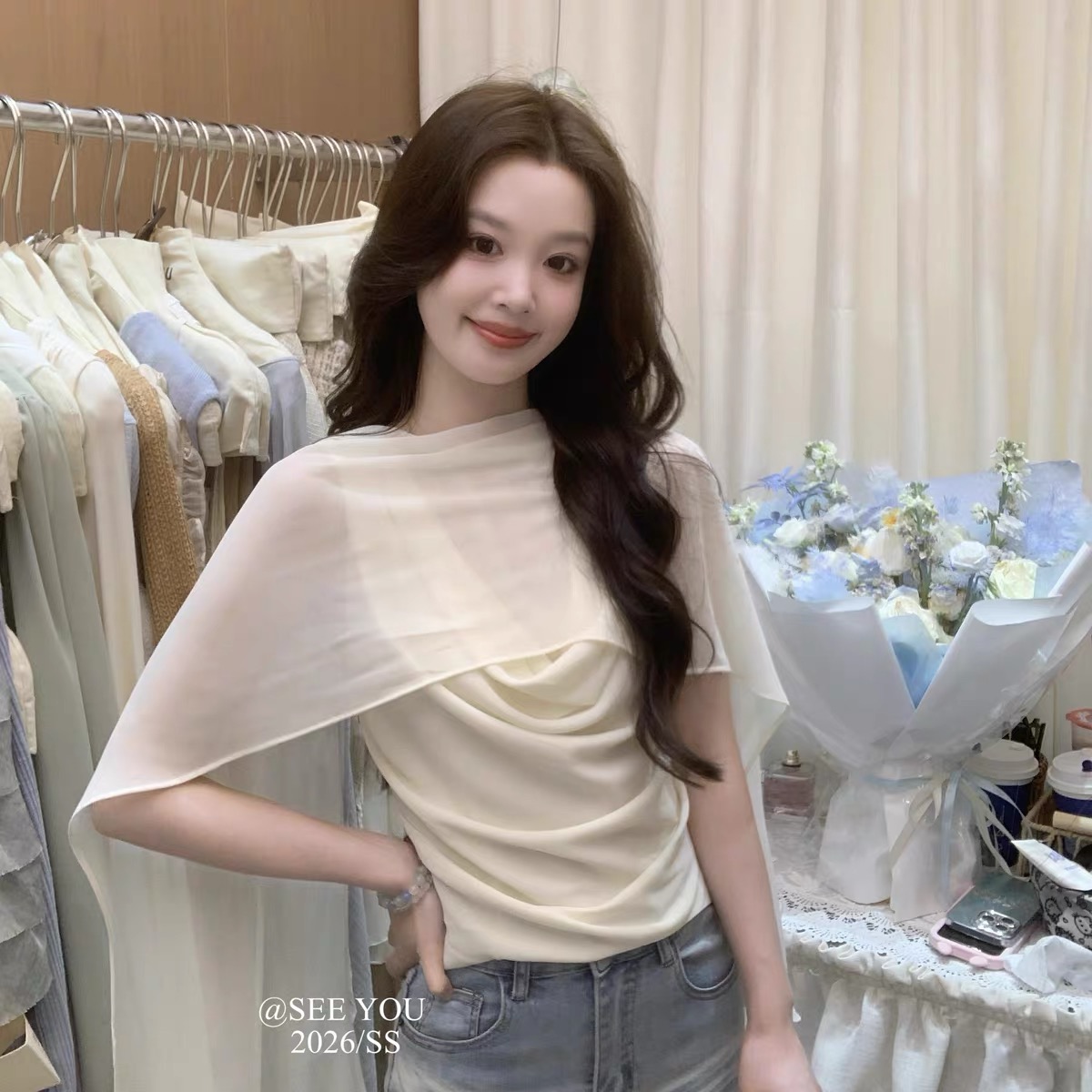 2026 열세 개 이른 봄 새로운 고대 조기 달콤한 자매 구슬 빛 느낌 프릴 비스듬한 어깨 작은 셔츠