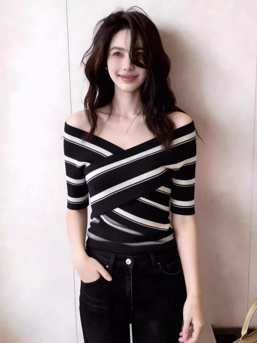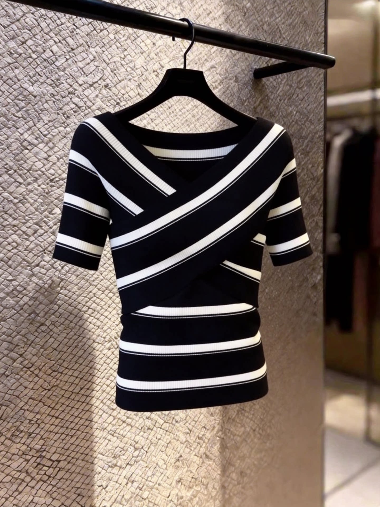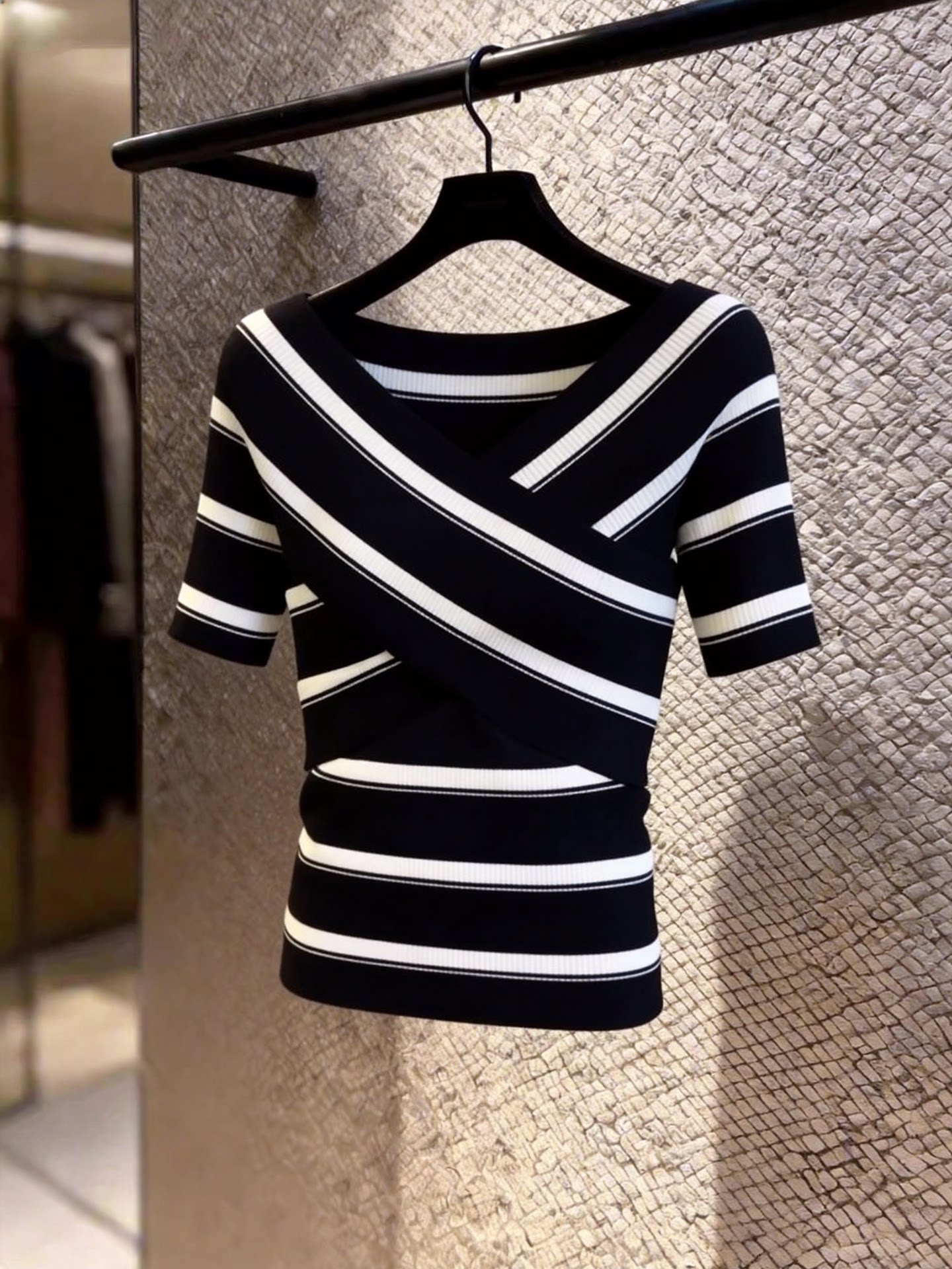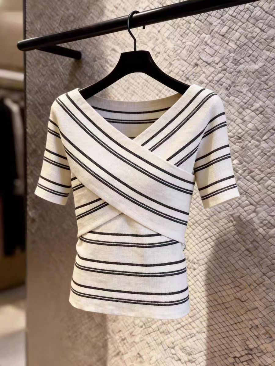 새로운 흑백 줄무늬 티셔츠 하트 반팔 여성 여름 외출용 얼음 실크 주간 실크 중간 소매 니트 슬림해 보이는 5 점 소매