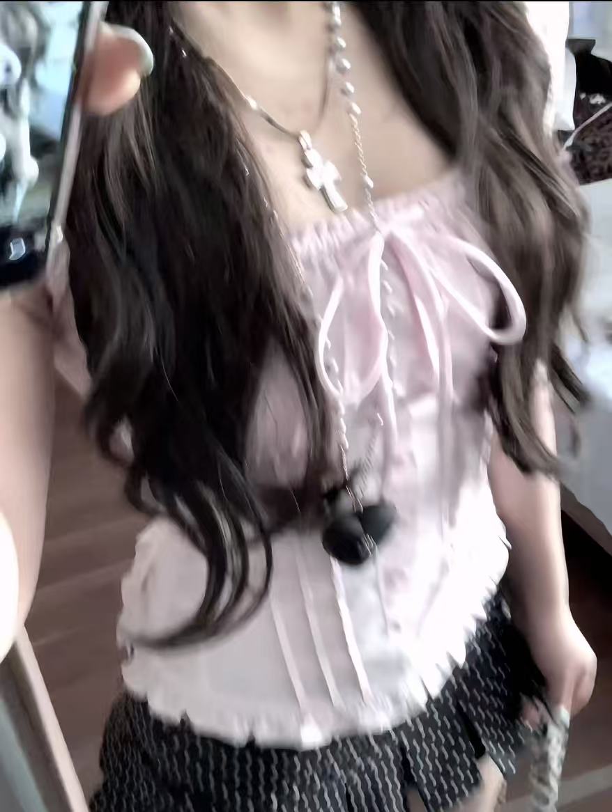 달콤한 스타일 복숭아 분말 거품 소매 반팔 티셔츠 여성 여름 2026 새로운 몸매 가꾸기 광장 칼라 셔츠 레이스 맨위