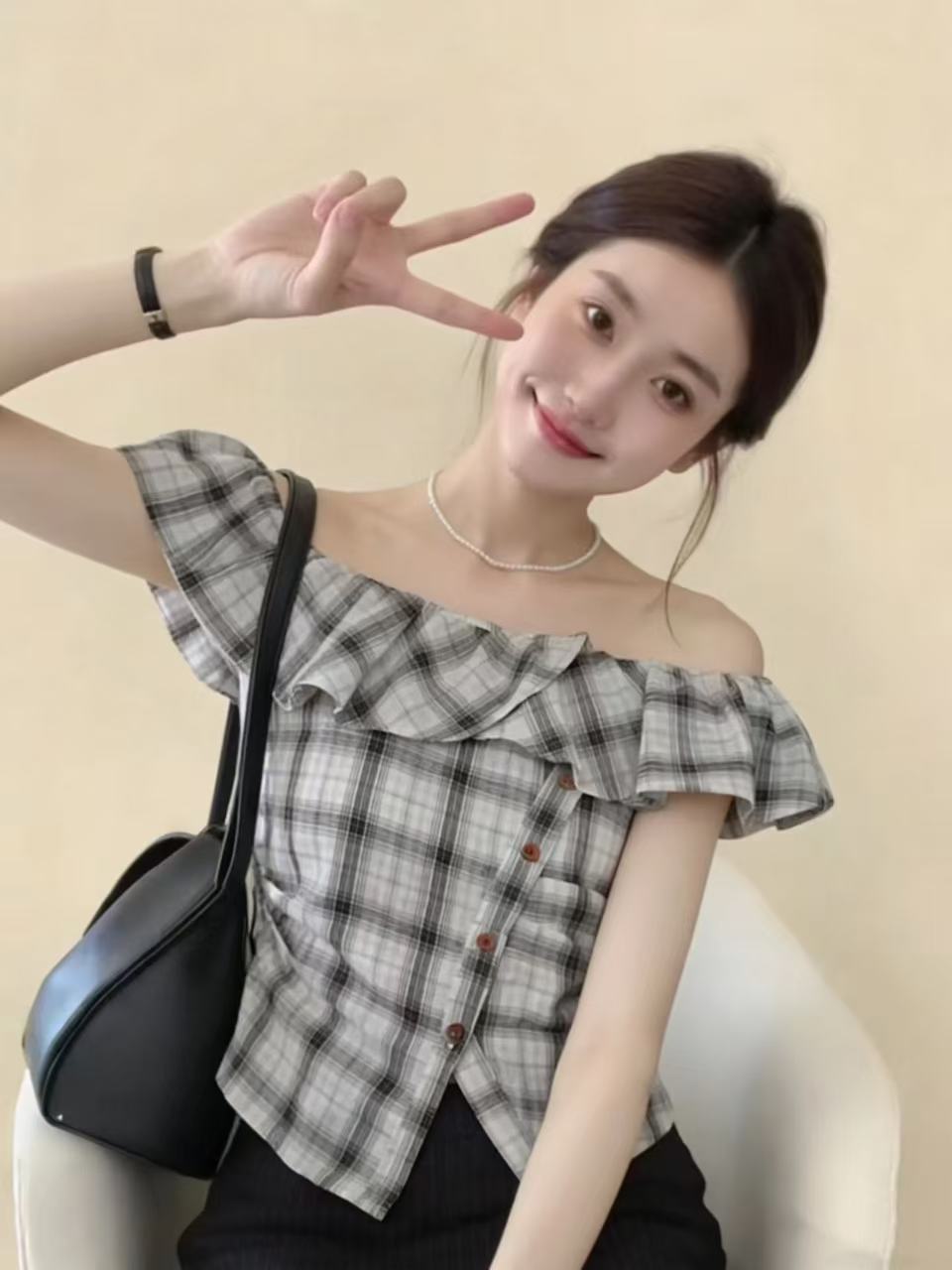 한 부서 작은 대중 체크무늬 오프숄더 오프숄더 반팔 여성 셔츠 여름 새로운 몸매 가꾸기 작은 키 착용 잡아라. 의류 트렌디