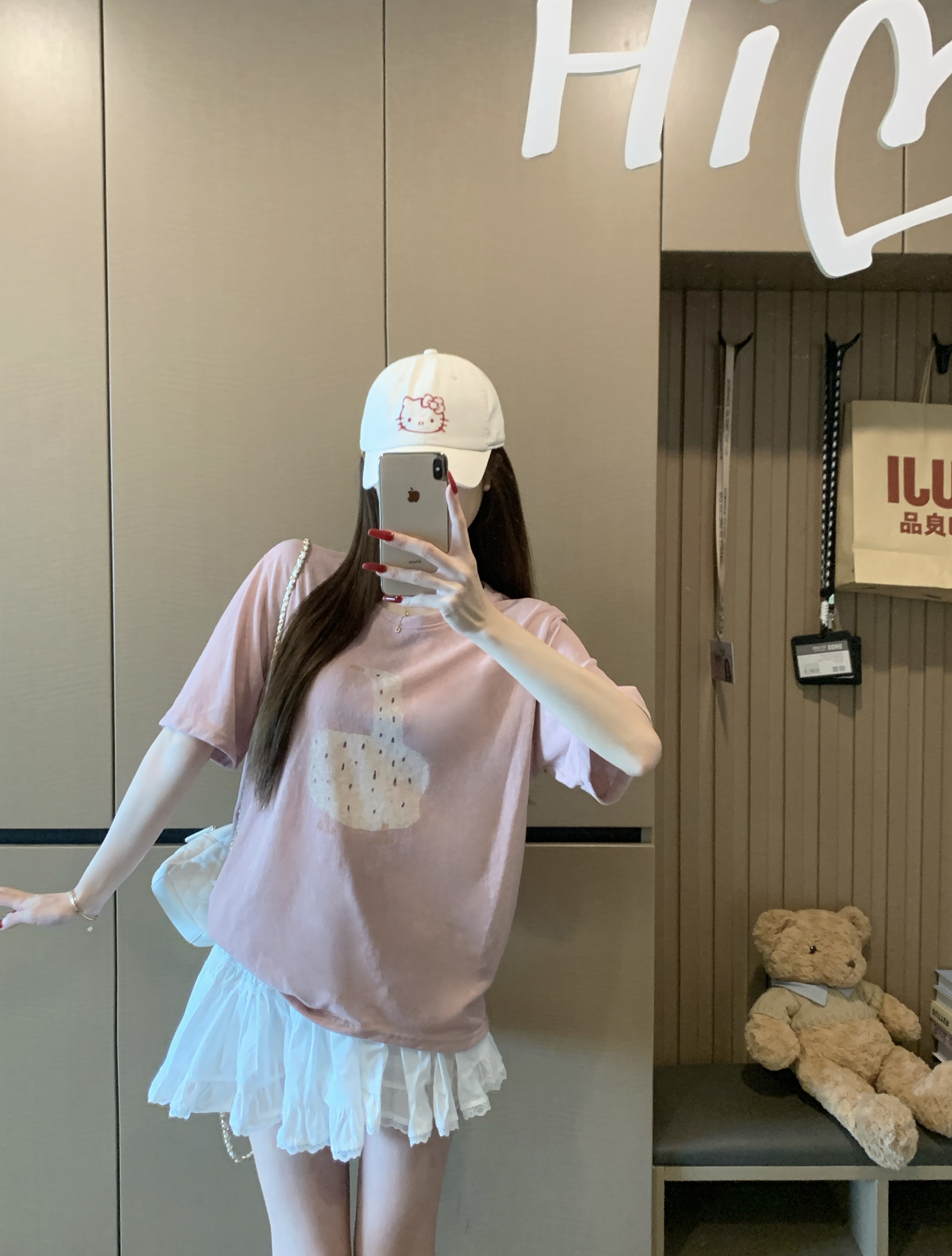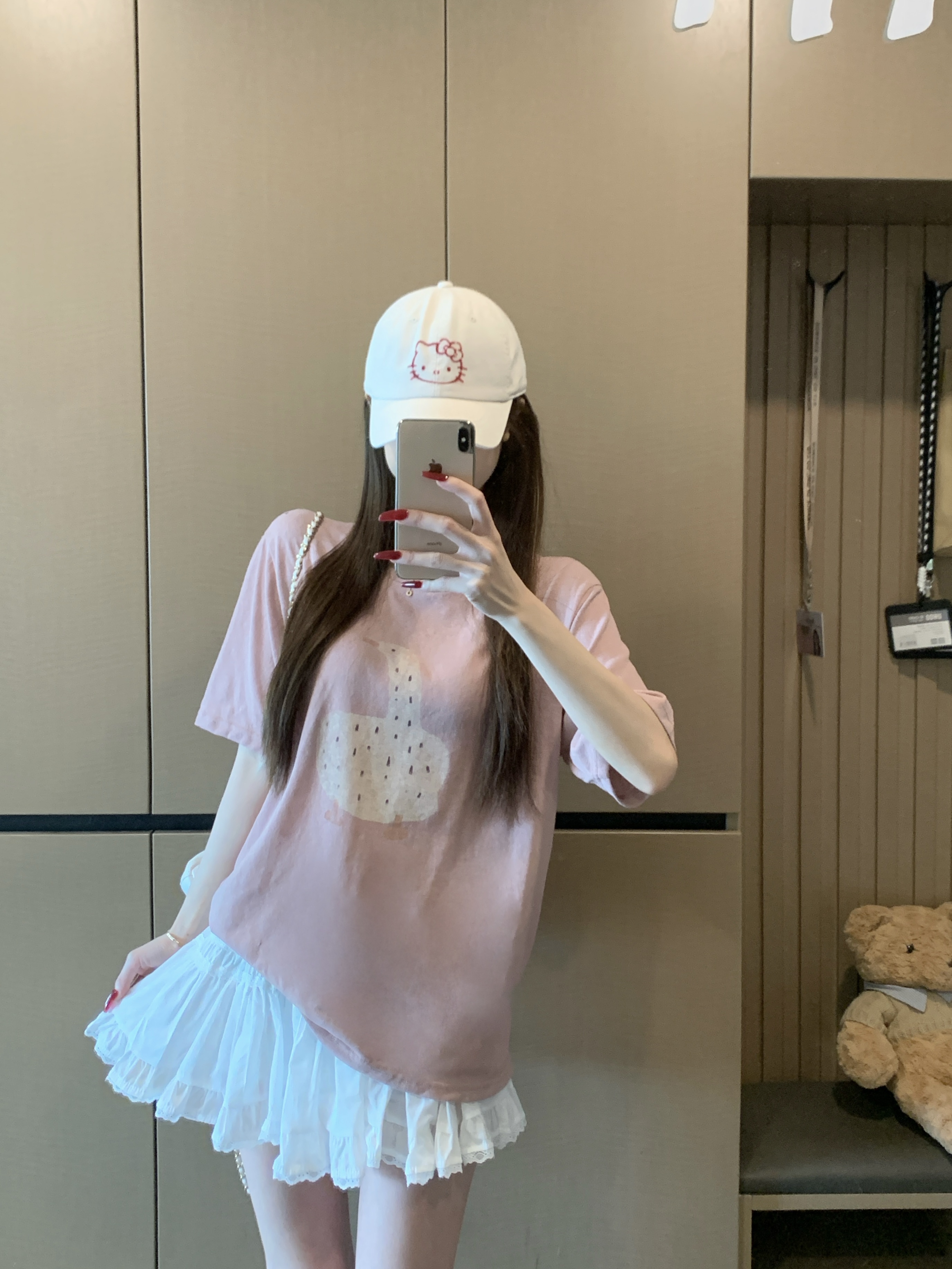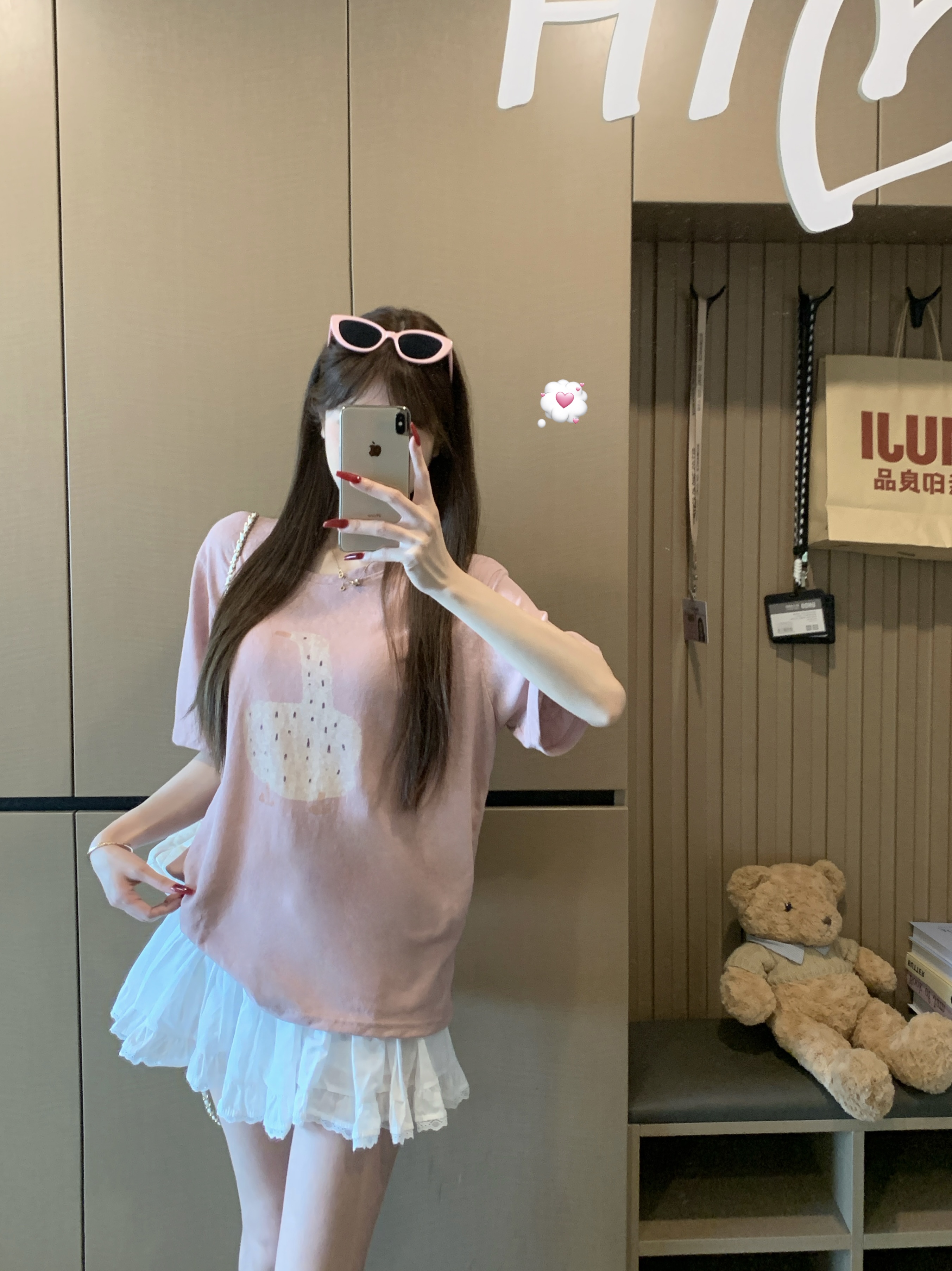 실사 레이스 체크무늬 반팔 여성 셔츠 여름 패치워크 하이웨이스트 루즈핏 한 마디 중간 길이 치마 세트