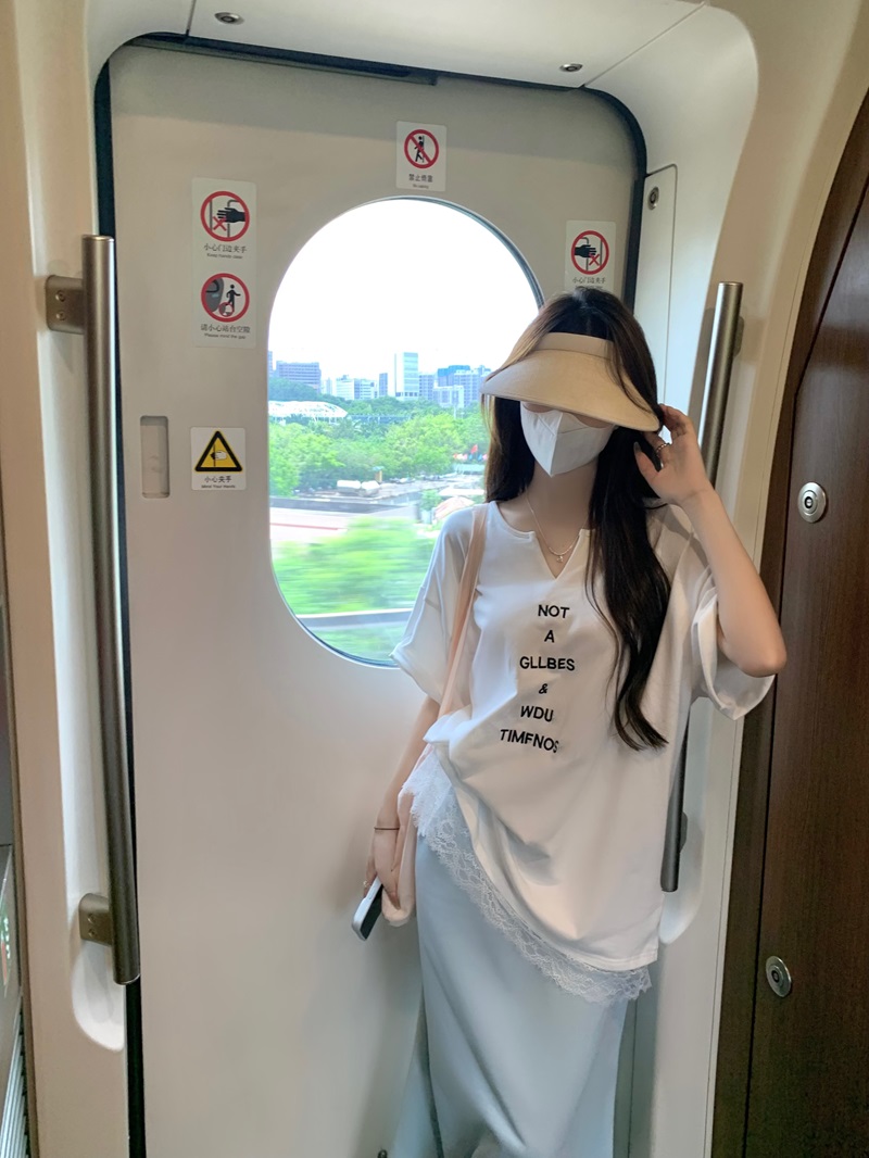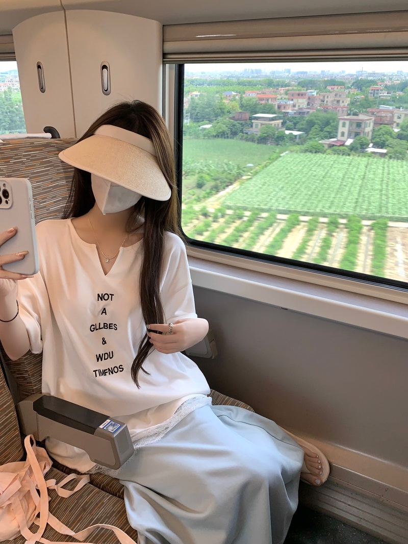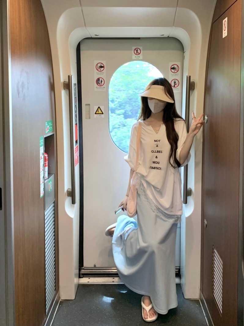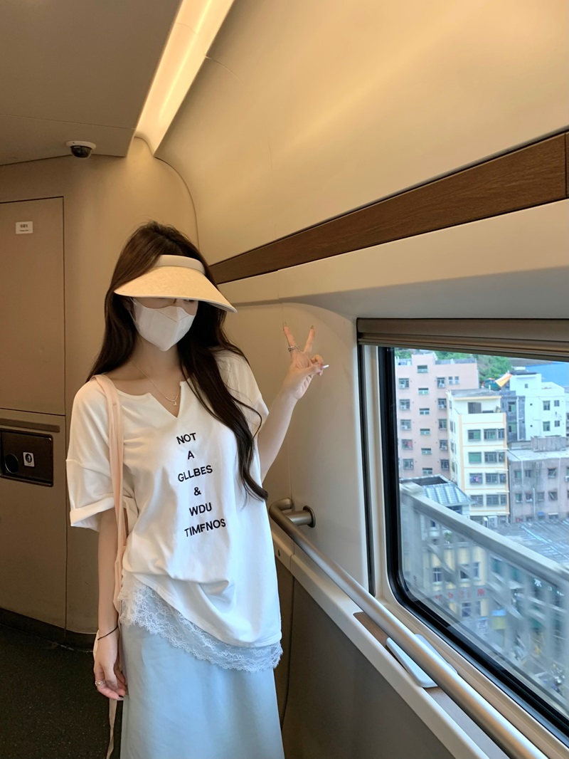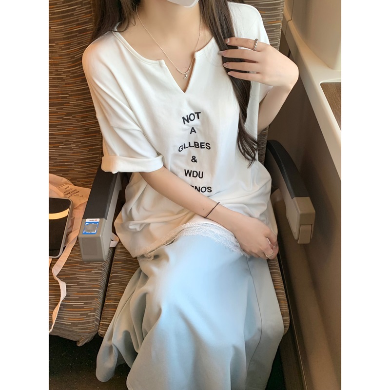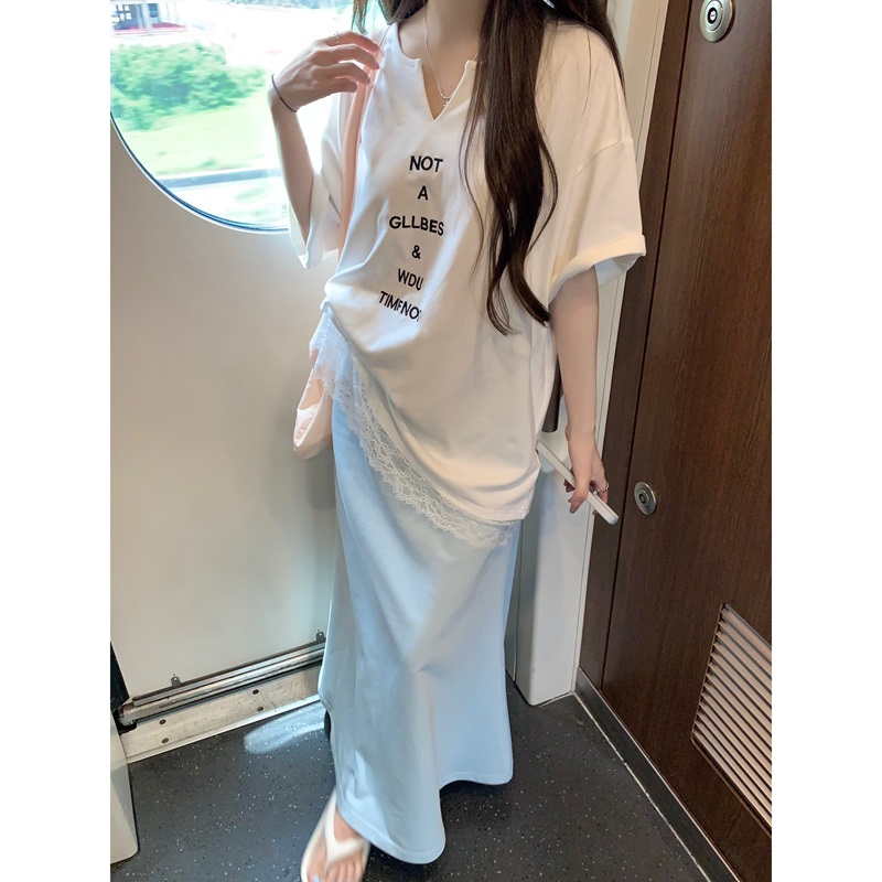 실사 정가 여름 레이스 조각 알파벳 자수 티셔츠 품격 캐주얼 밴딩 하이웨이스트 펌프 로프 반신 스커트