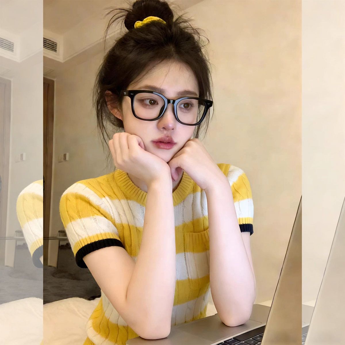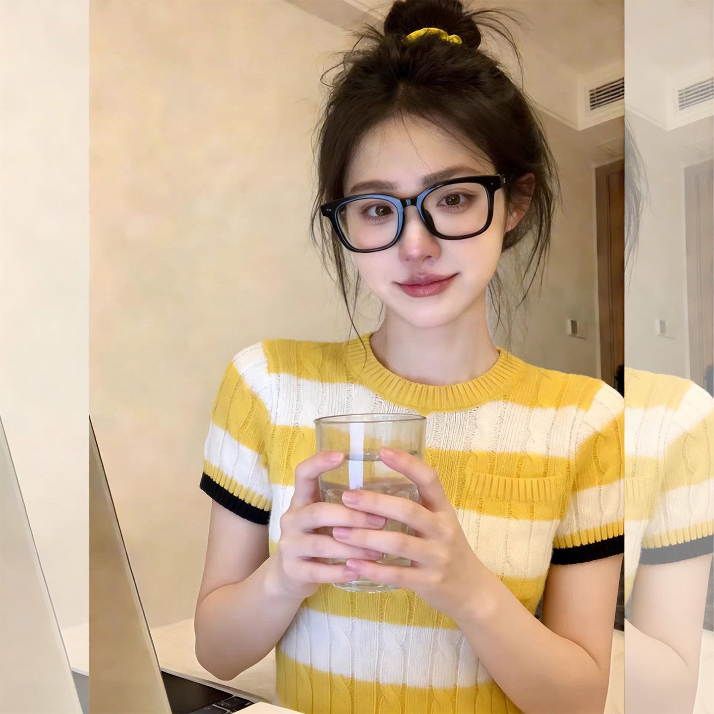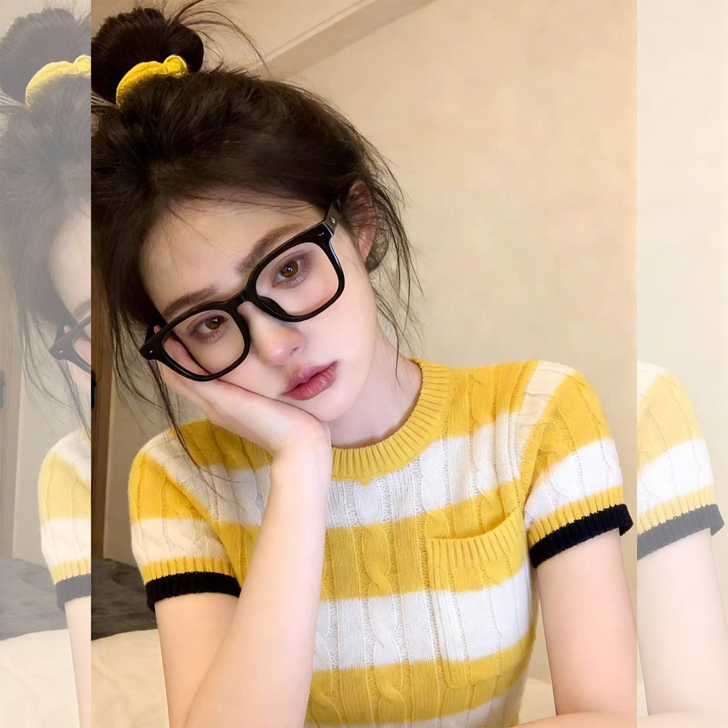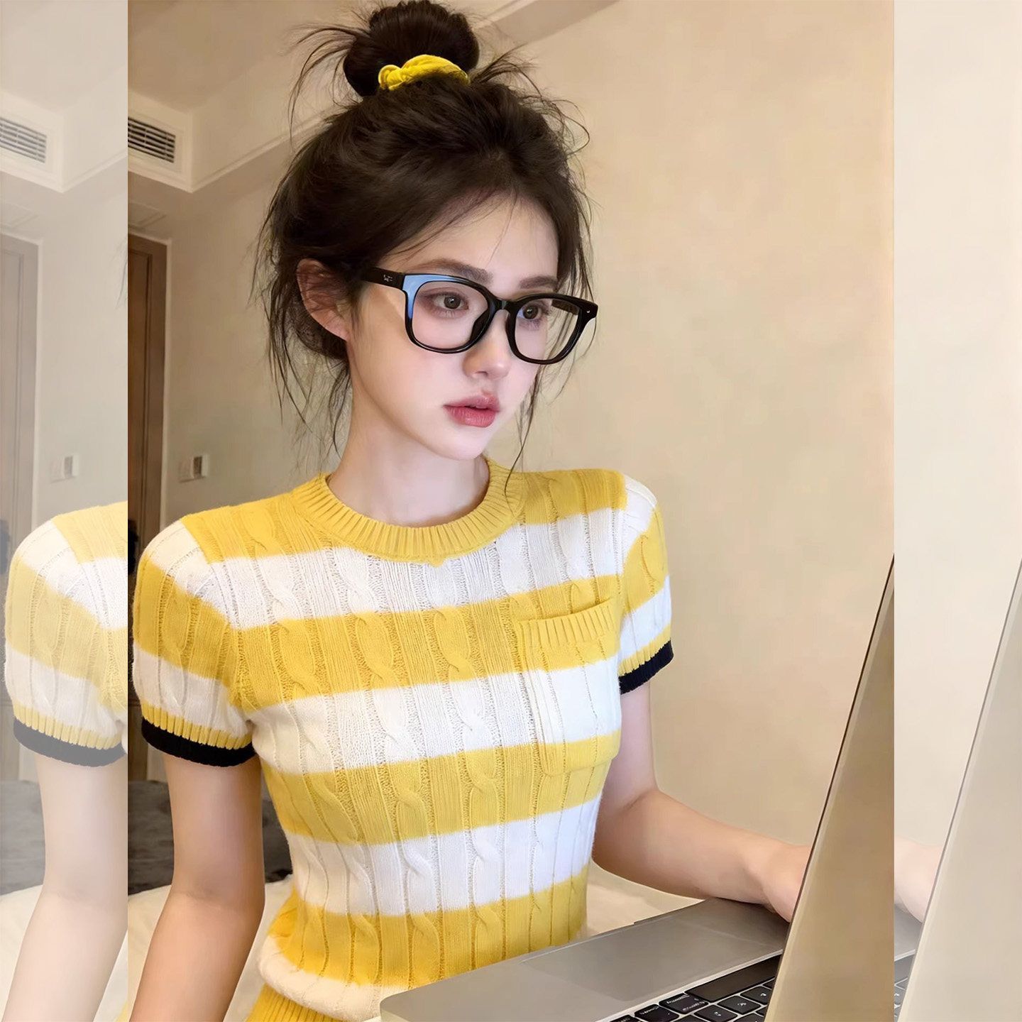 배색 스트라이프 막대기 가방 라운드 넥 반팔 니트 스웨터 여성 봄 캐주얼 바람 몸매 가꾸기 슬림해 보이는 풀오버 맨위