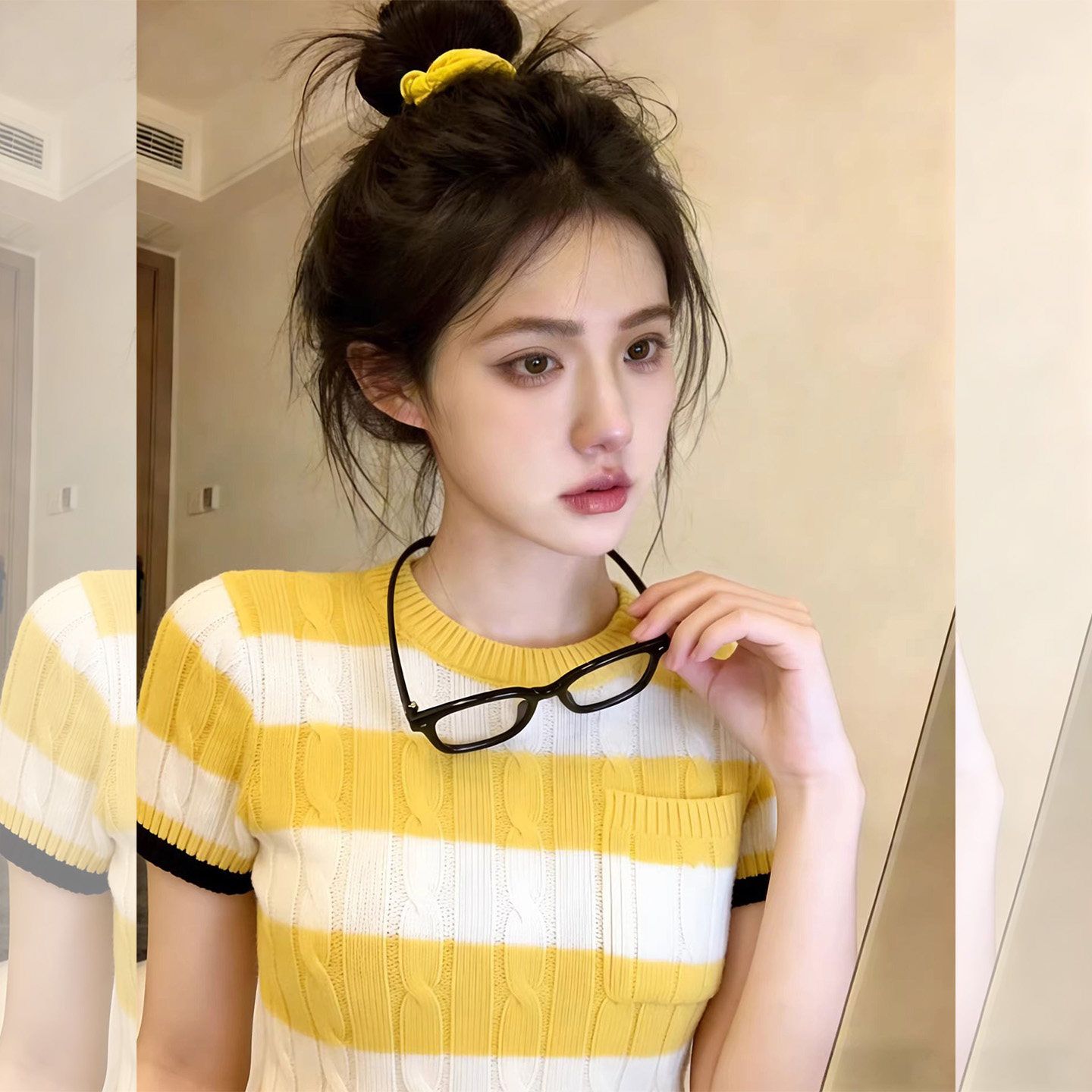 순면 리브 작은 키 쇼트 스타일 반팔 티셔츠 여성 여름 몸매 가꾸기 한국 스타일 레이스 나비 매듭 u 칼라 맨위 트렌디