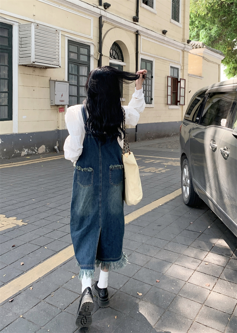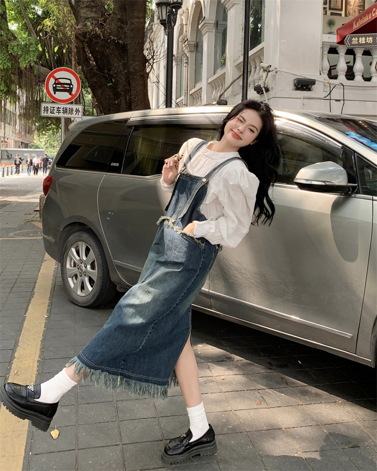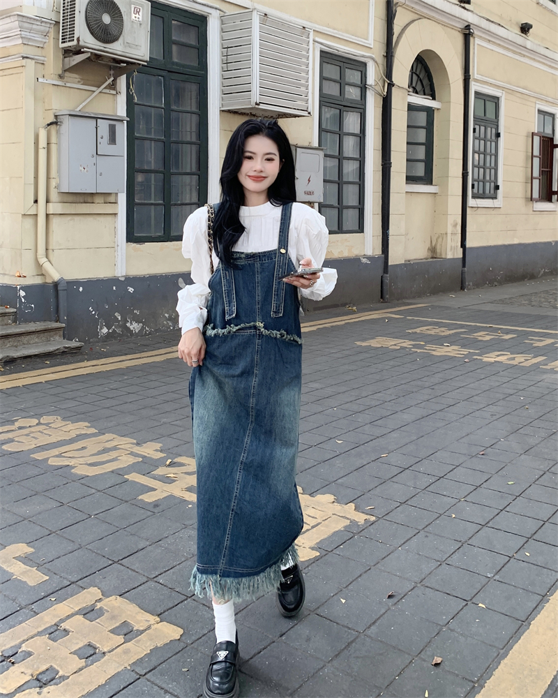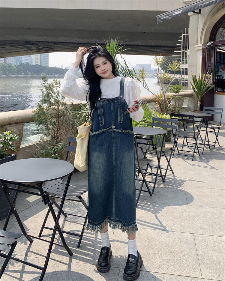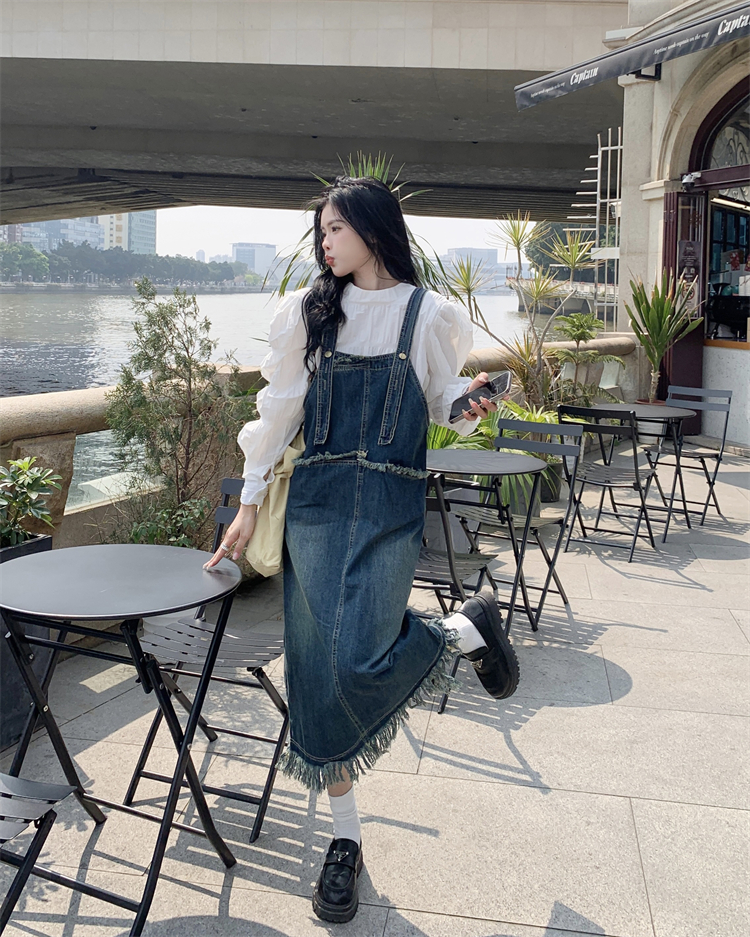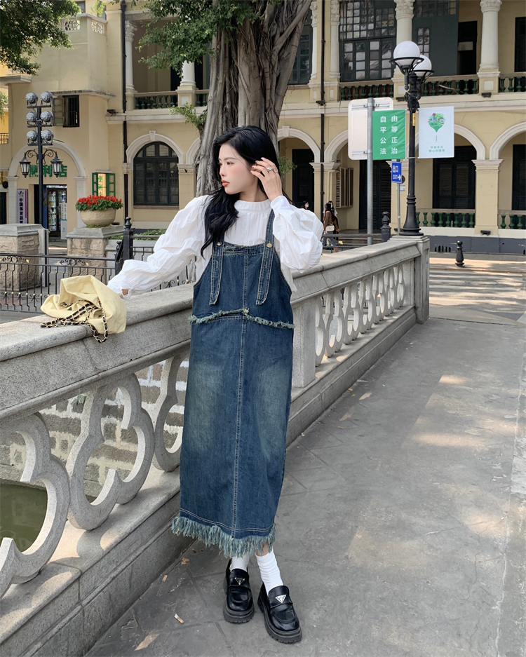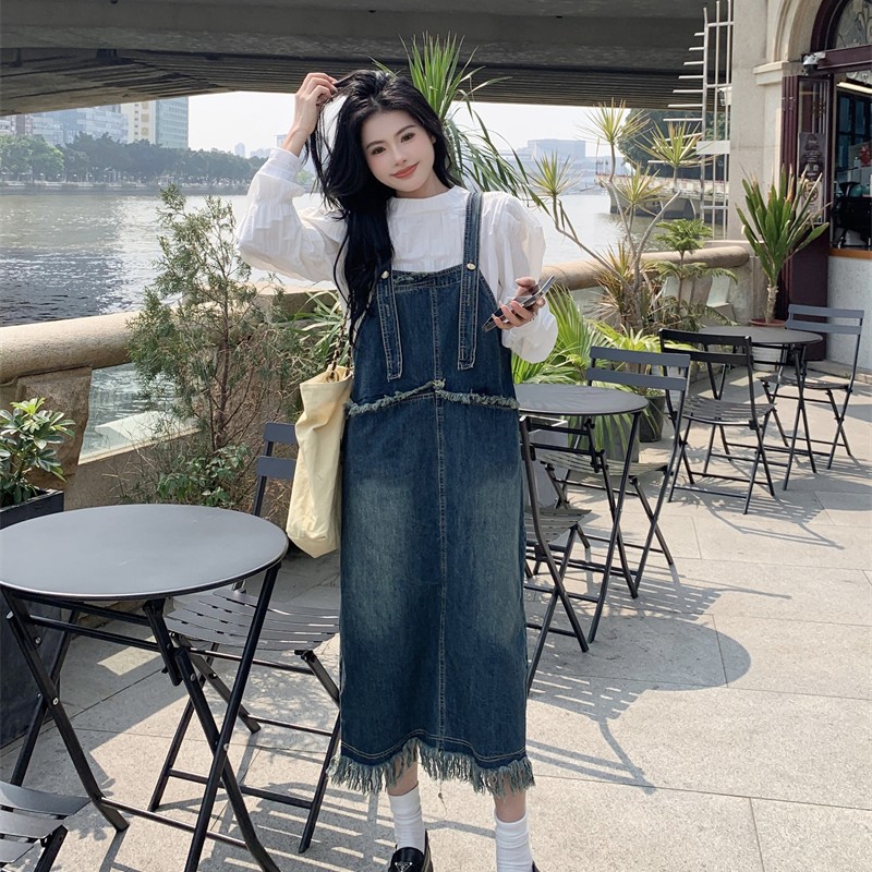실사 빅 사이즈 여성 의류 거친 가장자리 디자인 센스 빅 포켓 데님 멜빵 드레스 술 레트로 슬림해 보이는 멜빵 스커트