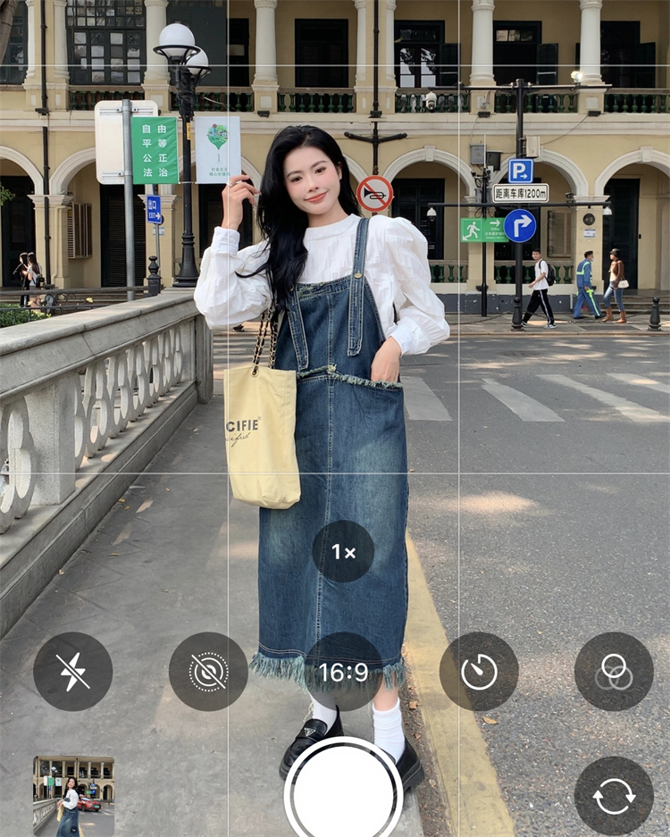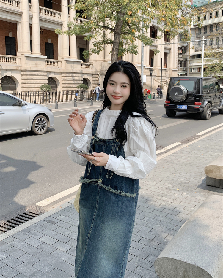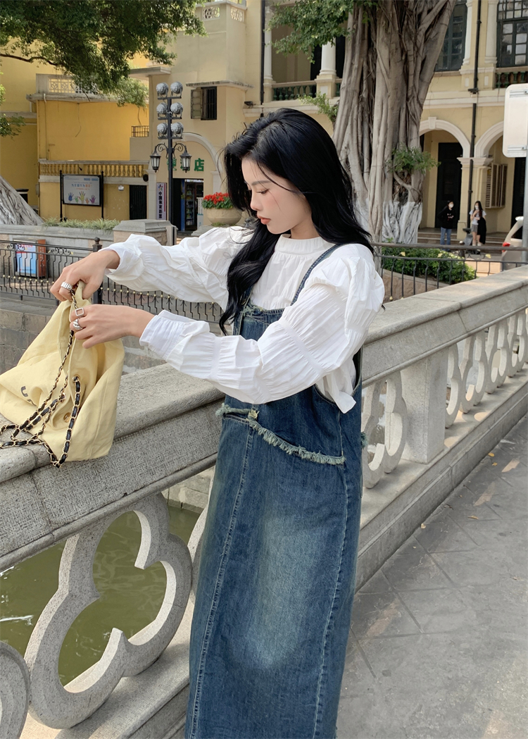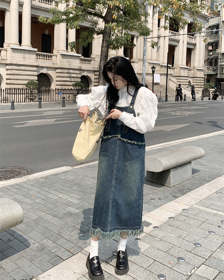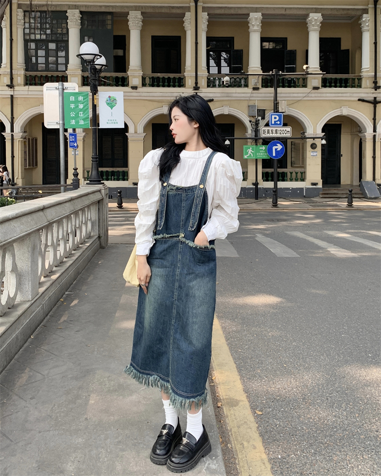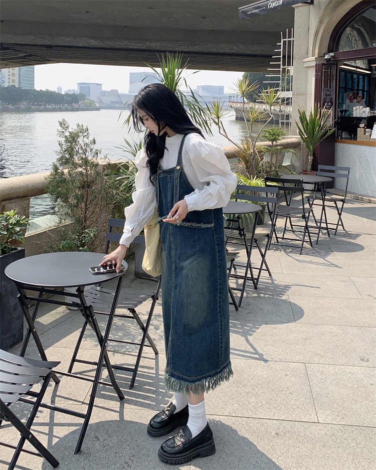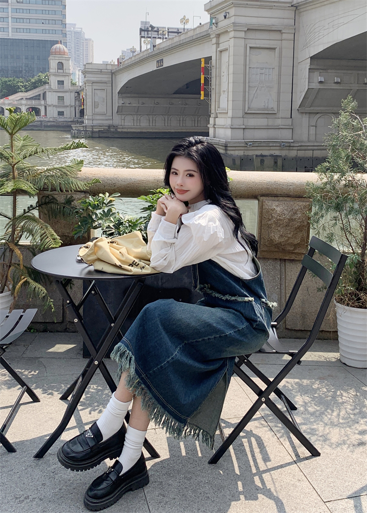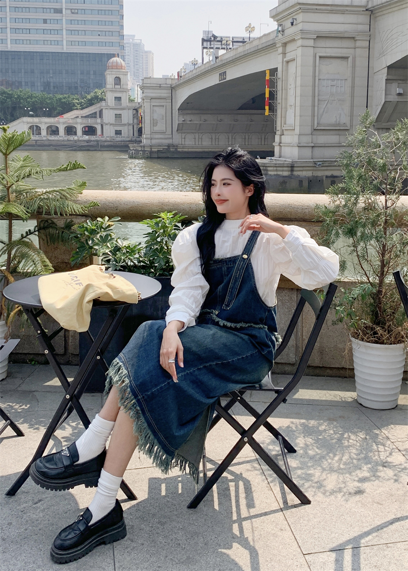 실사 빅 사이즈 여성 의류 거친 가장자리 디자인 센스 빅 포켓 데님 멜빵 드레스 술 레트로 슬림해 보이는 멜빵 스커트