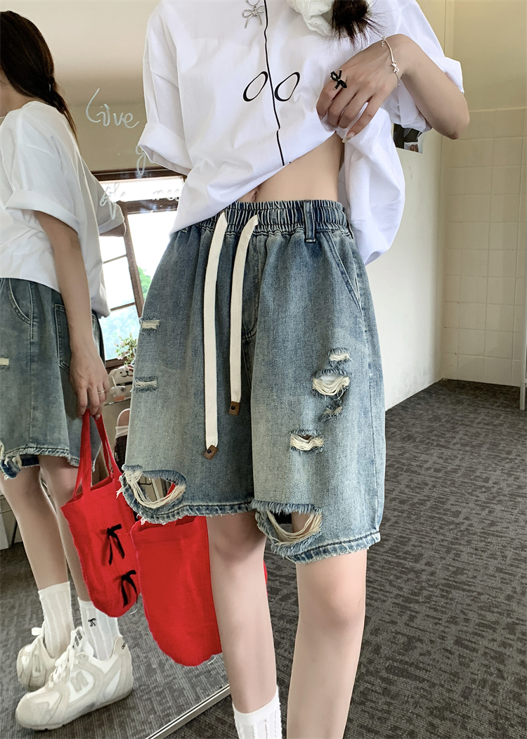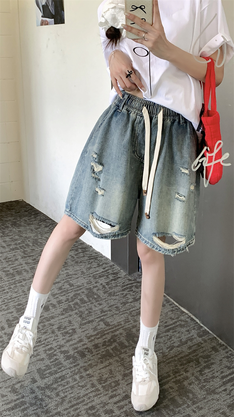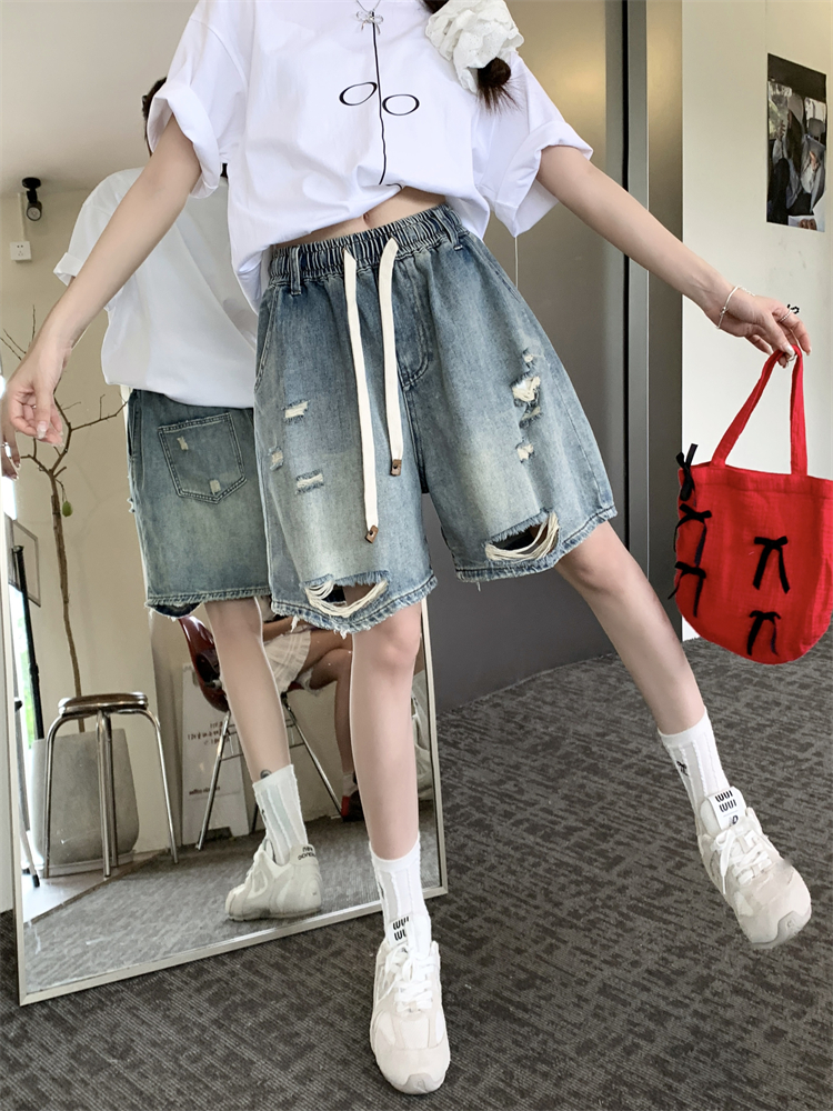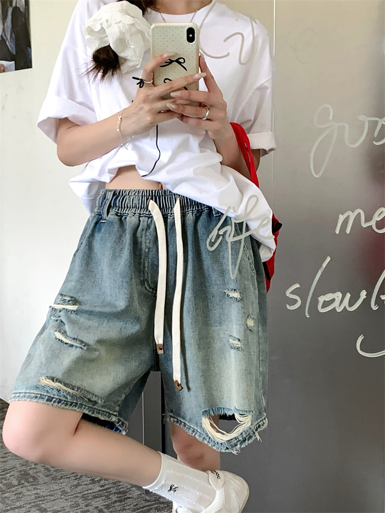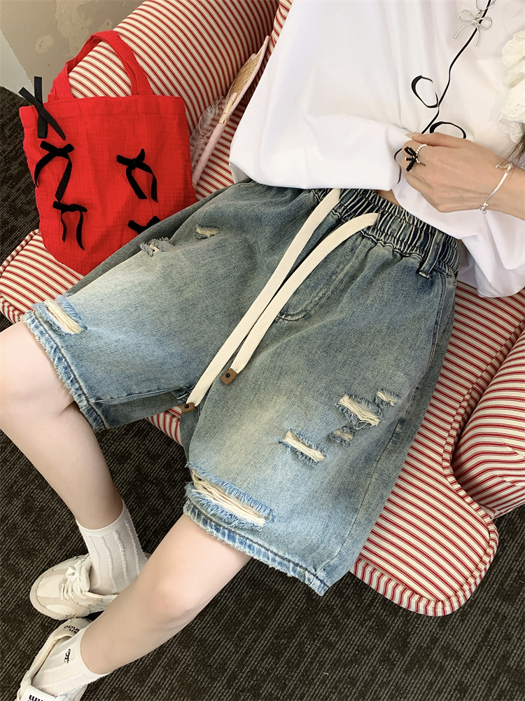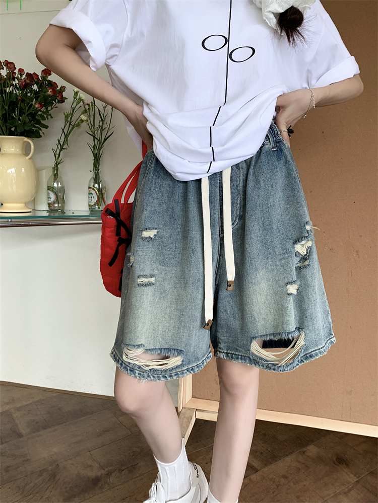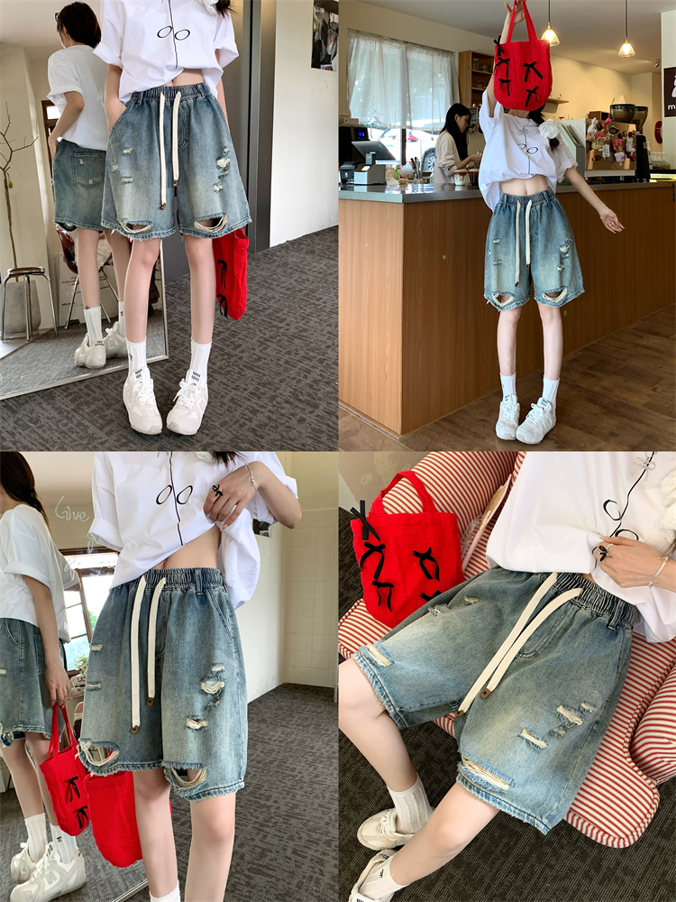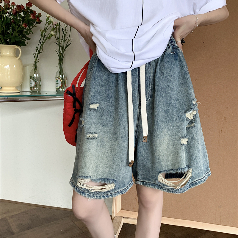 실사 빅 사이즈 레이스업 허리밴드 워시 물 마 오래된 찢어진 부분 5 점 청바지 루즈핏 캐주얼 스트레이트 넓은 다리가 짧다. 바지