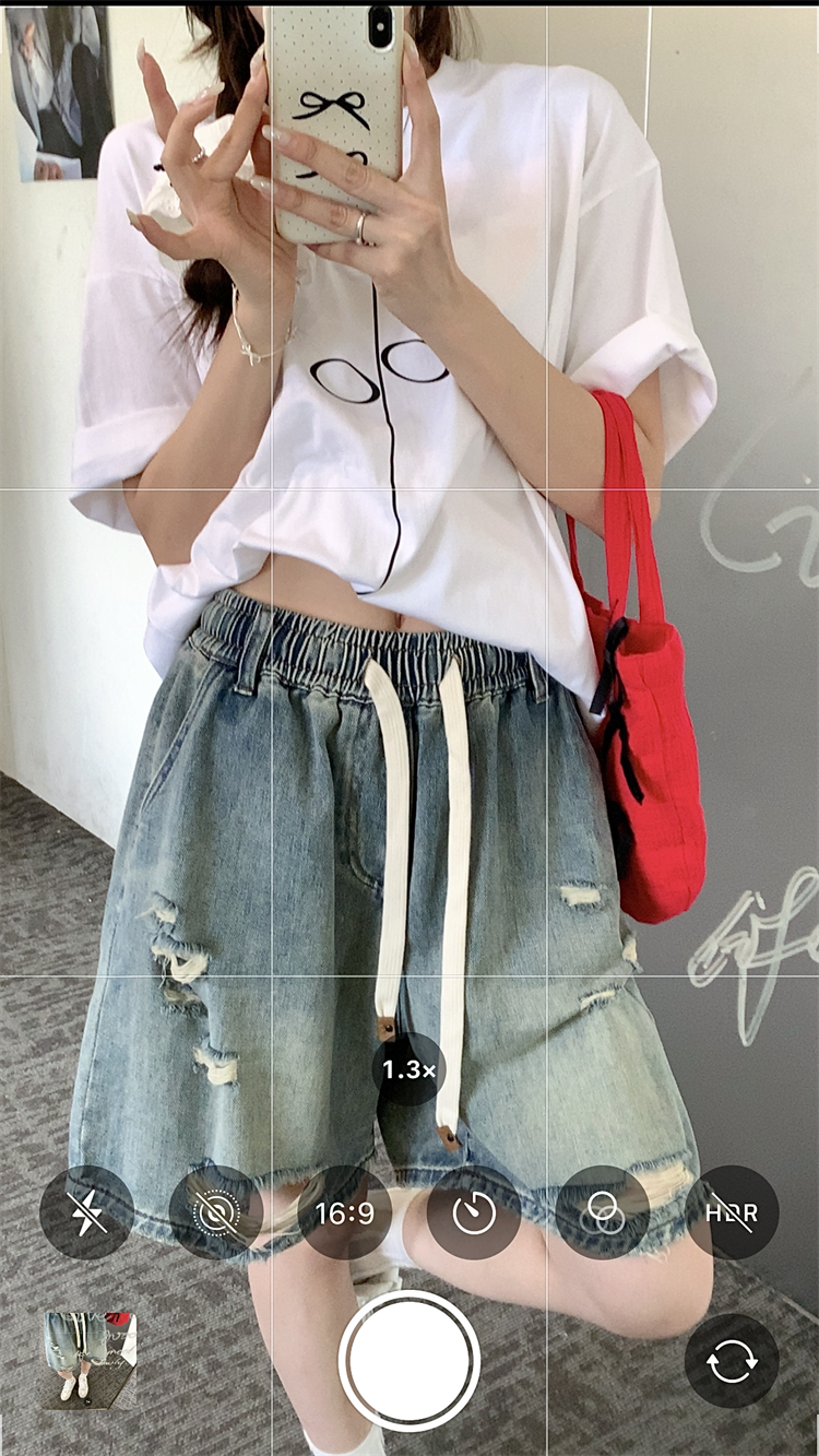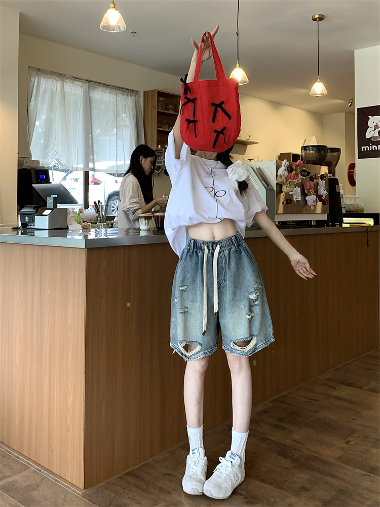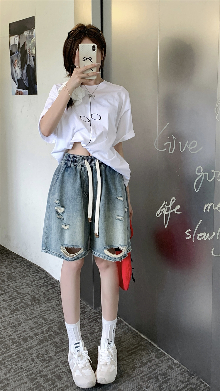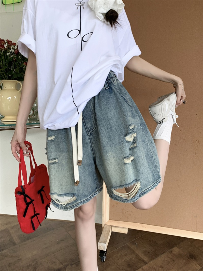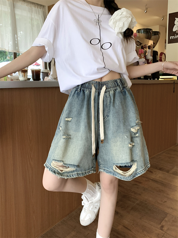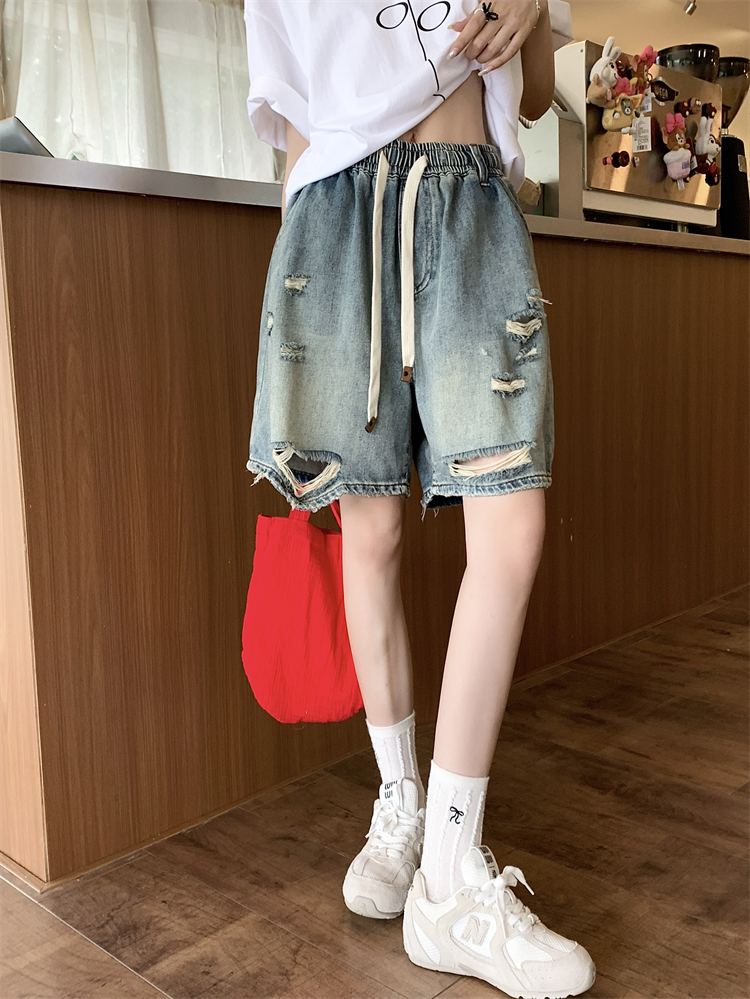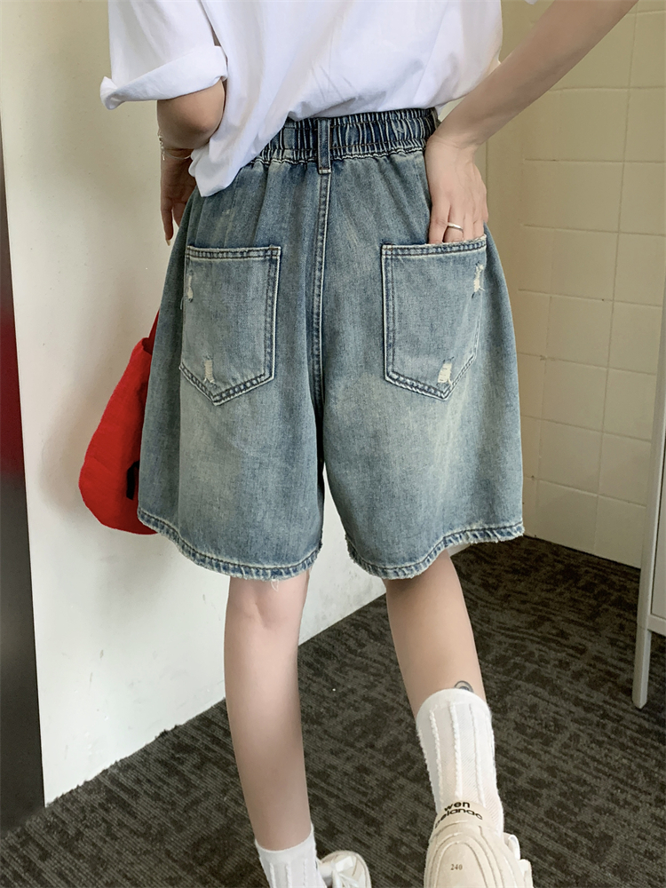 실사 빅 사이즈 레이스업 허리밴드 워시 물 마 오래된 찢어진 부분 5 점 청바지 루즈핏 캐주얼 스트레이트 넓은 다리가 짧다. 바지
