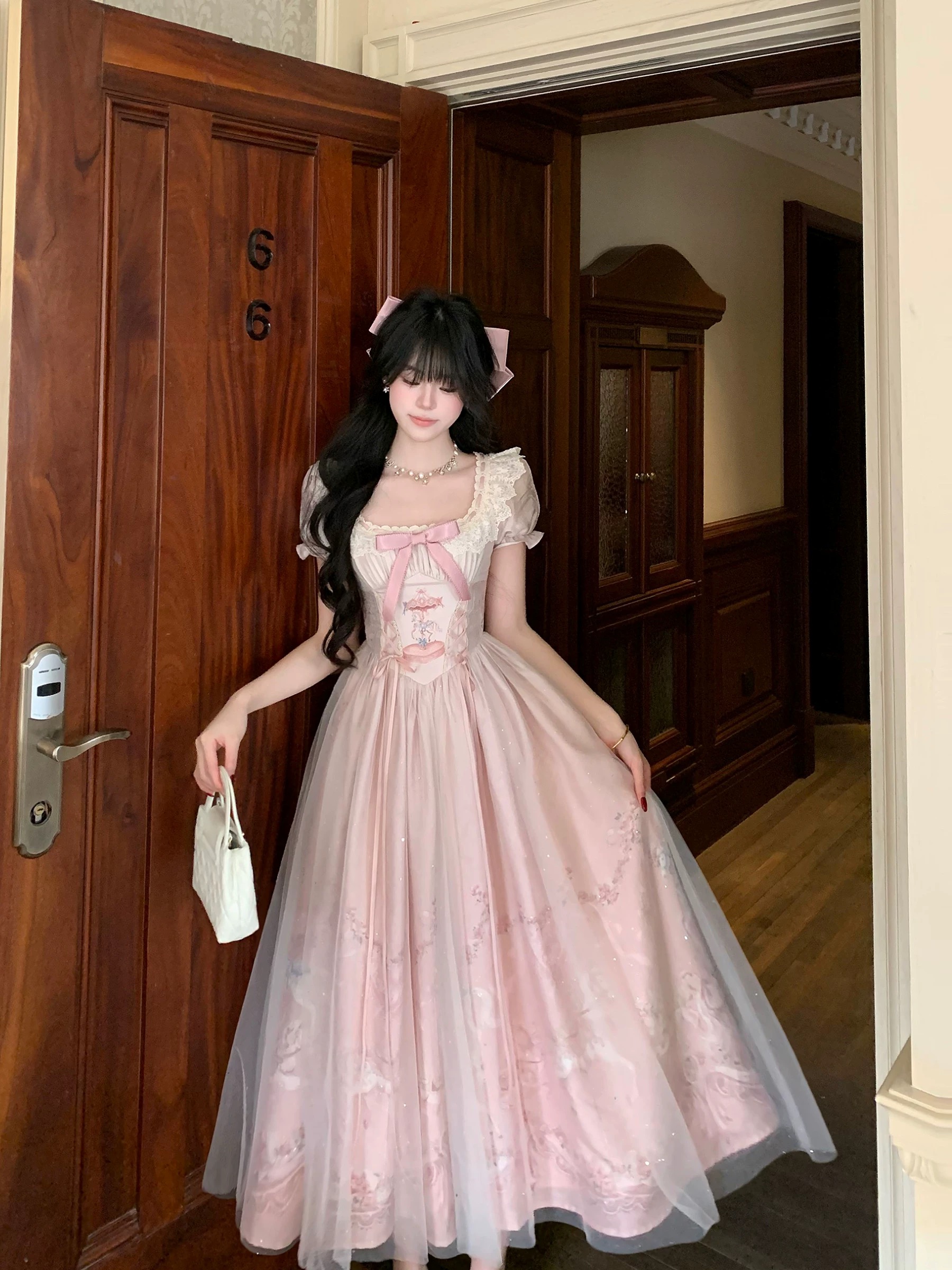 실사 중 사쿠라 분말 카니발 슈퍼 요정 메시 원단 프린트 도망자 공주 드레스