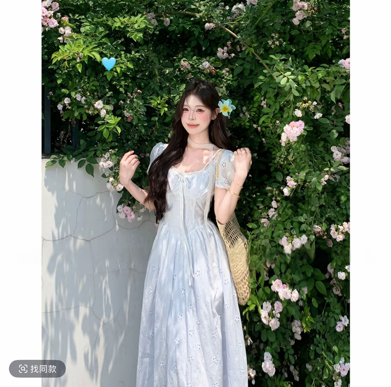 실사 중 비밀 상황 소녀 여름 단색 홀로우 아웃 자수 작은 꽃무늬 롱 스커트 허리 수축 슬림해 보이는 드레스