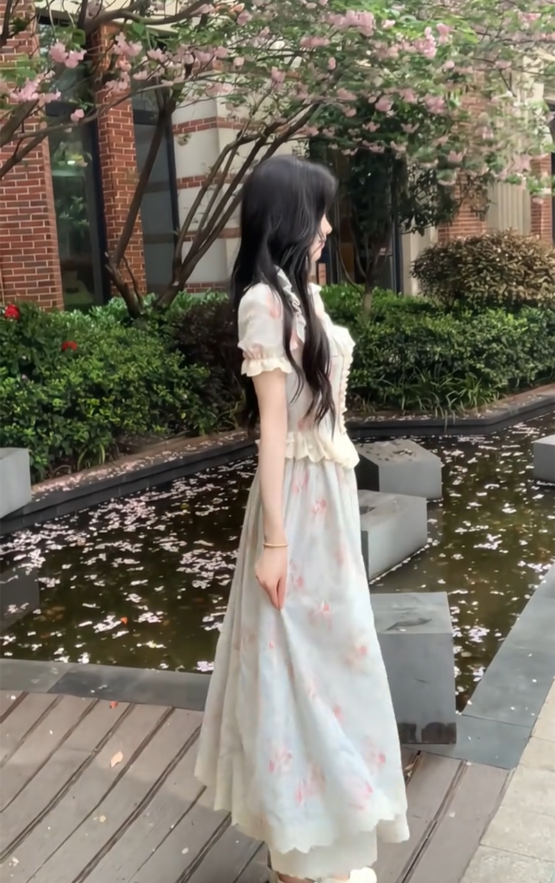 실사 중 여름 달콤한 스타일 프릴 작은 꽃무늬 롱 스커트 허리 수축 스트랩 드레스