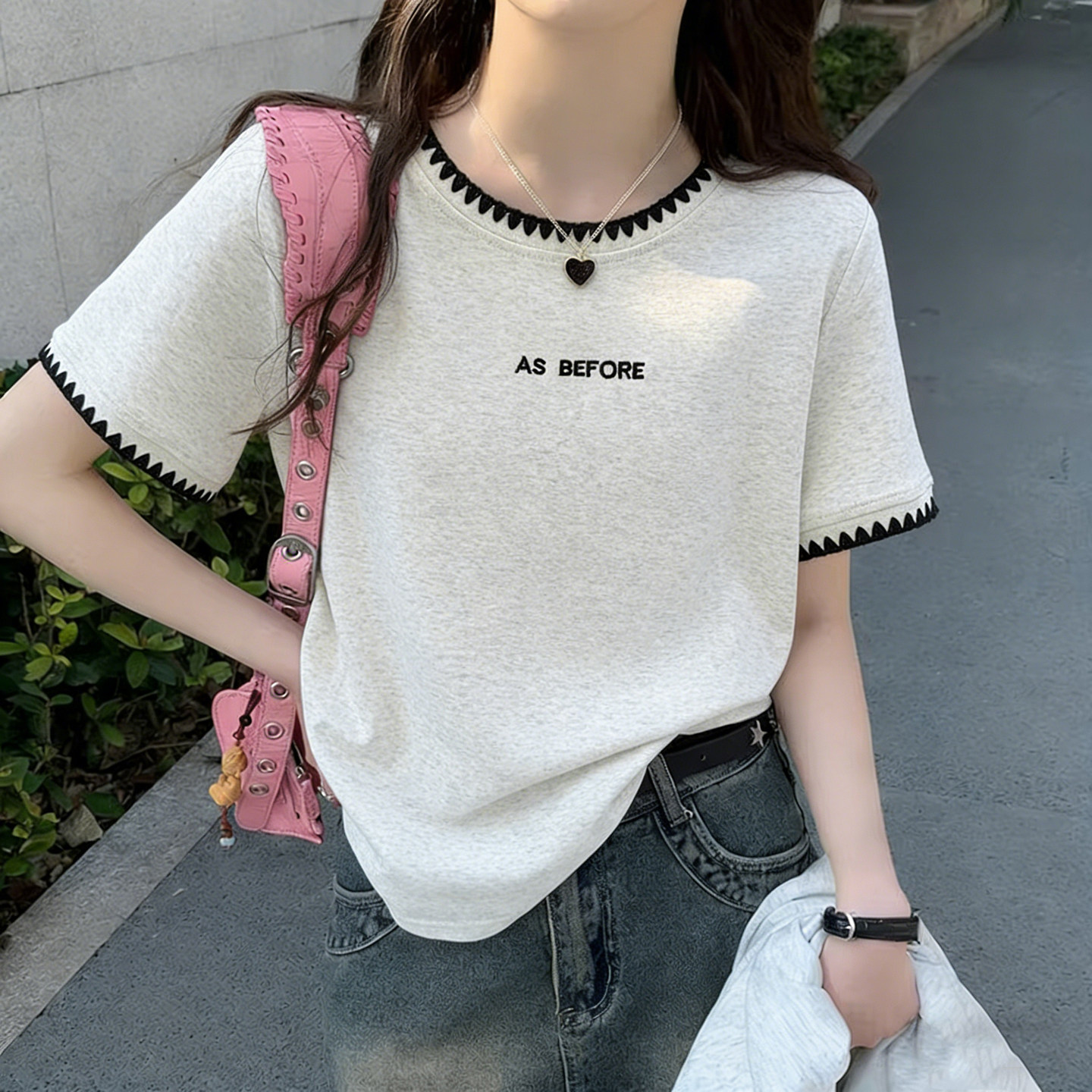 경관 그림 흔들어서 톤 품질 세 표준 핑크색 학원 스타일 반팔 여성 셔츠 여름 프랑스식 다용도 맨위