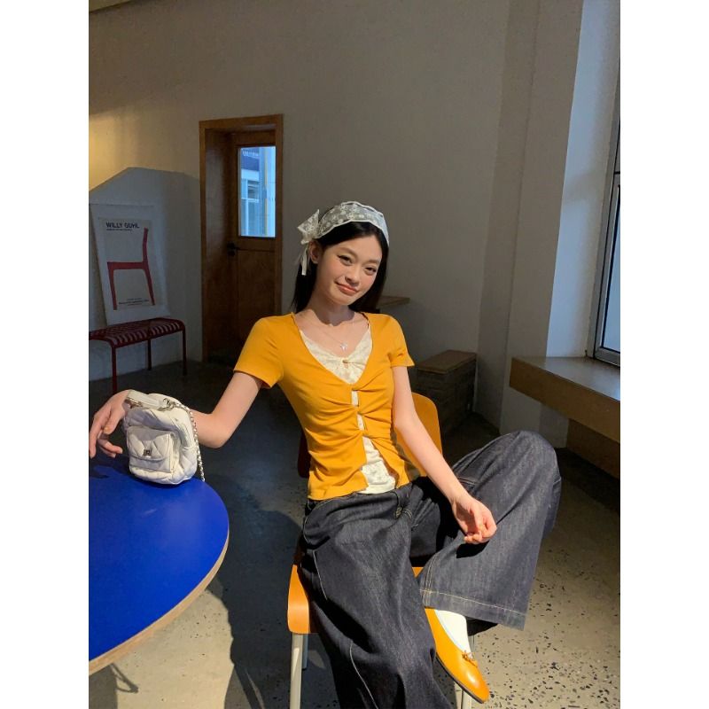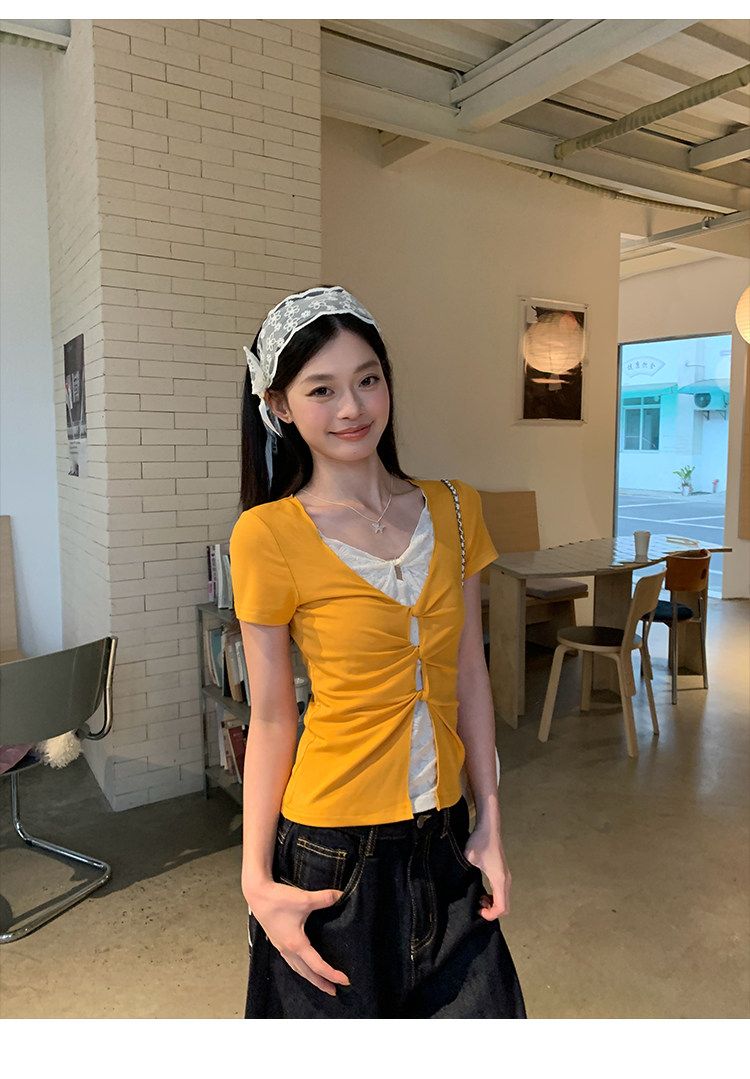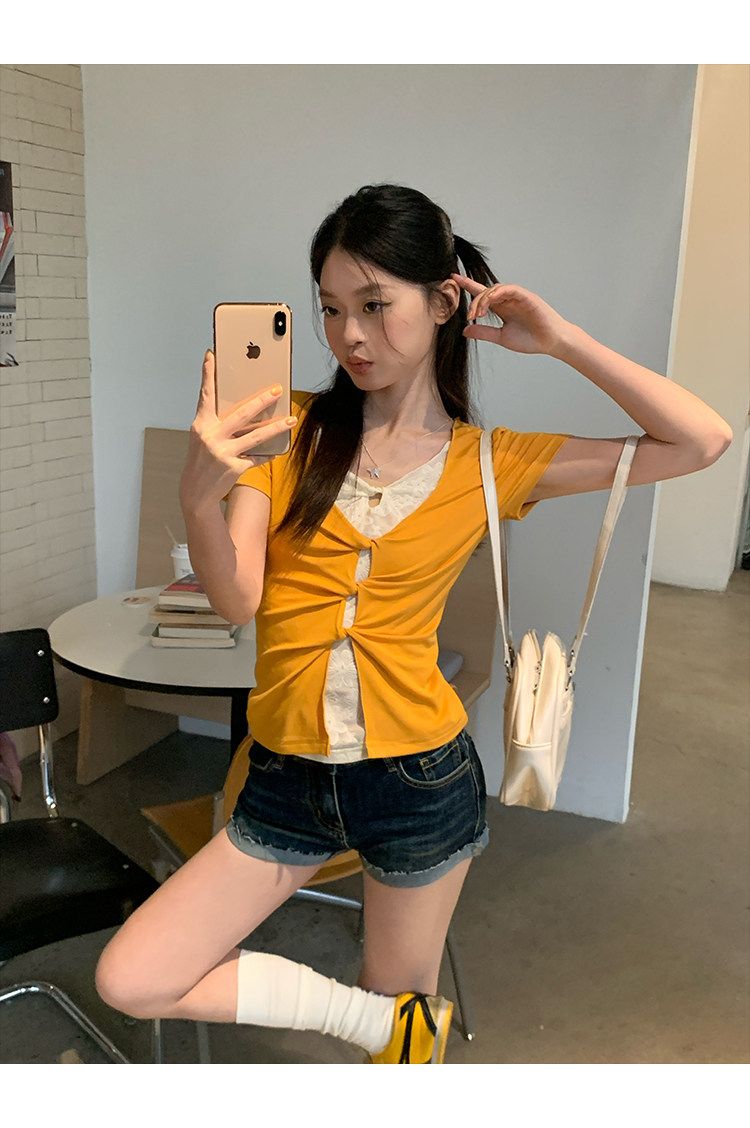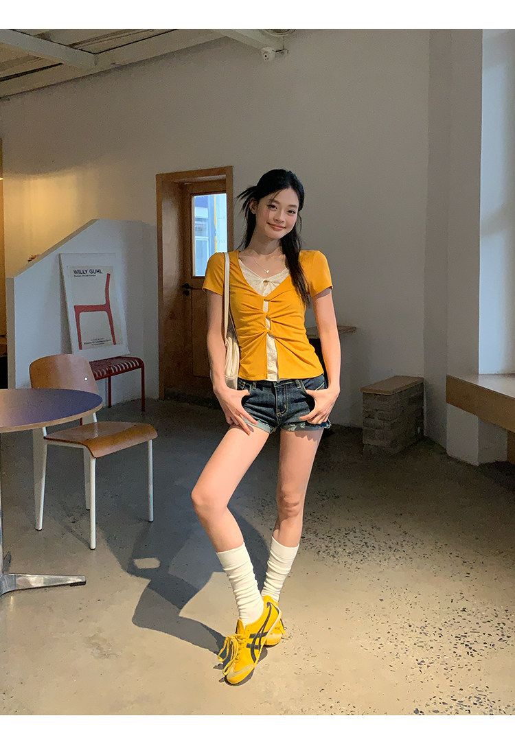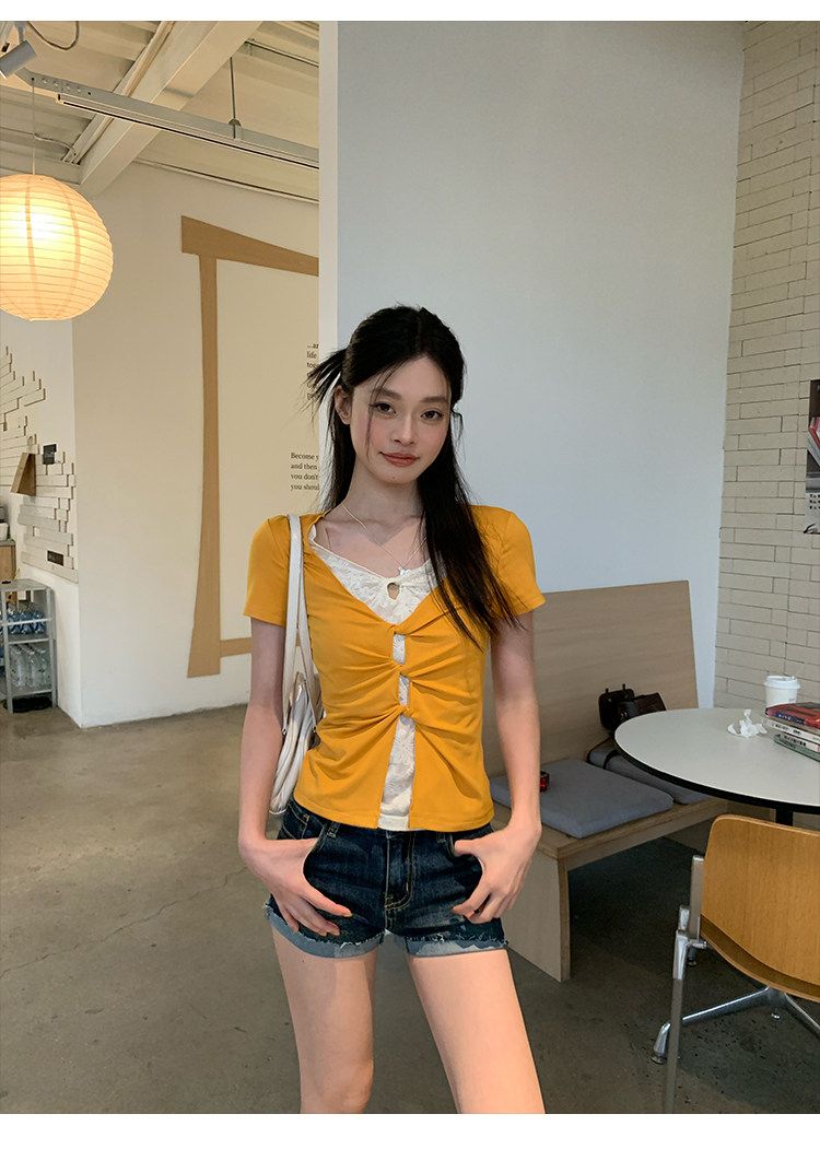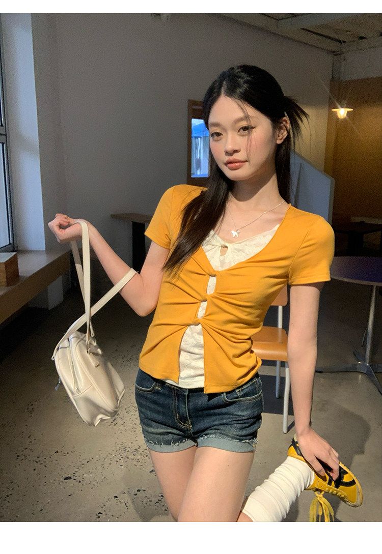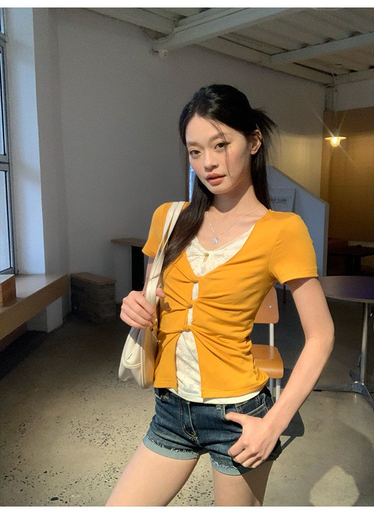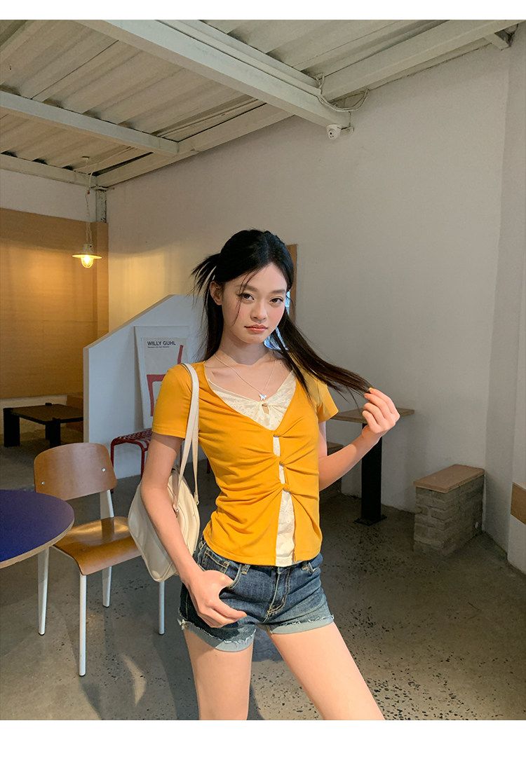 눈꽃 면 긍정적 인 어깨 페이크 레이어드 V넥 반팔 티셔츠 여성 여름 작은 대중 루즈핏 슬림해 보이는 느긋한 반소매 동정 맨위