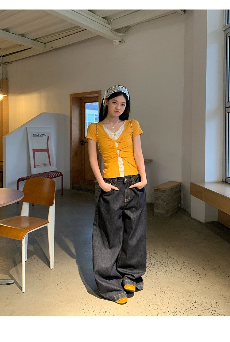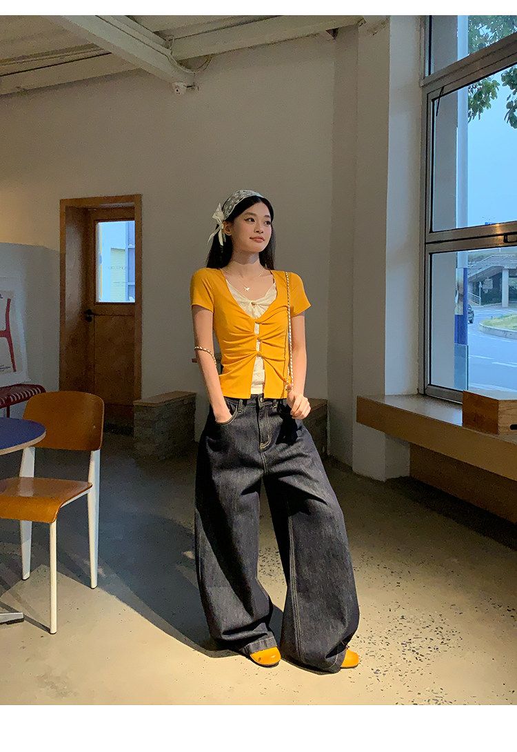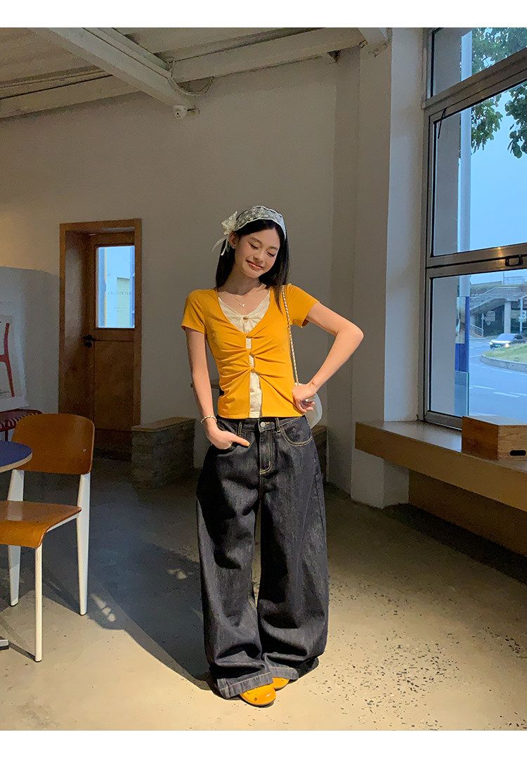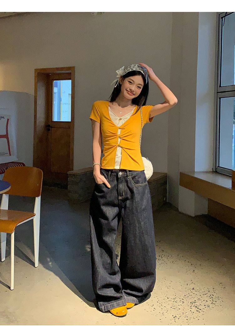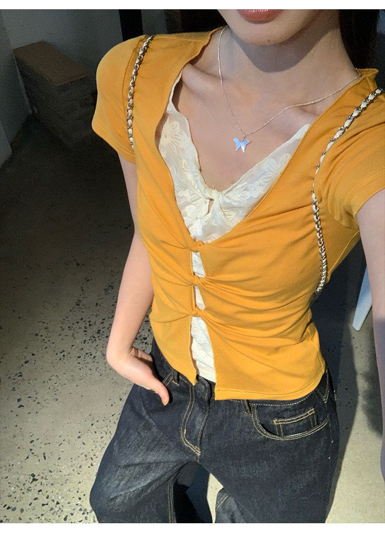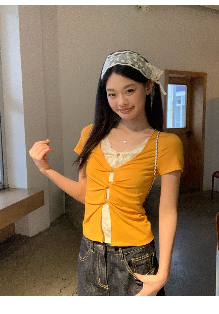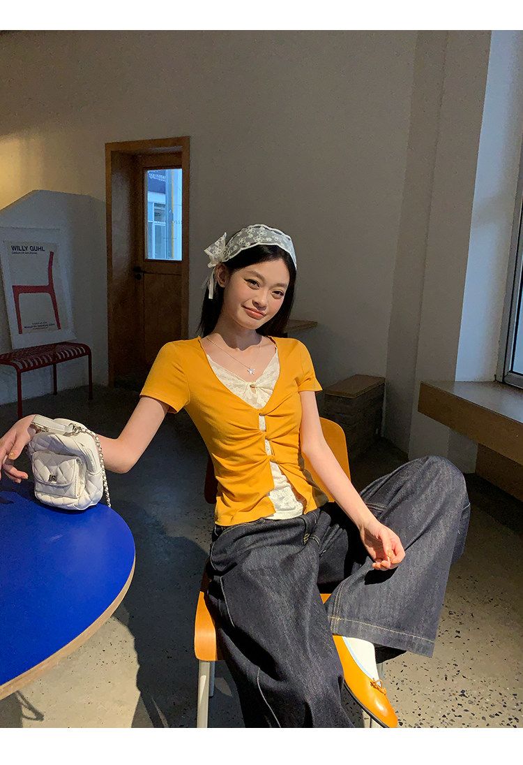 눈꽃 면 긍정적 인 어깨 페이크 레이어드 V넥 반팔 티셔츠 여성 여름 작은 대중 루즈핏 슬림해 보이는 느긋한 반소매 동정 맨위