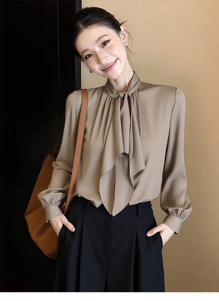 프랑스식 V넥 레이스업 허리 수축 셔츠 여성 긴 소매 화이트 고급 센스 슬림해 보이는 품격 다용도 출퇴근 연령 감소 맨위