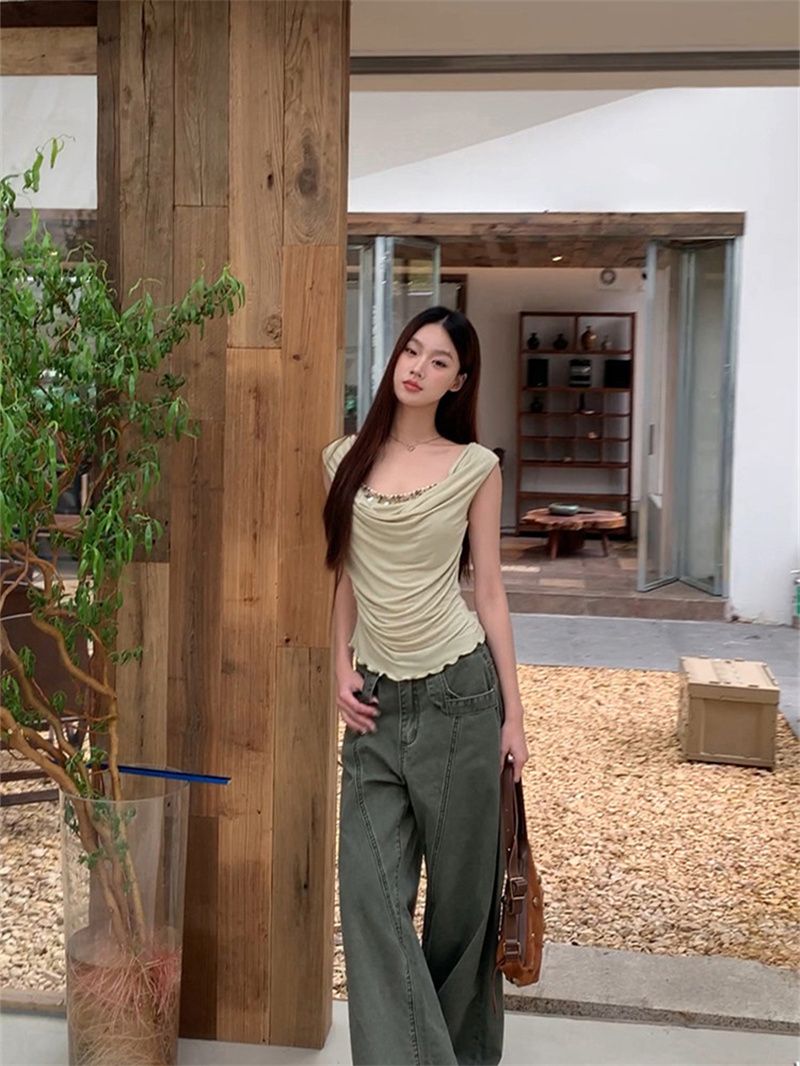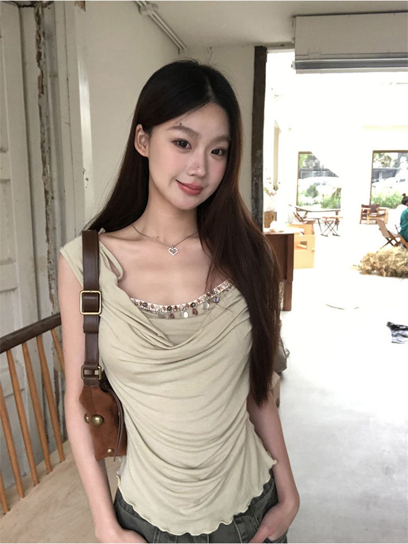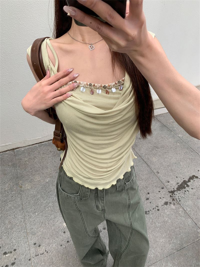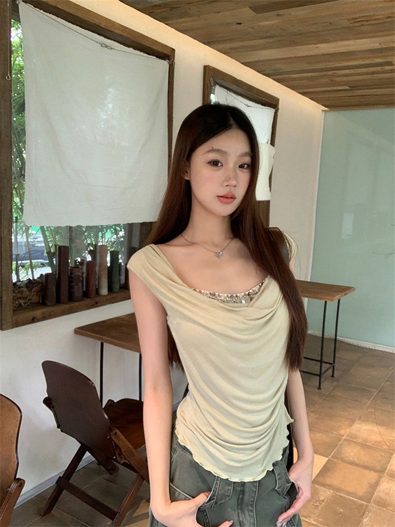 작은 키 홍콩 느낌 매듭 디자인 불규칙 반팔 티셔츠 여성 여름 달콤함 주름 몸매 가꾸기 쇼트 스타일 맨위