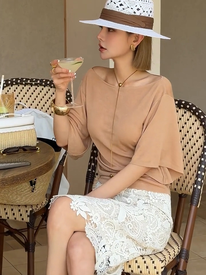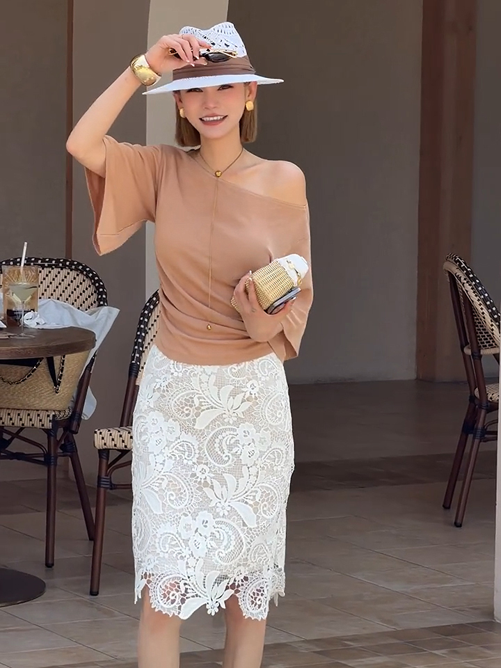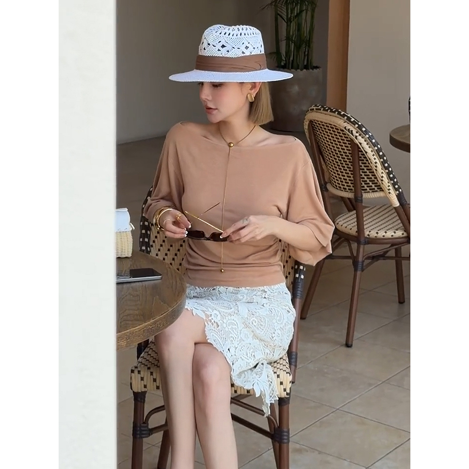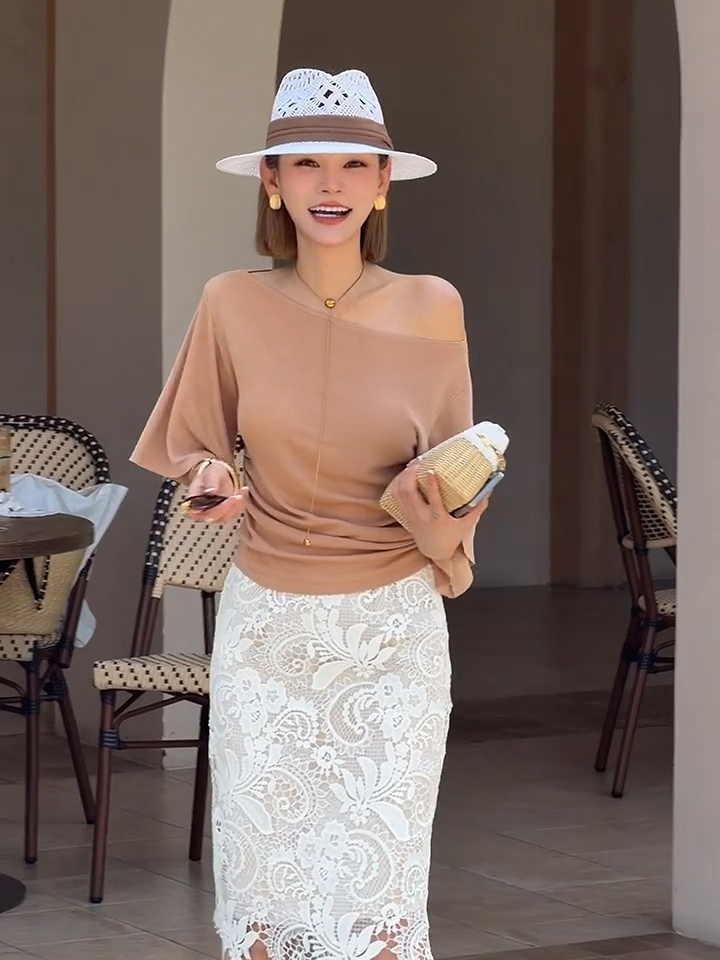 있음 도착 오프숄더 니트 맨위 반팔 디자인 센스 쇼트 스타일 티셔츠 부드러운 패션 한 마디 반신 스커트 세트