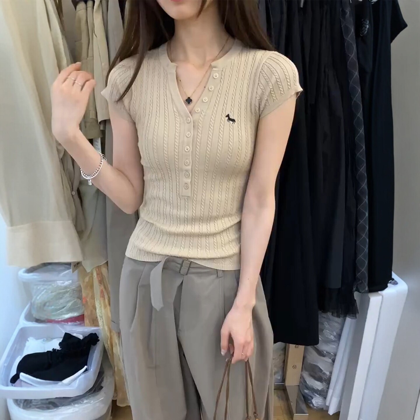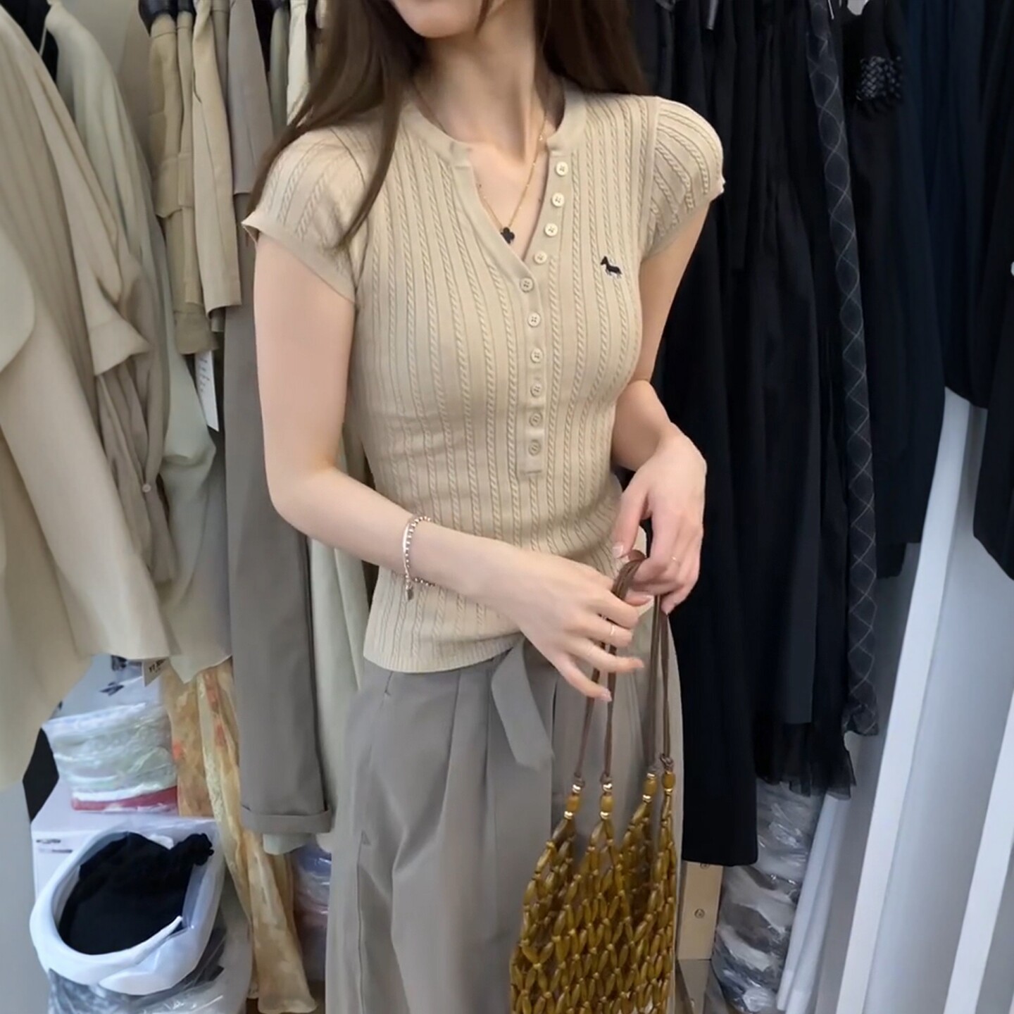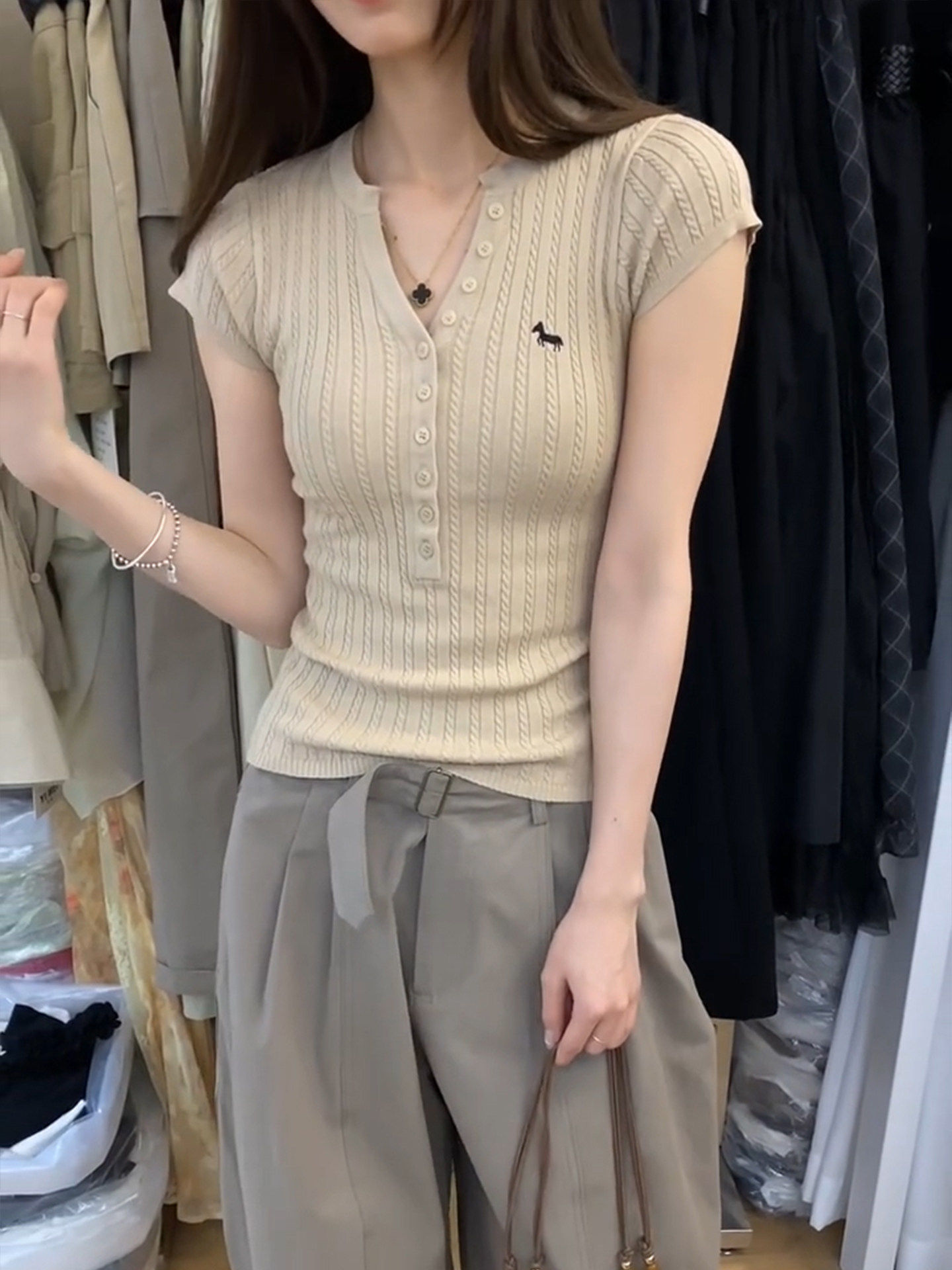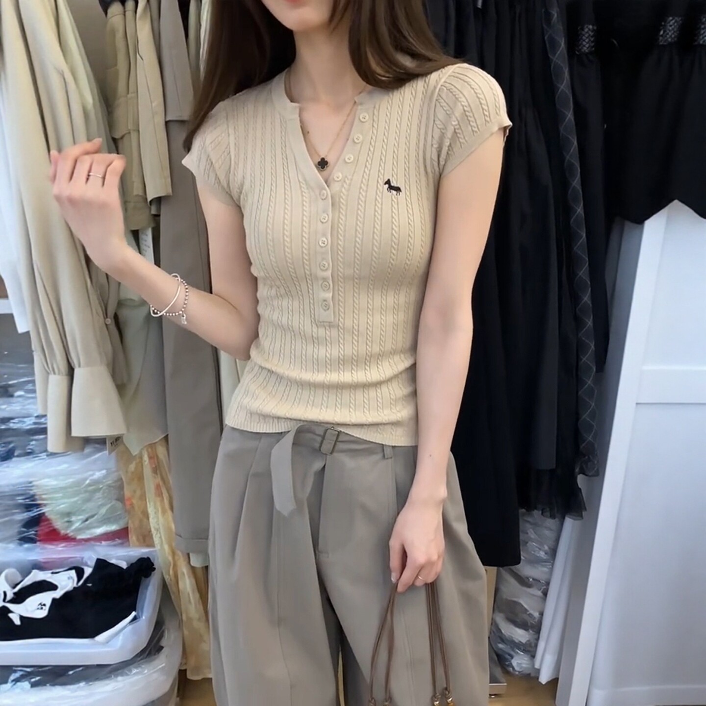 있음 도착 자수 V넥 반팔 니트 티셔츠 여성 여름 몸매 가꾸기 슬림해 보이는 핫걸 쇼트 스타일 긍정적 인 어깨 작은 맨위