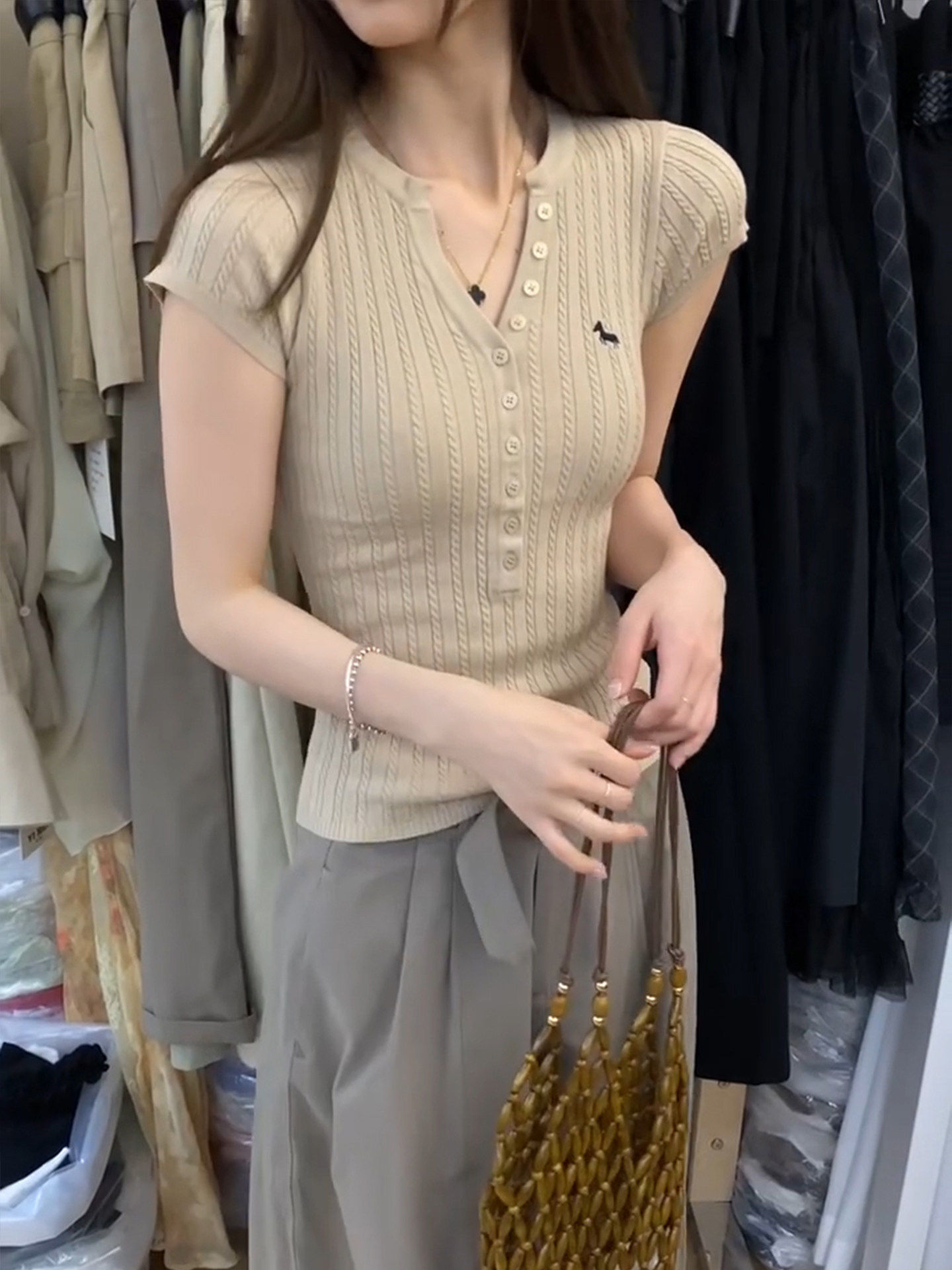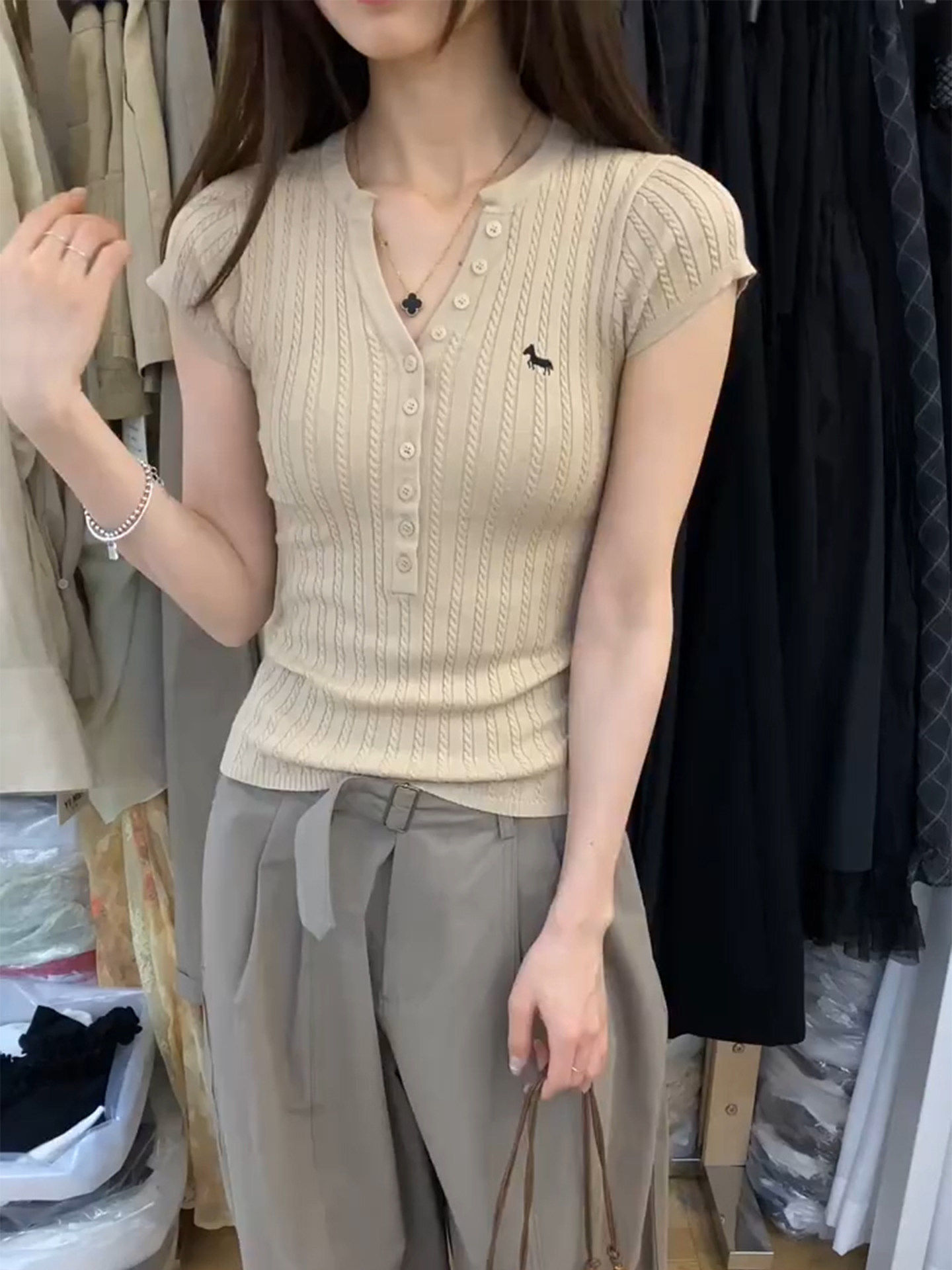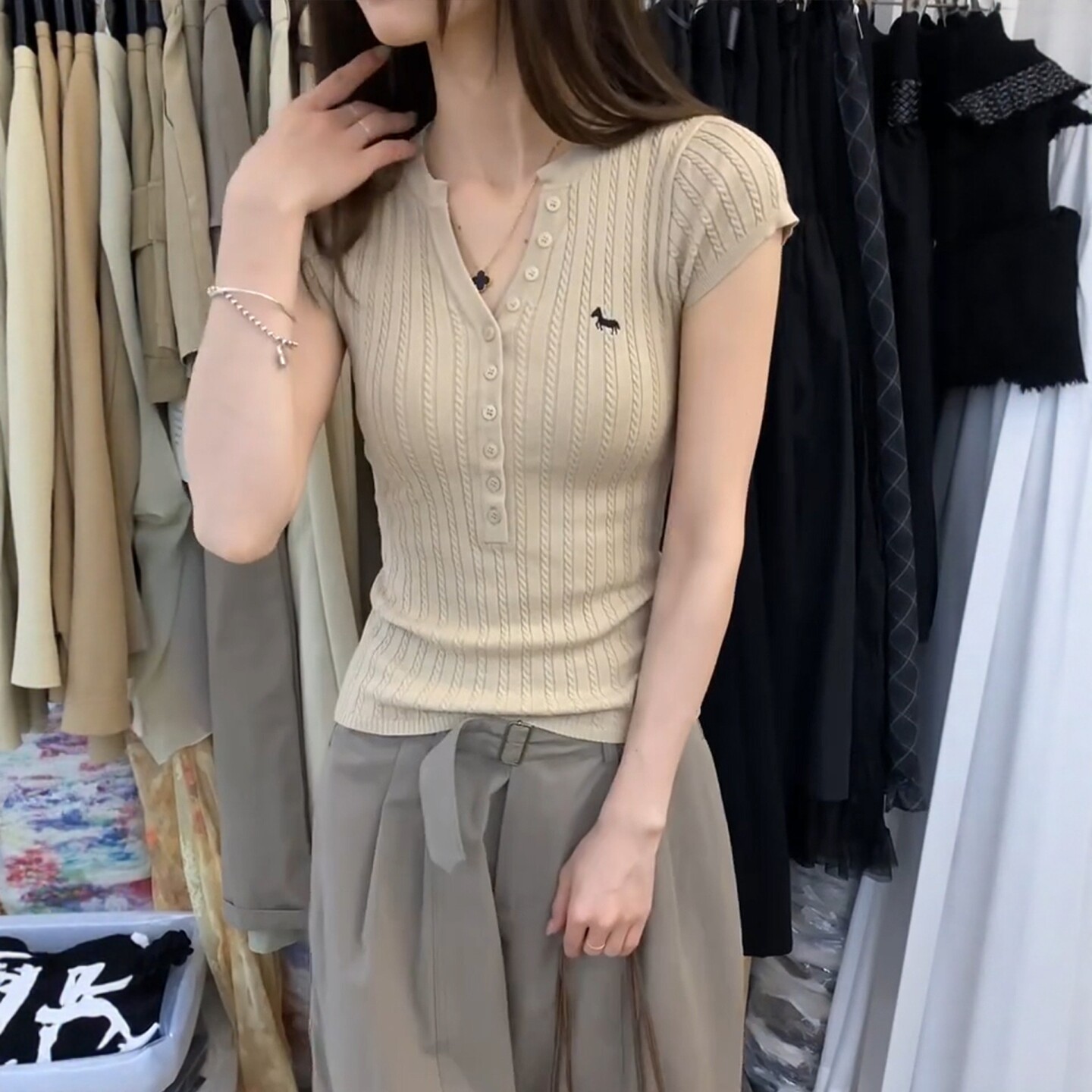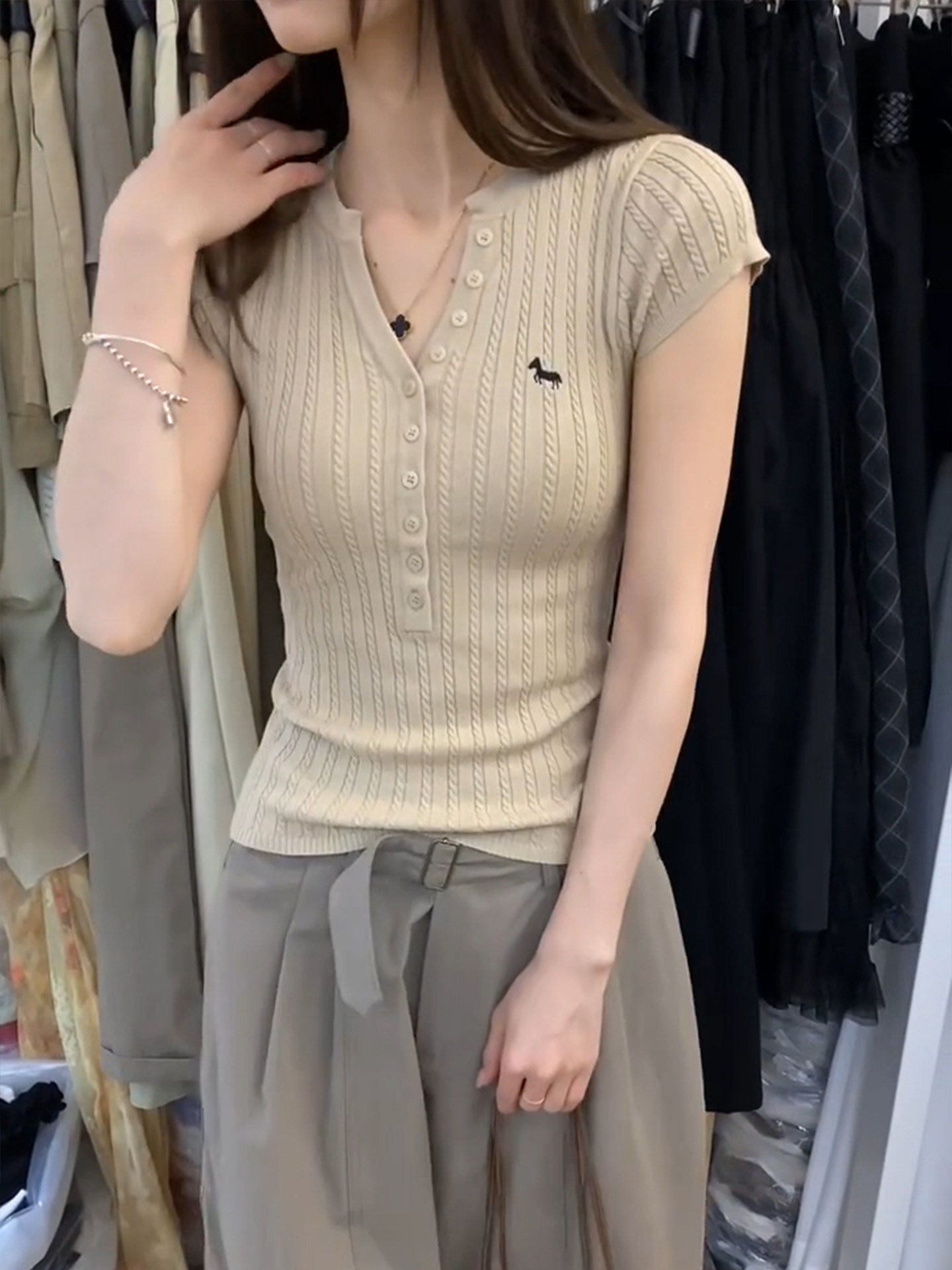 있음 도착 자수 V넥 반팔 니트 티셔츠 여성 여름 몸매 가꾸기 슬림해 보이는 핫걸 쇼트 스타일 긍정적 인 어깨 작은 맨위