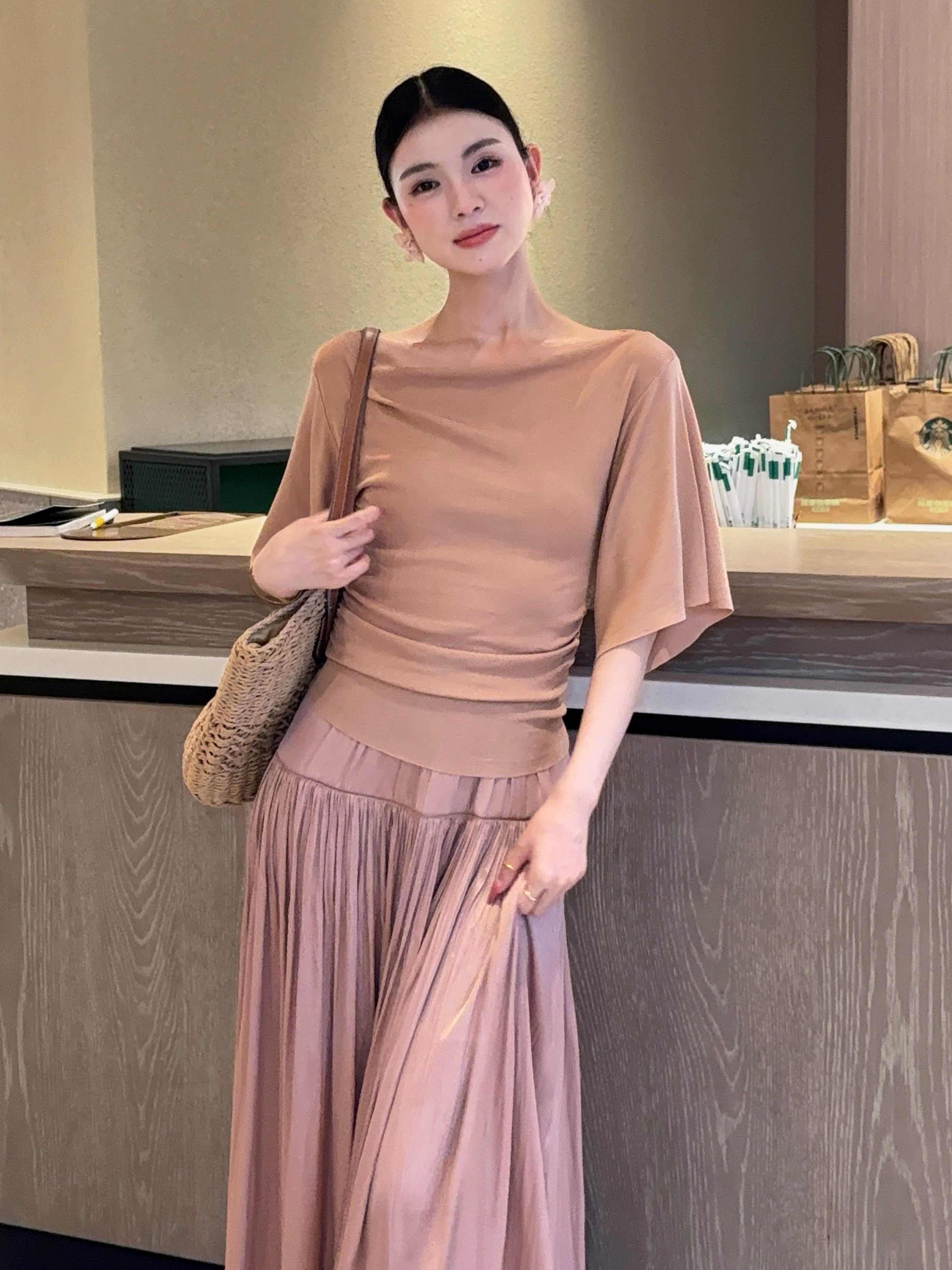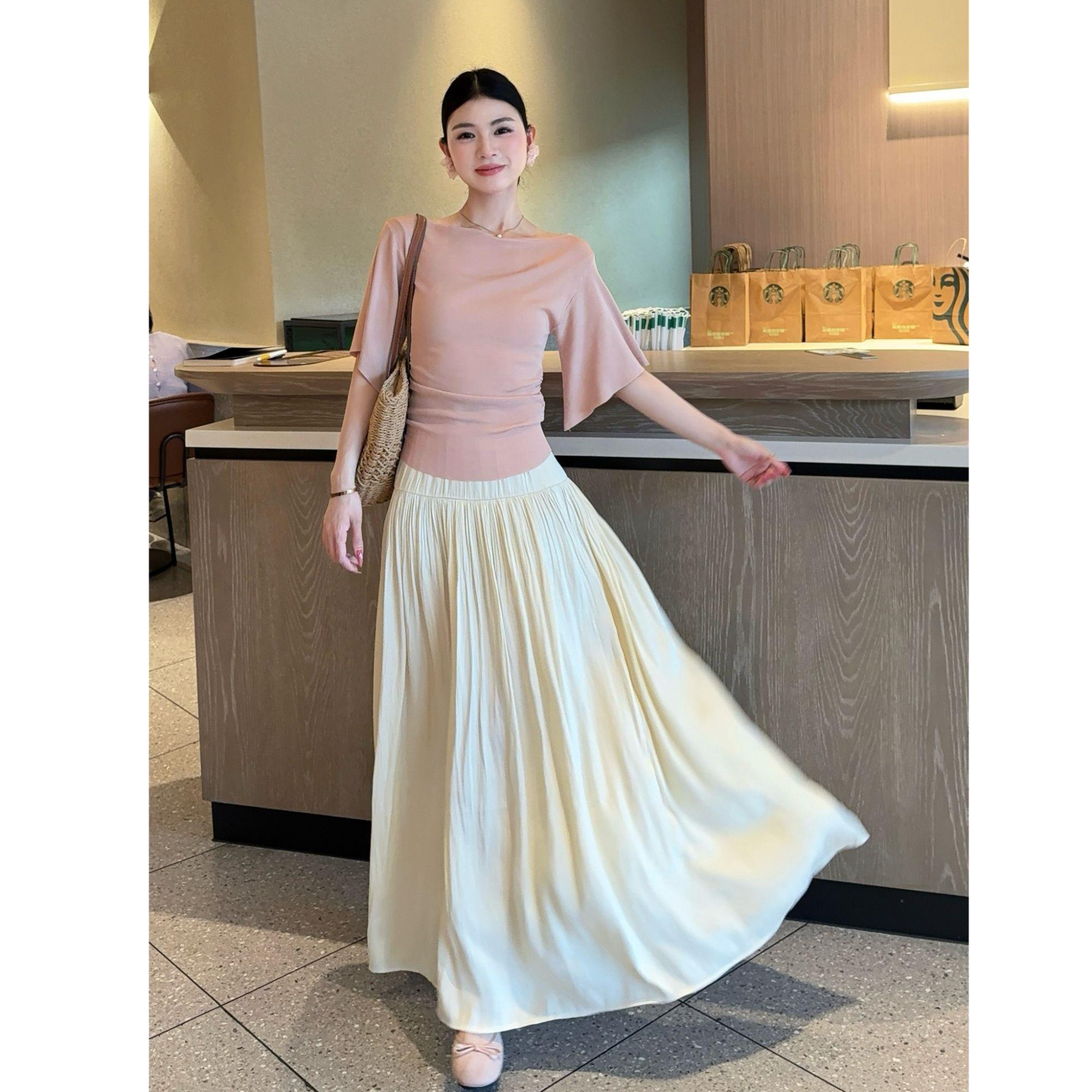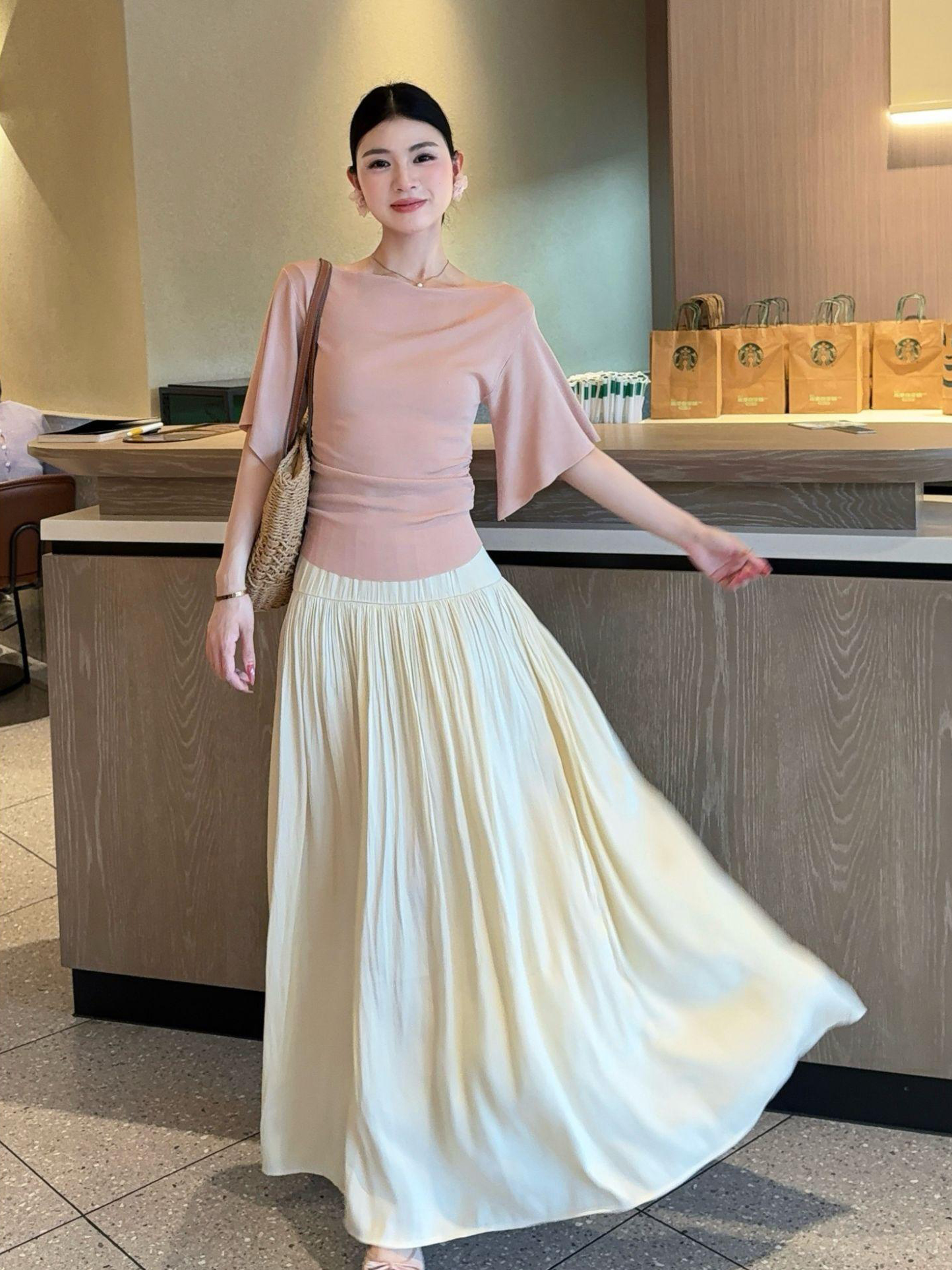 있음 도착 니트 반팔 부드러운 도루 센스 플리츠 롱 코트 루즈핏 요정 고대 조기 바람 여성 반신 치마 세트 여성