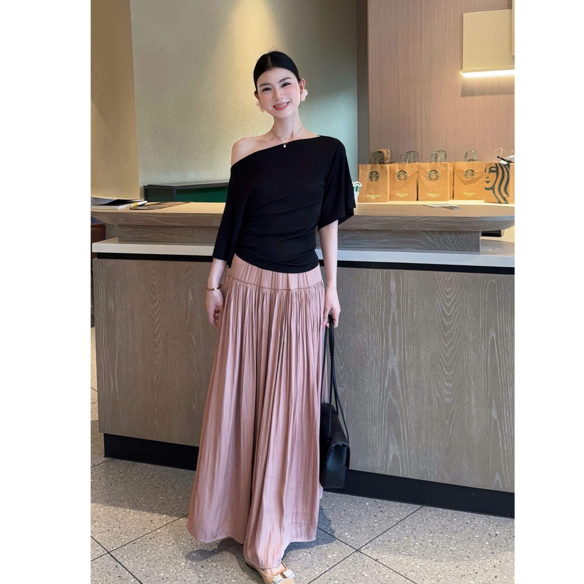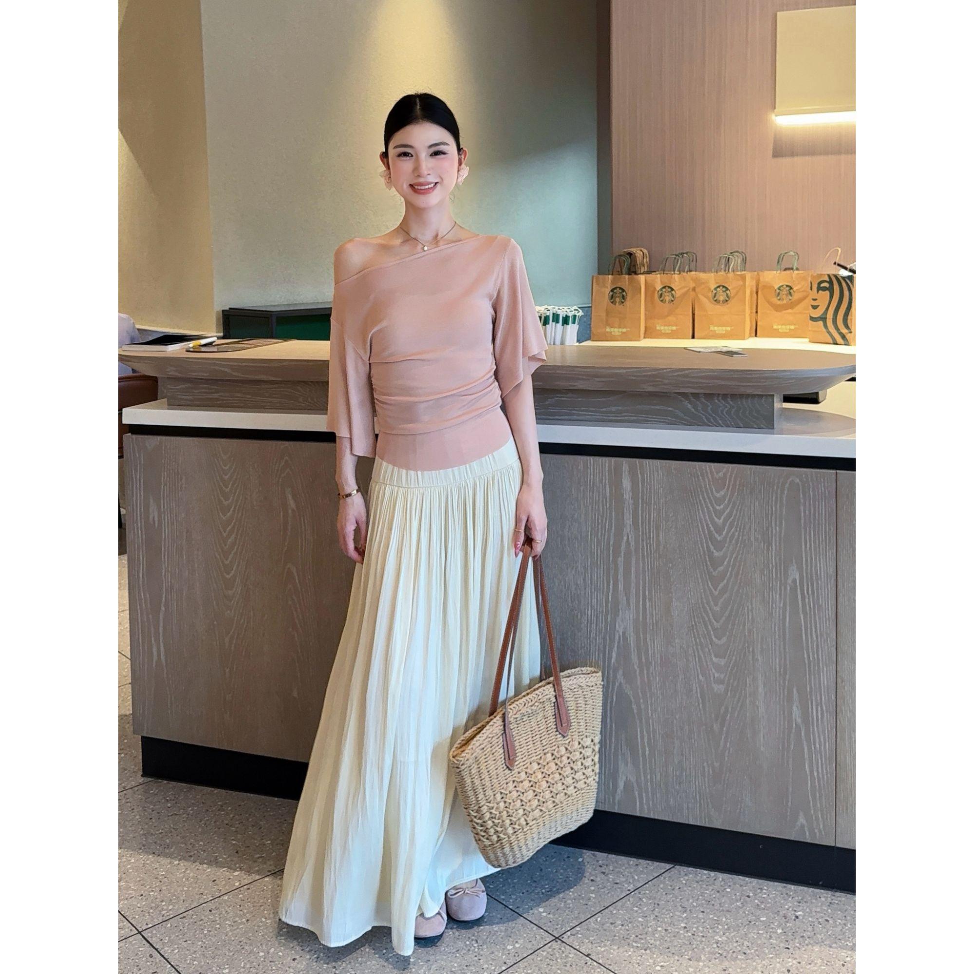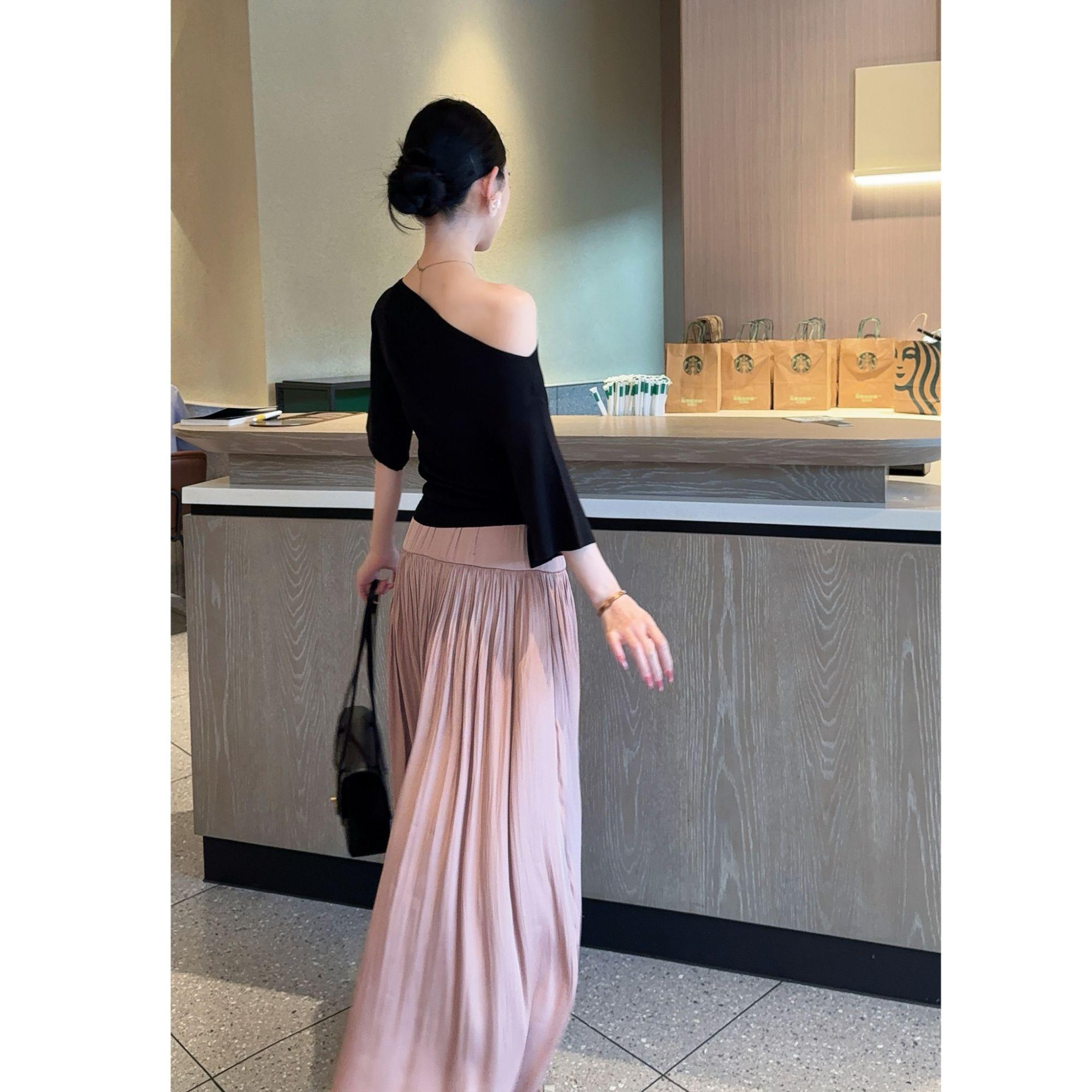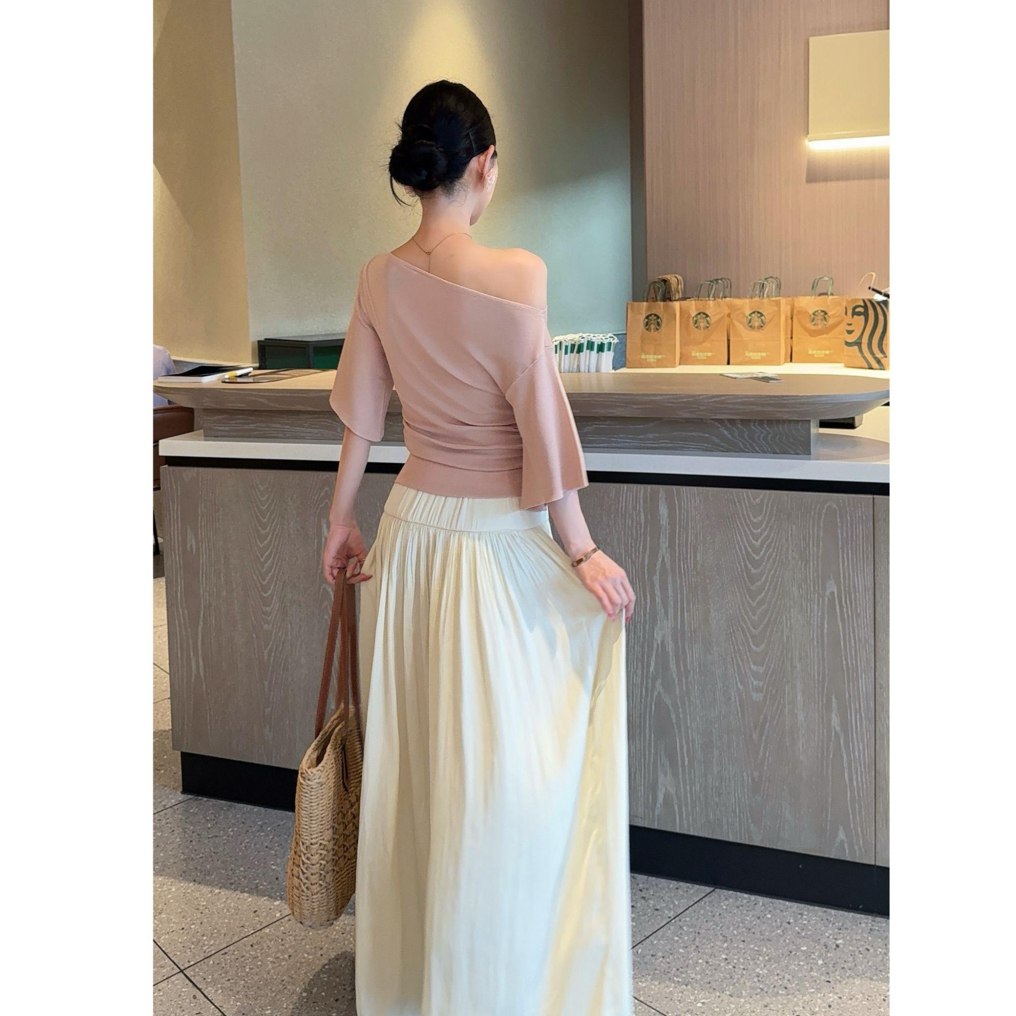있음 도착 오프숄더 니트 맨위 반팔 디자인 센스 쇼트 스타일 티셔츠 부드러운 패션 한 마디 반신 스커트 세트