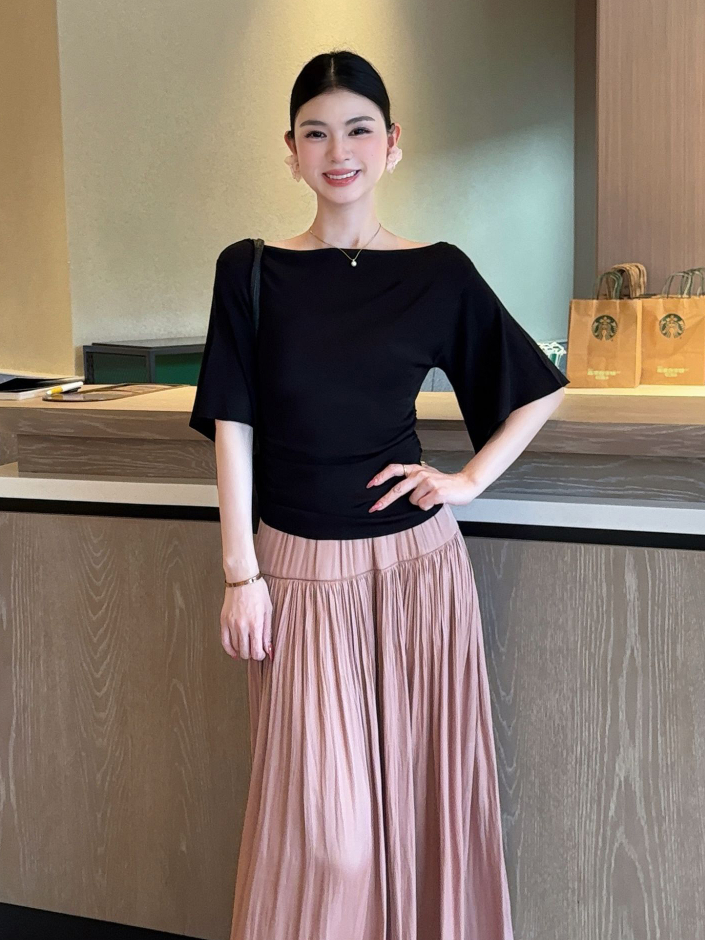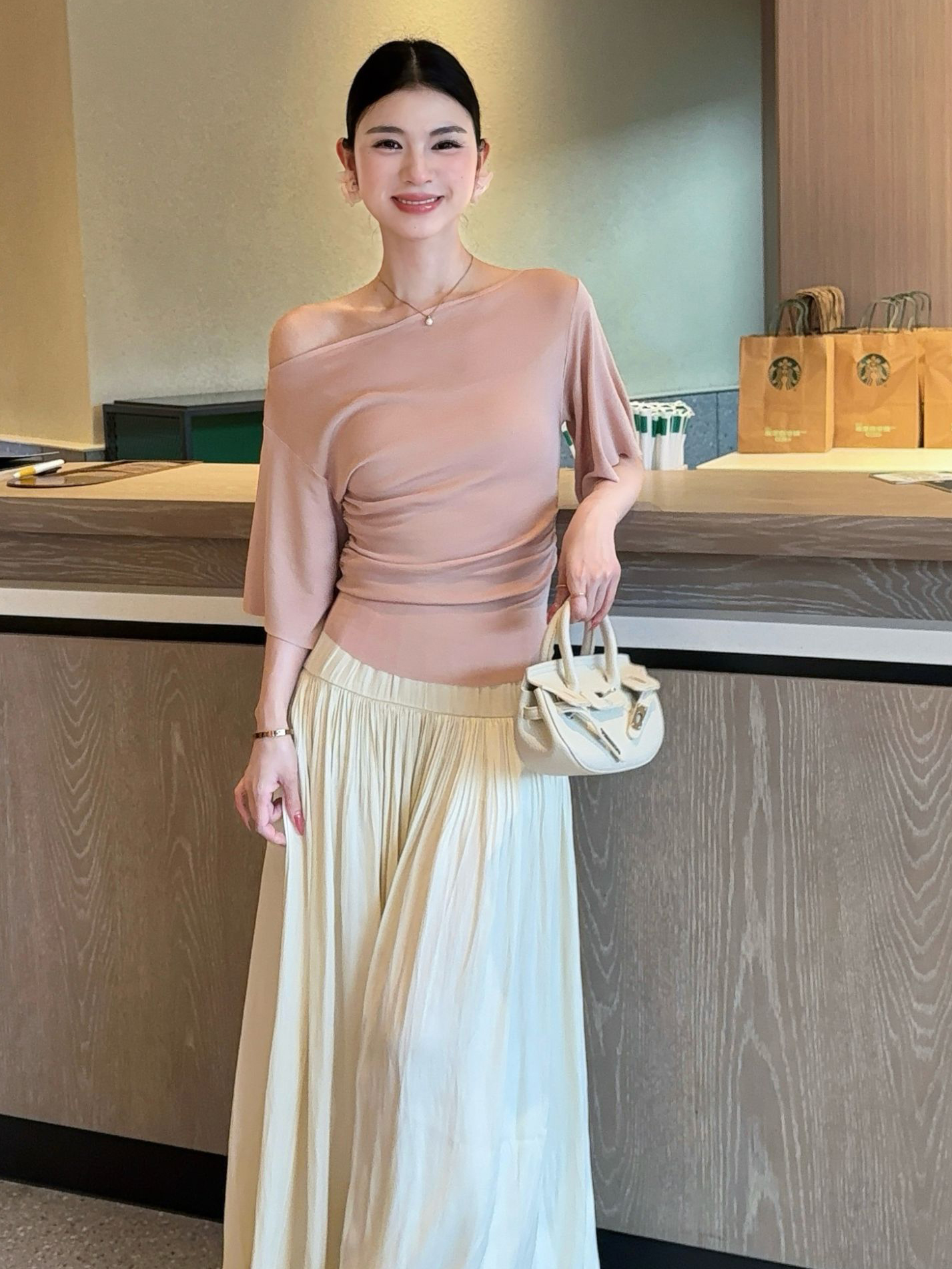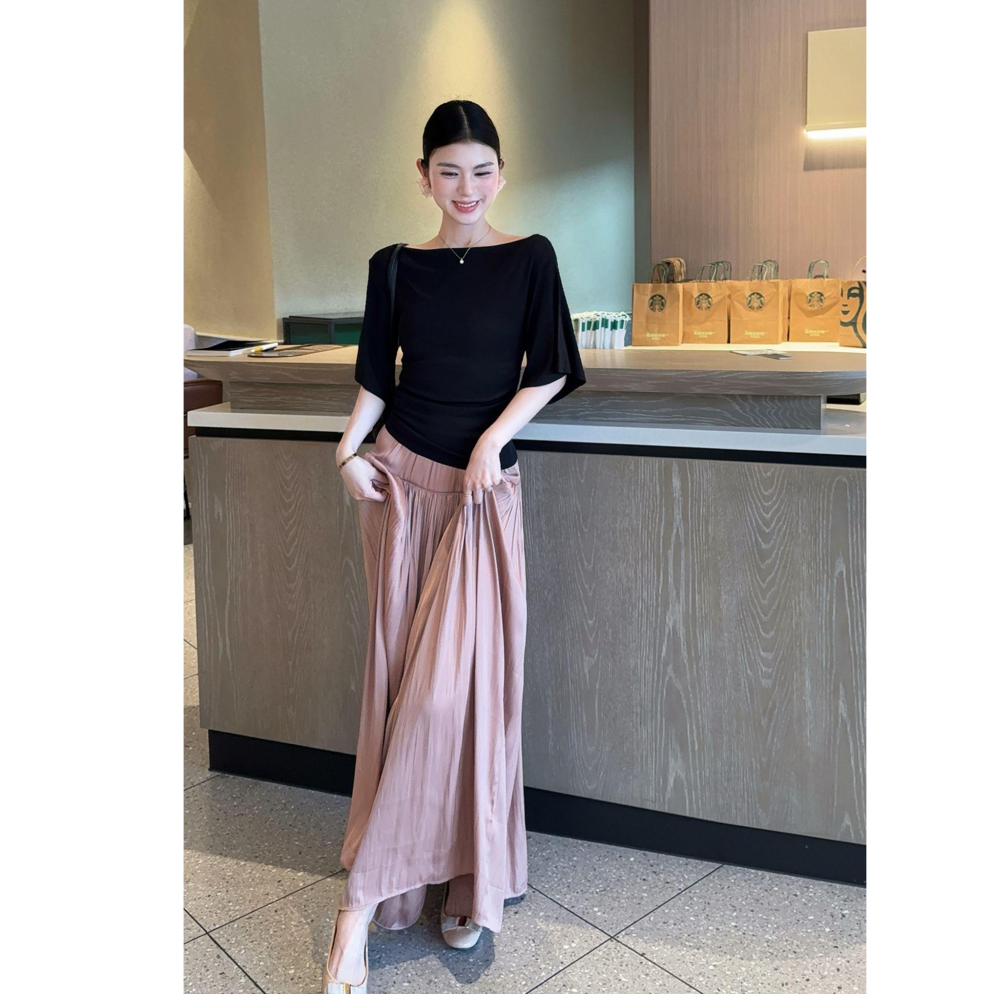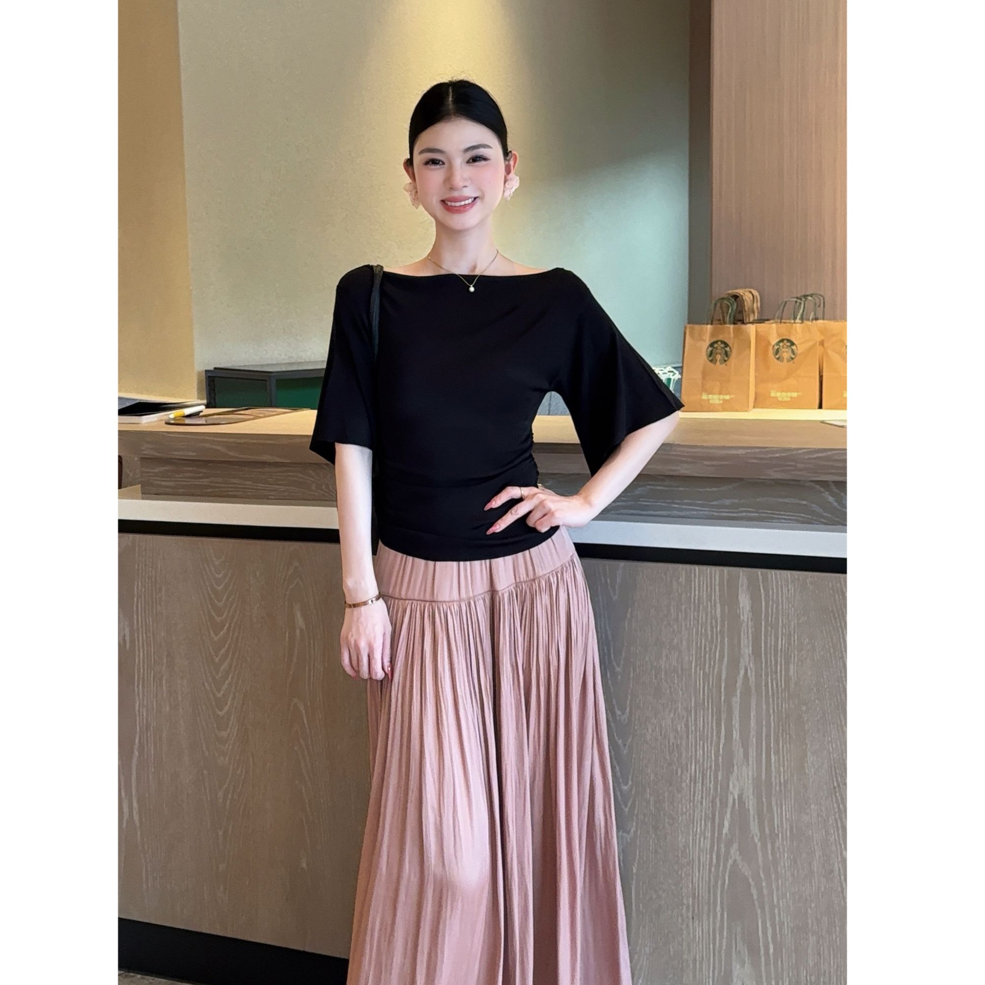 있음 도착 오프숄더 니트 맨위 반팔 디자인 센스 쇼트 스타일 티셔츠 부드러운 패션 한 마디 반신 스커트 세트